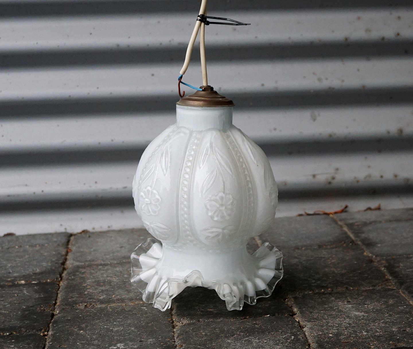 Hvid opal glas pendel, med flæser kant, der er klart overfangsglas på pendlen