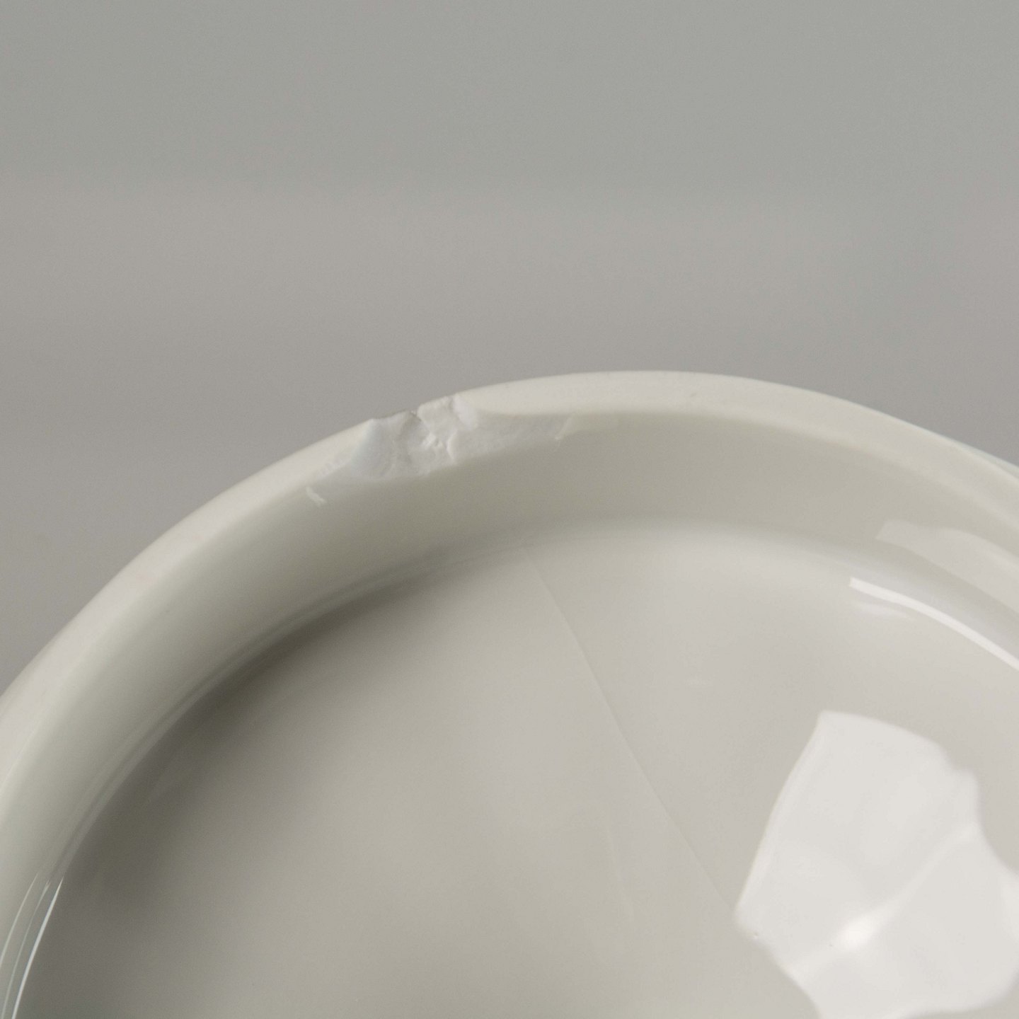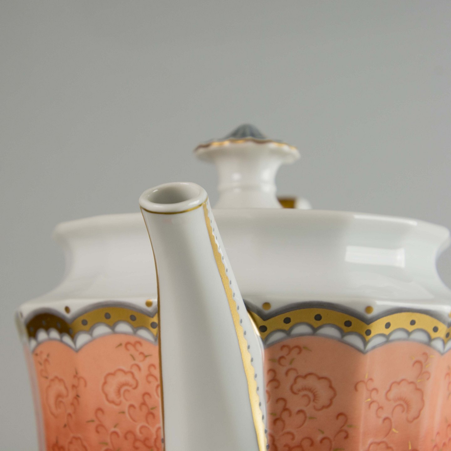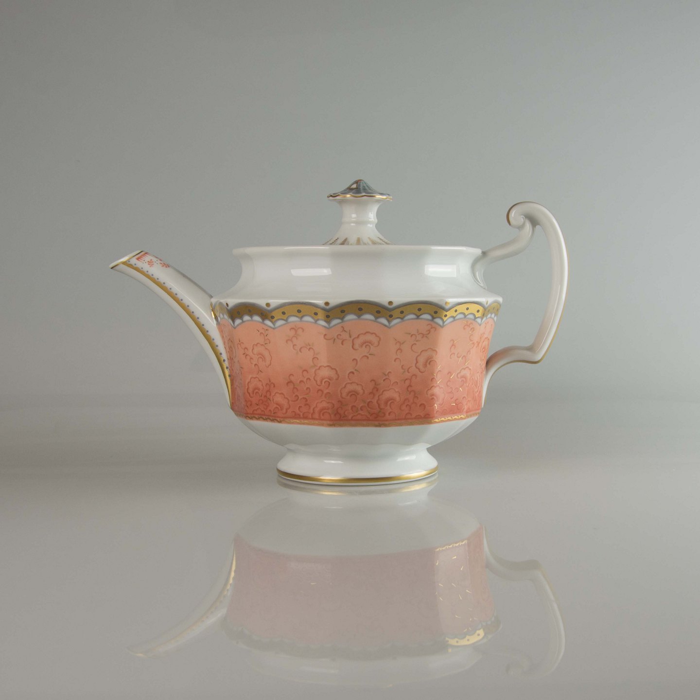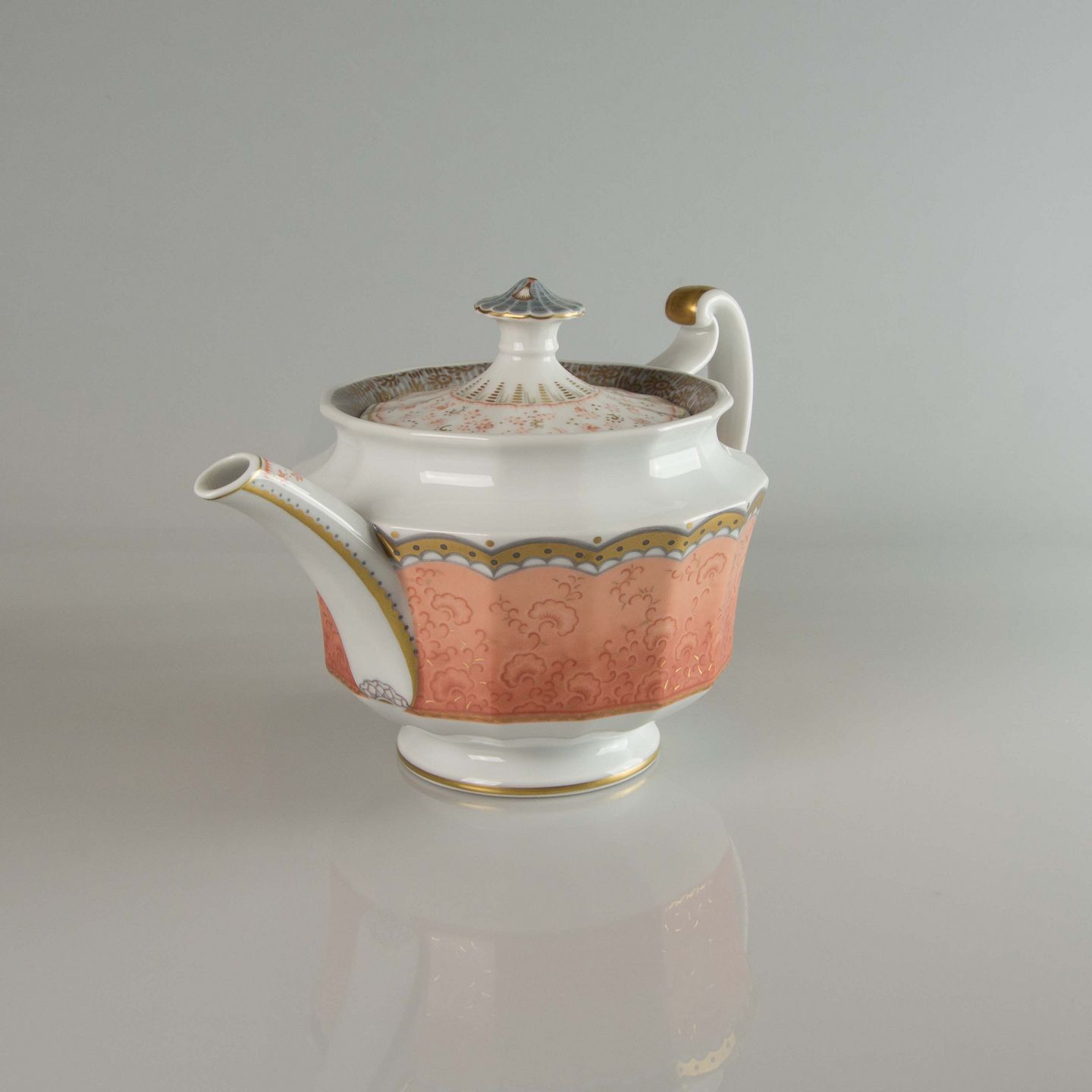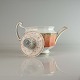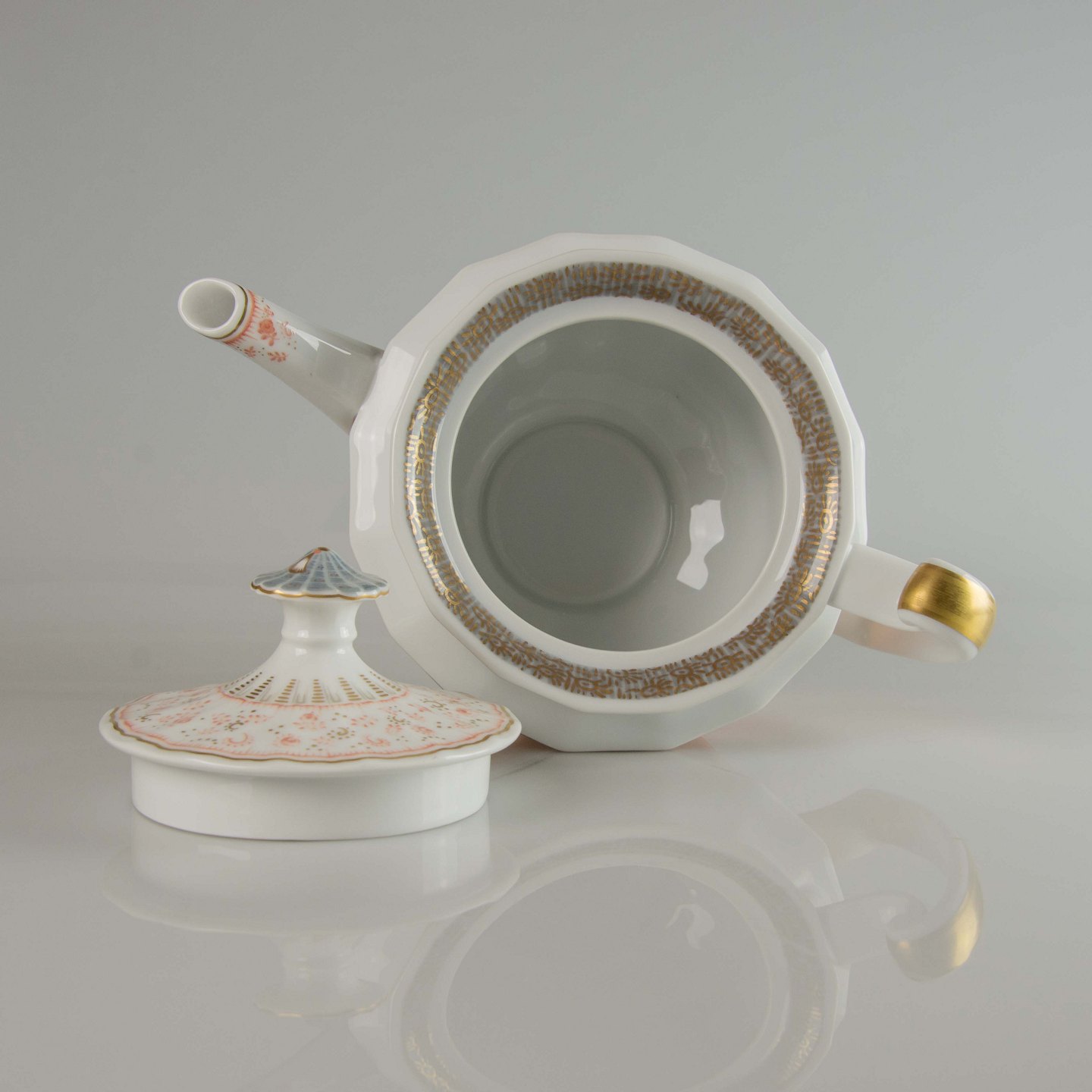 Kantet tepotte i porcelæn med gyldne mønstre.