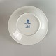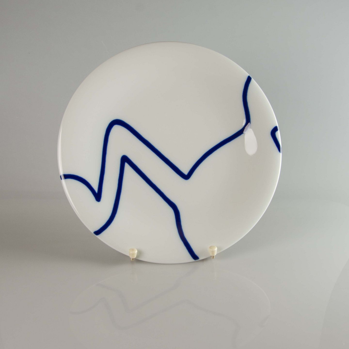 Tallerken i hvidt porcelæn dekoreret med nodefigur i blå streg.