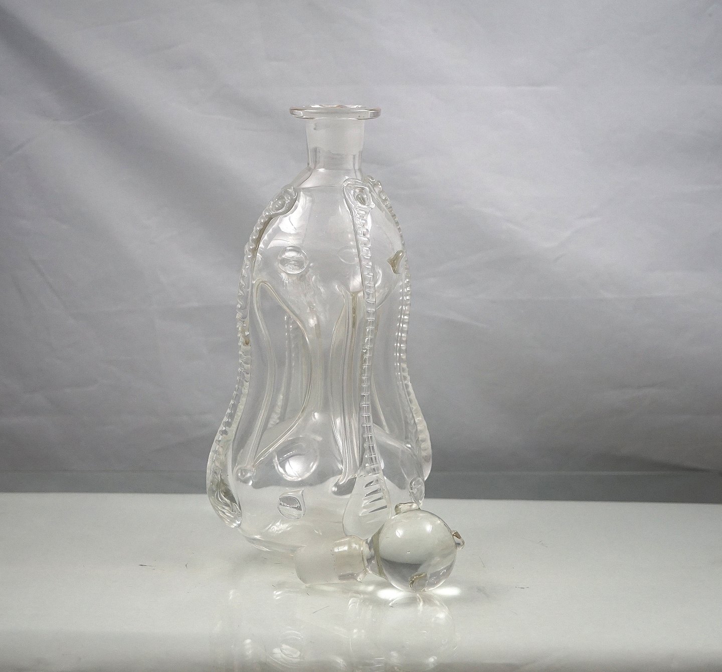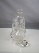 Holmgaard Glasværk. Kluk flasken er oftest firkantet med indsugede sider, hals med udsvajet rand, indboret for prop. Denne flaske svajer lidt i toppen og er dekoreret med rigler og rosetter
