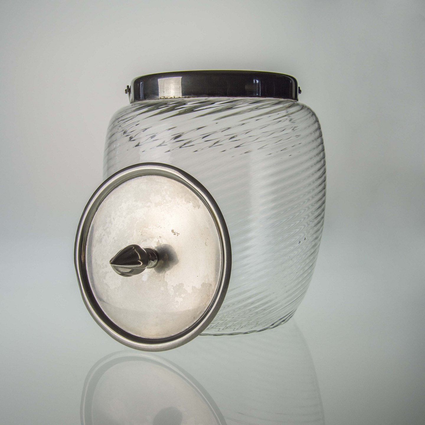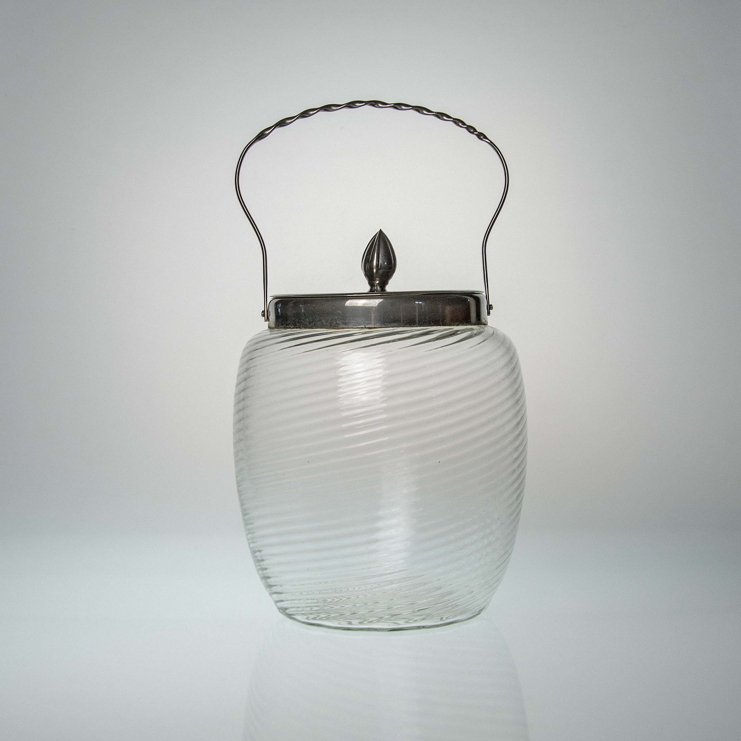 Kiksespand i rillet glas med metal låg og hank model nr. 2147
