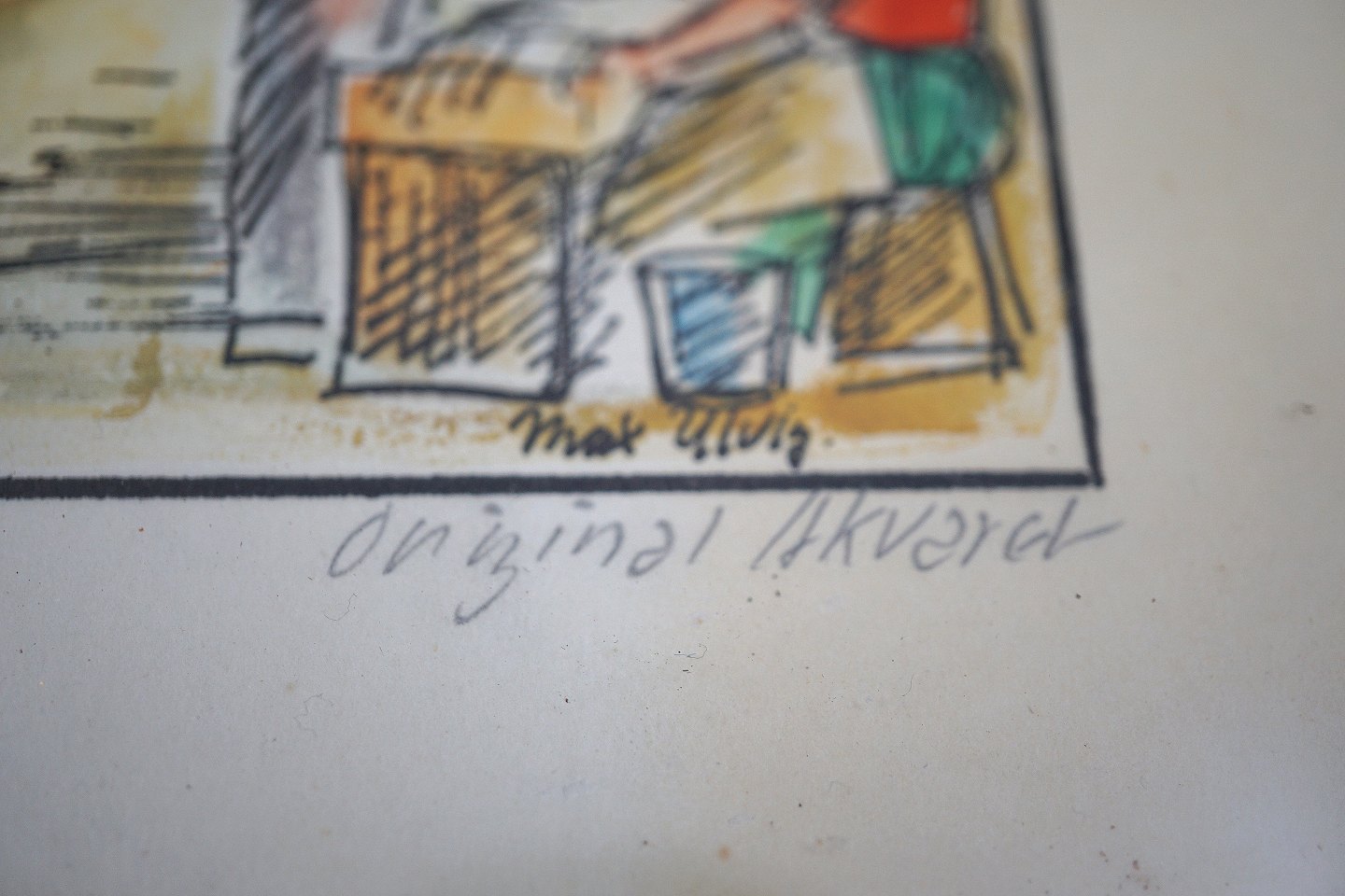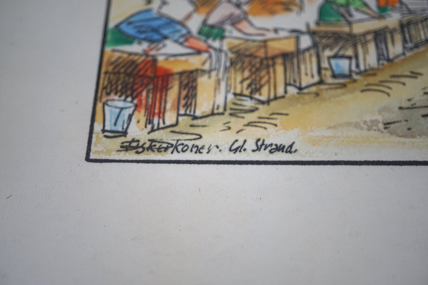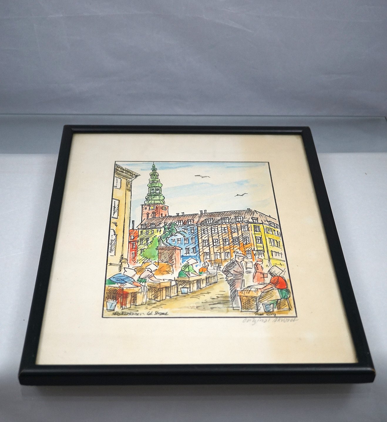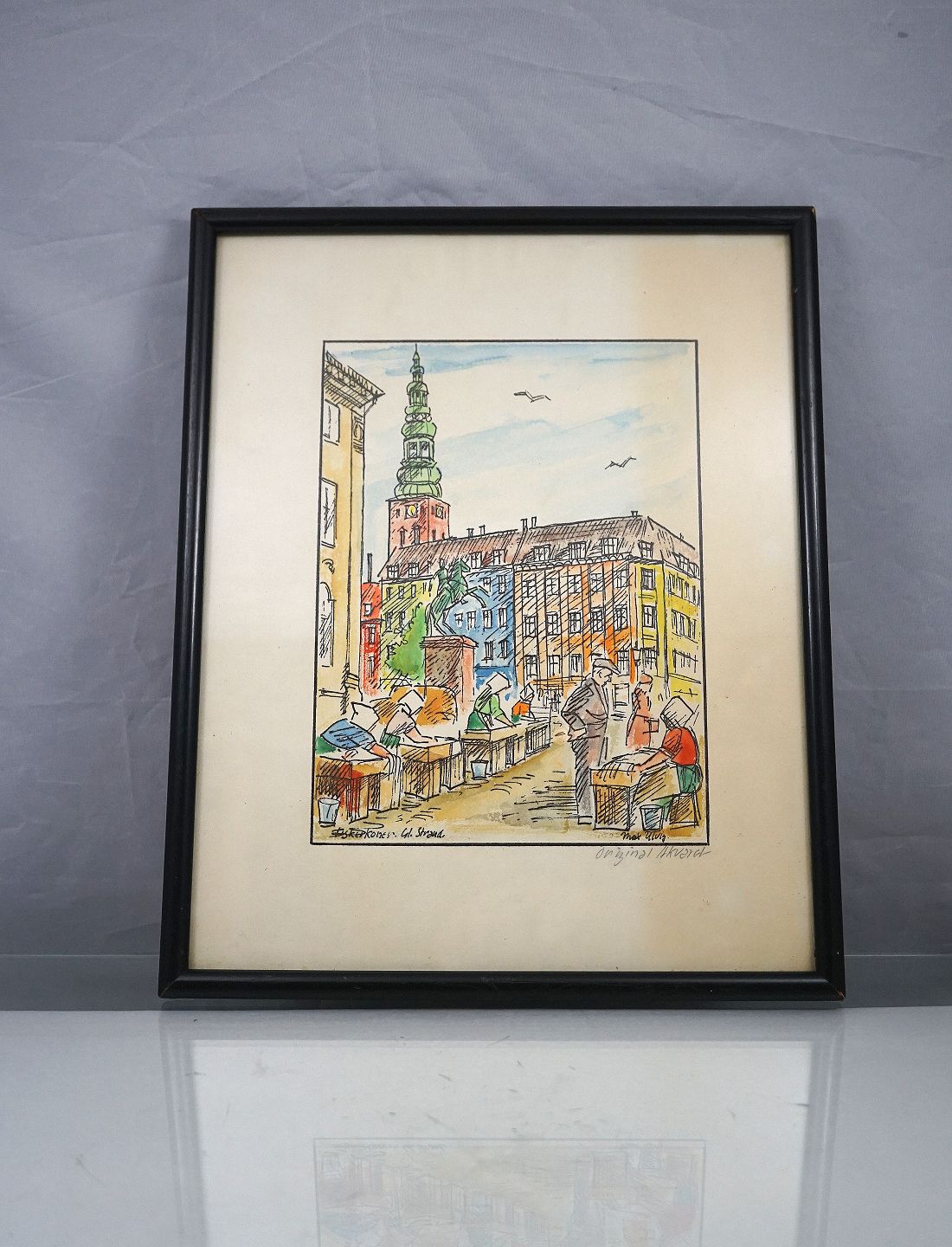 Max Ulvig. Fiskerkoner ved Gammel Strand. Billedet er en original akvarel der er tegnet op med tusch. Max Ulvig født i 1913 - død i 1969.