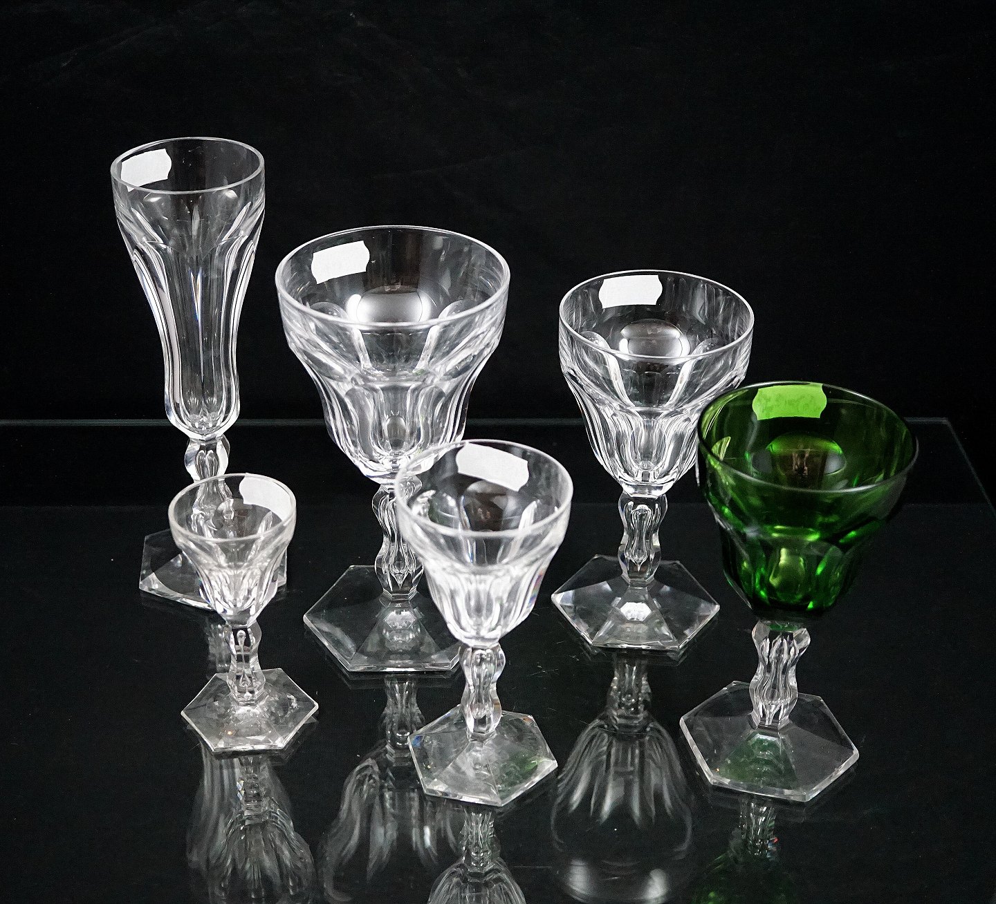 Store indad svajet facetslibninger, på facetslebet hul stilk med sekskantet planslebet fod plade og kuglet fod bund, krystalglas.