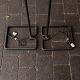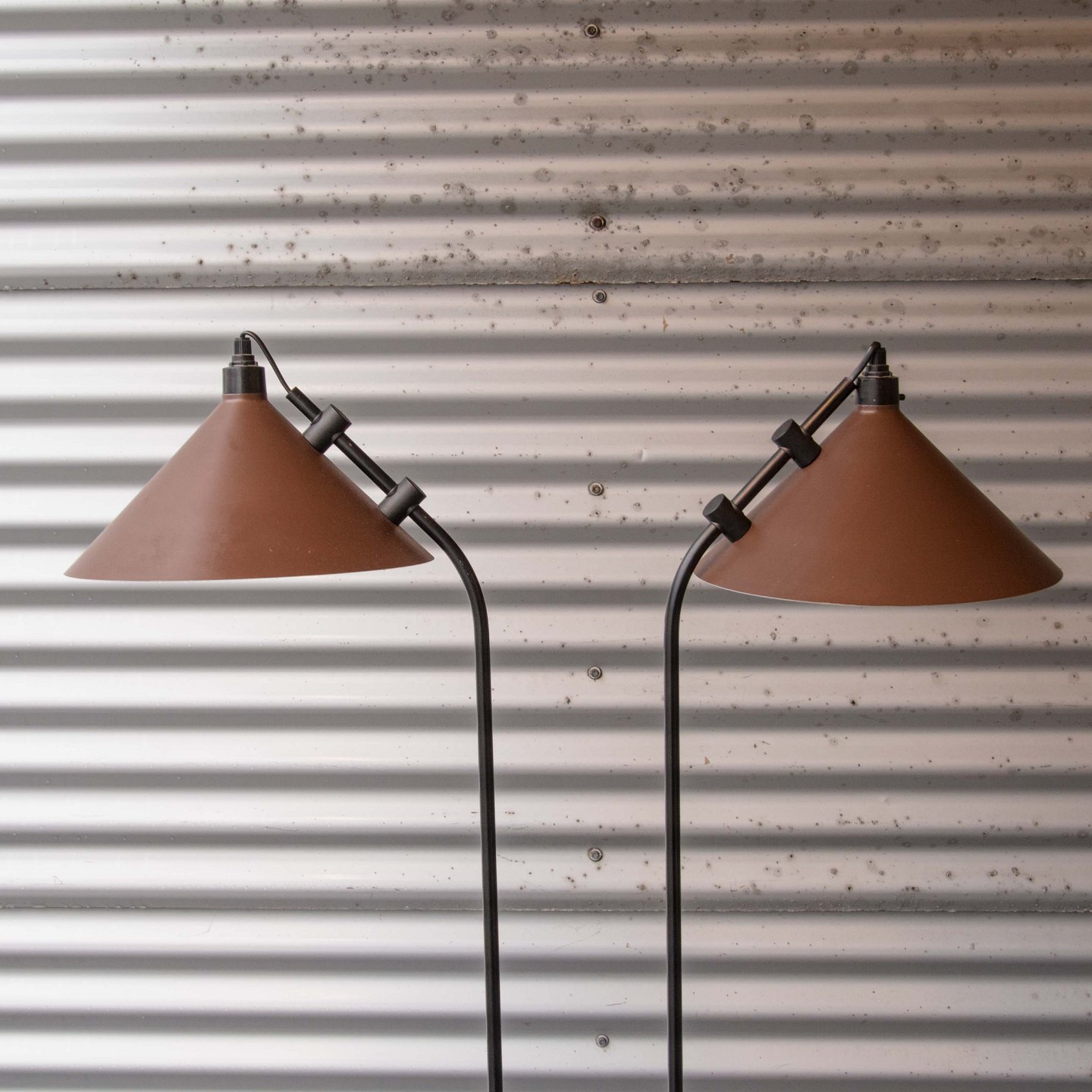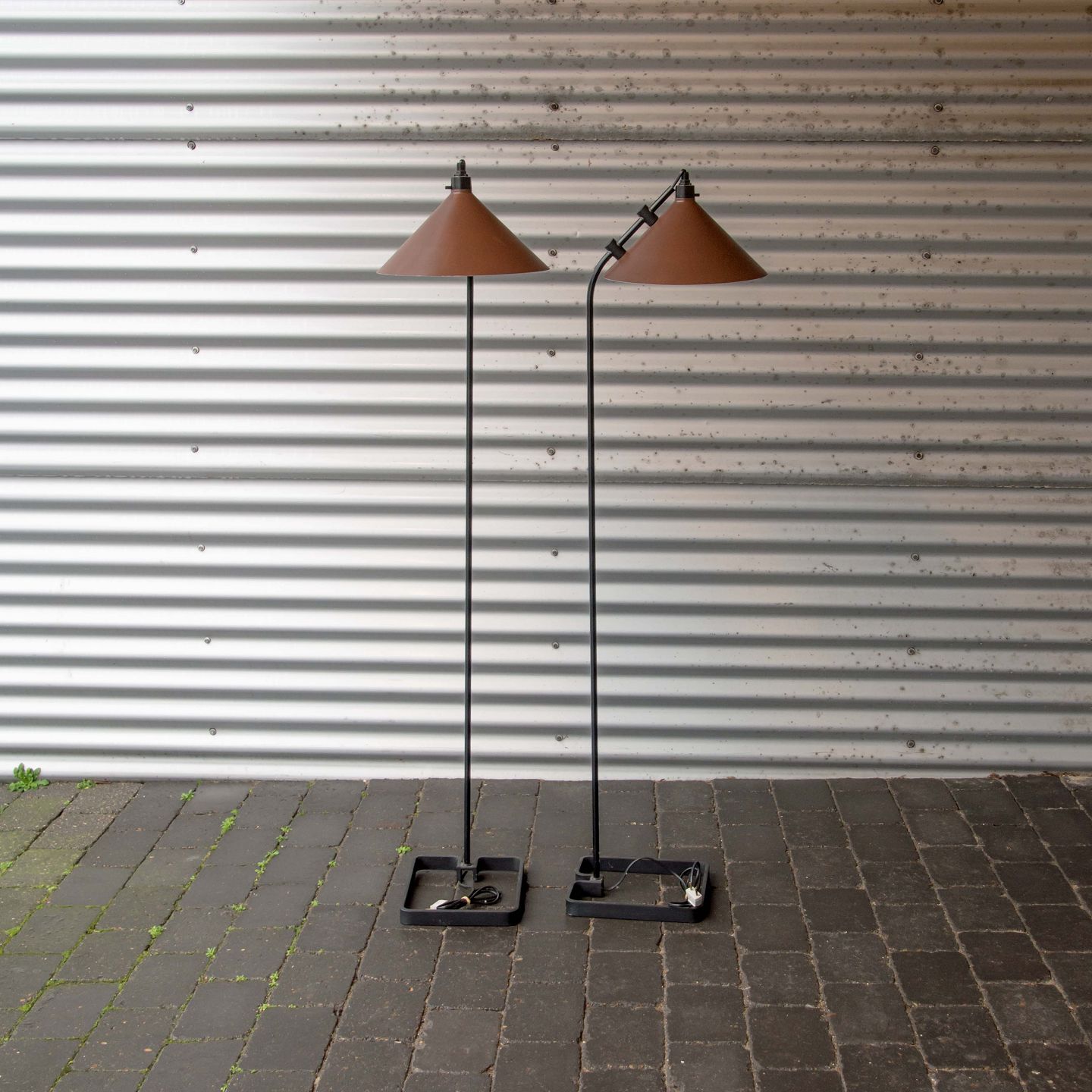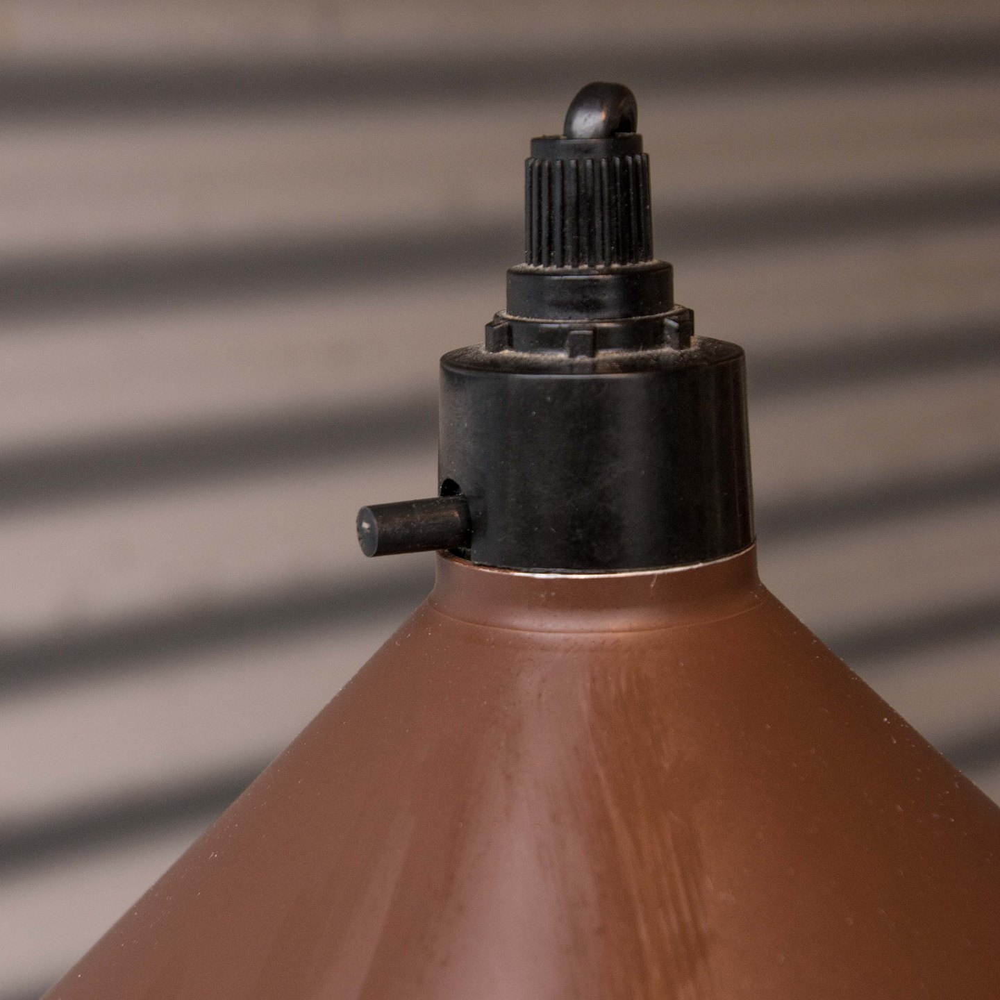 Brunlakeret aluminiumskærm på sortlakeret metalfod. Lamperne tændes i toppen.