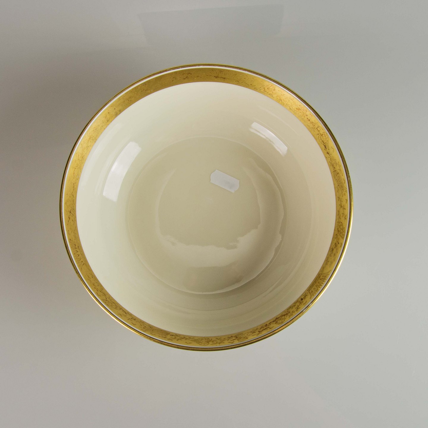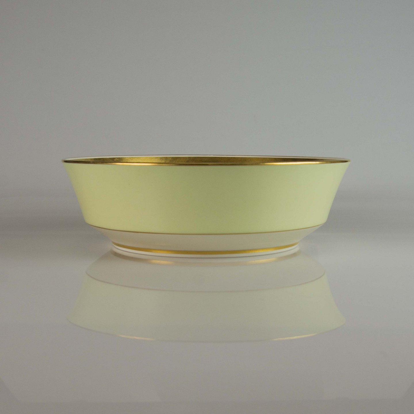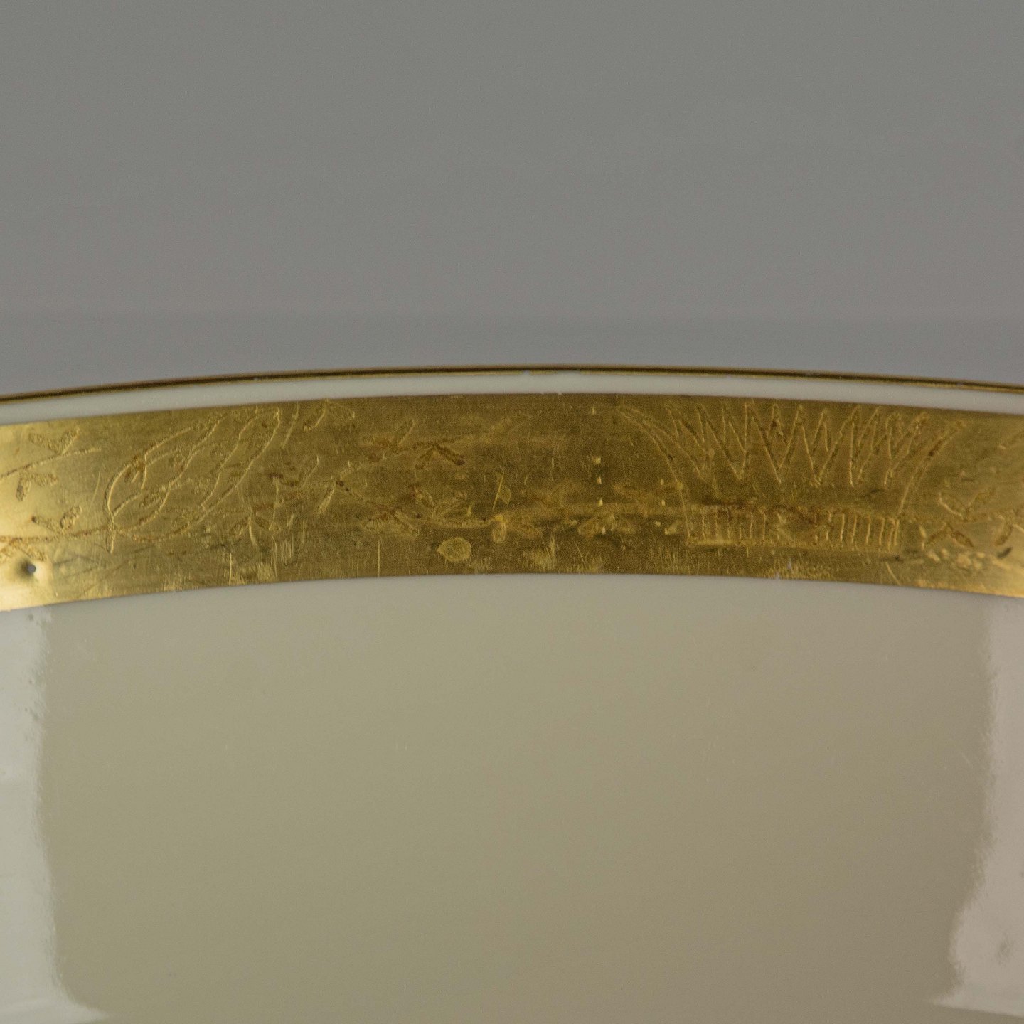 Skål i lys grøn og hvid porcelæn med gylden bort med motiv af krone og plantemotiver.