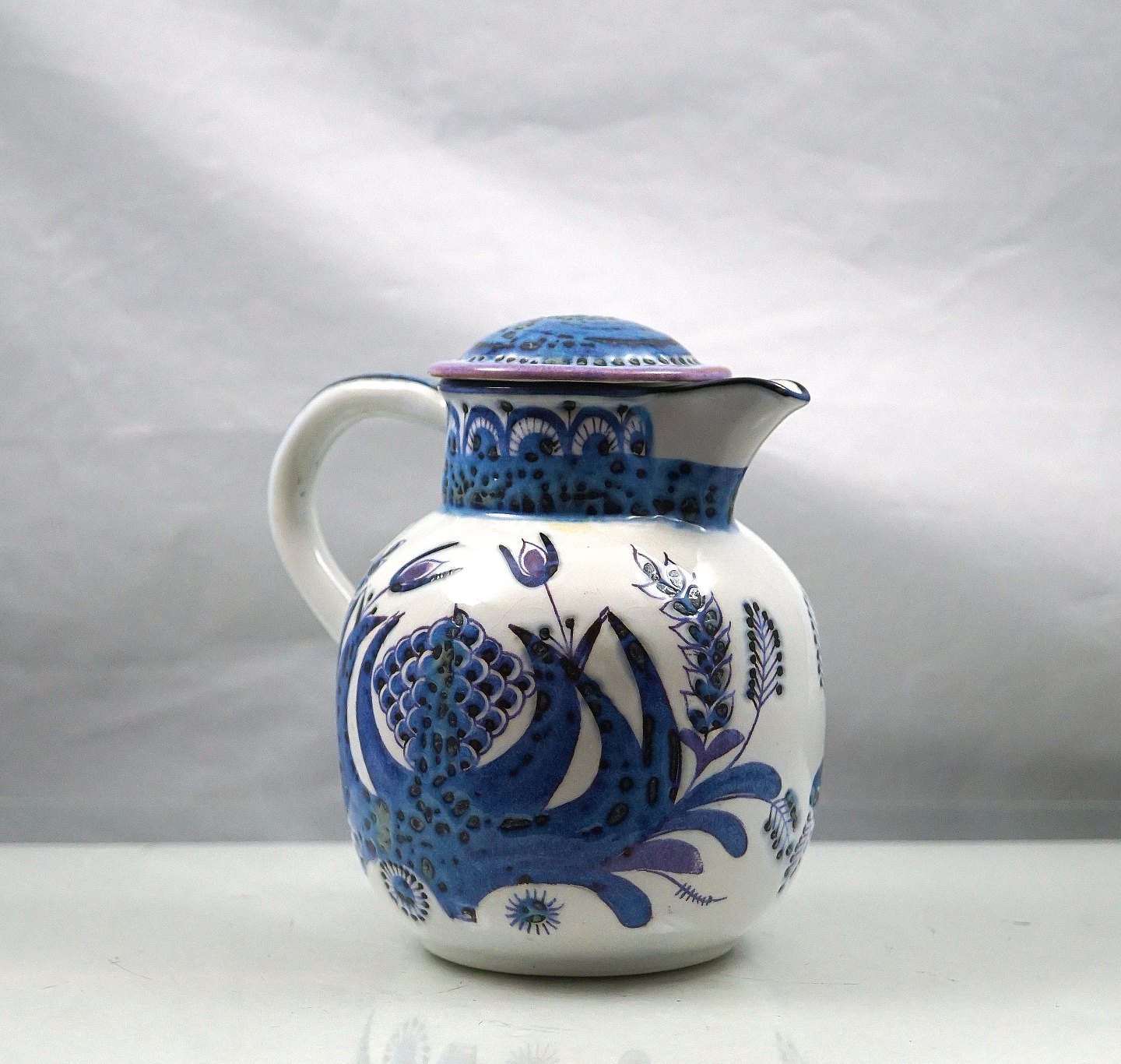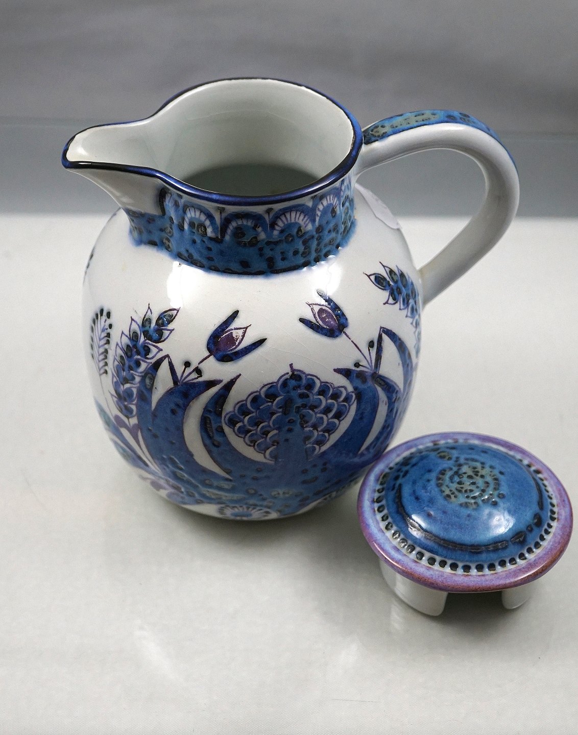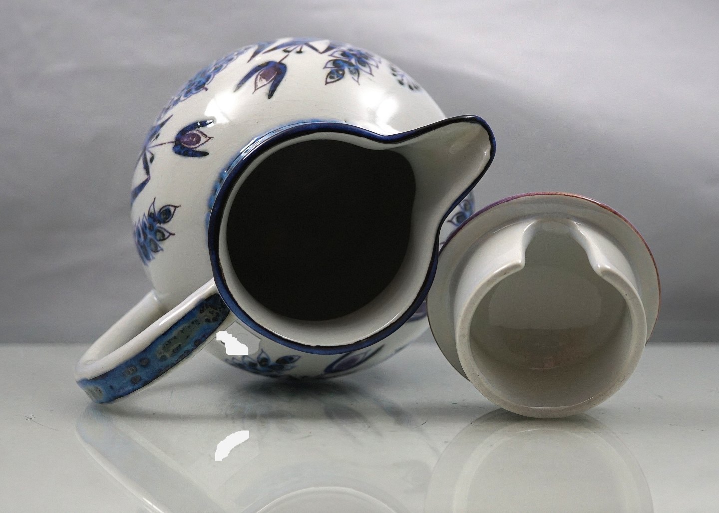 Royal Copenhagen Aluminia. Tenera kande, nr. 434/3143. Kande med låg, dekoreret med blå/lilla blomst og blade. kanden er fajance og 1. sortering