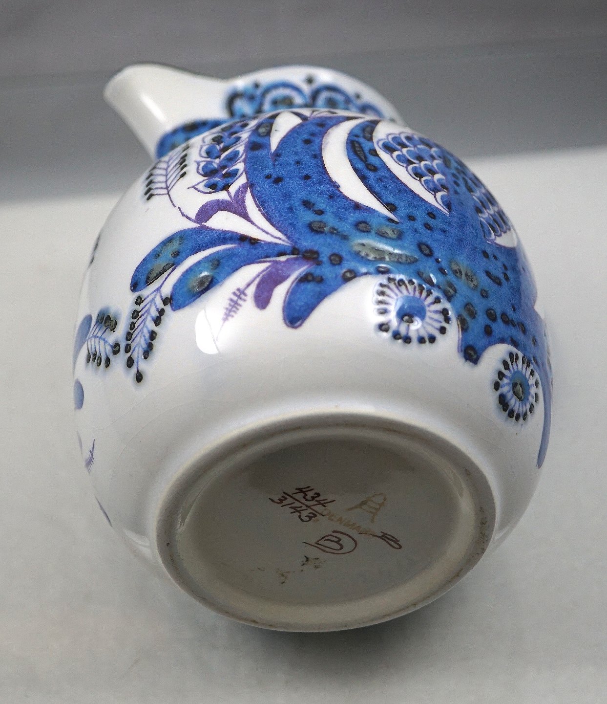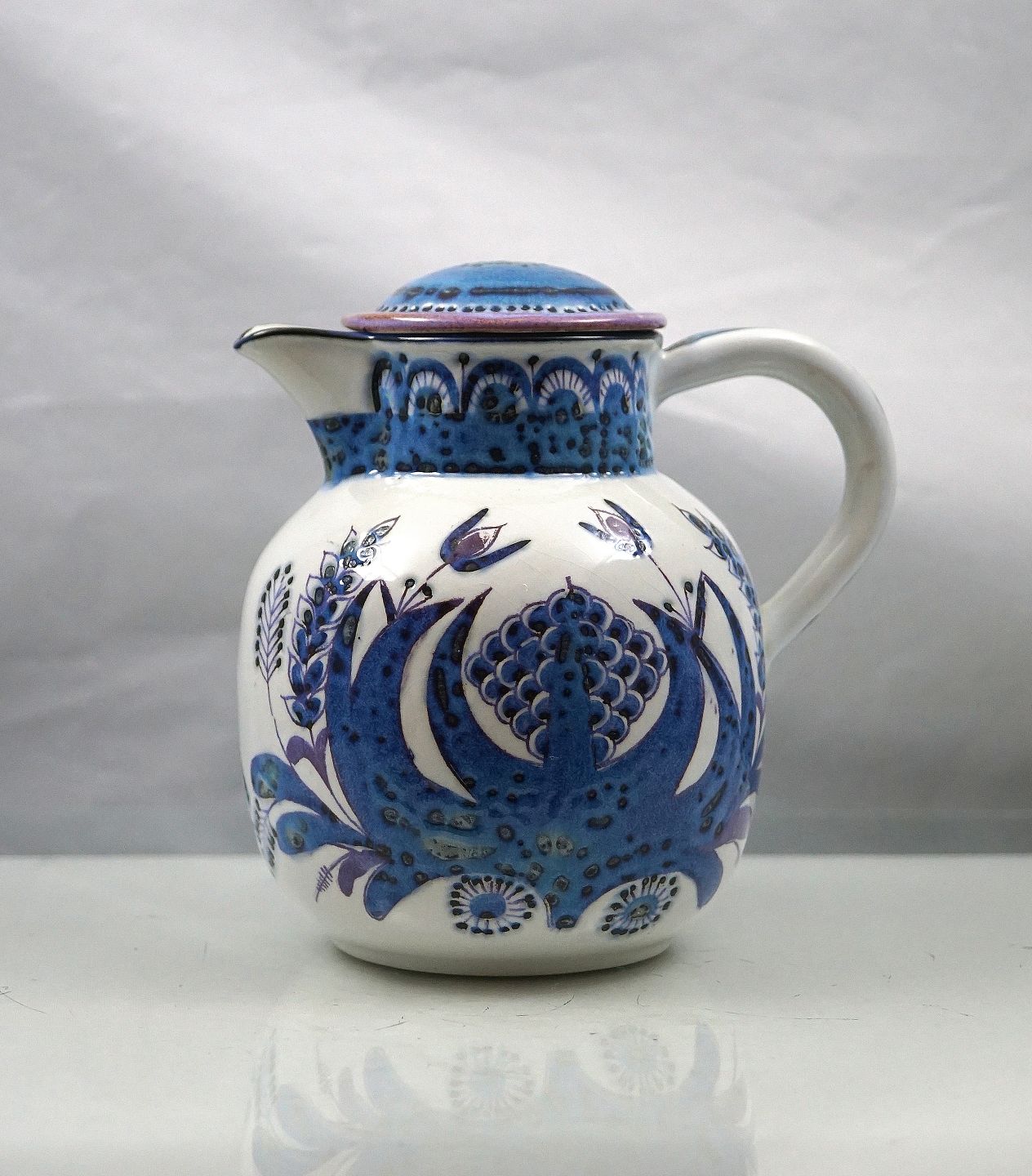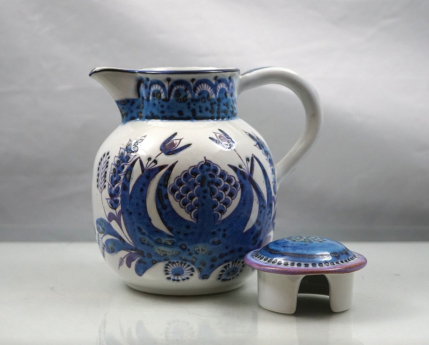 Royal Copenhagen Aluminia. Tenera kande, nr. 434/3143. Kande med låg, dekoreret med blå/lilla blomst og blade. kanden er fajance og 1. sortering