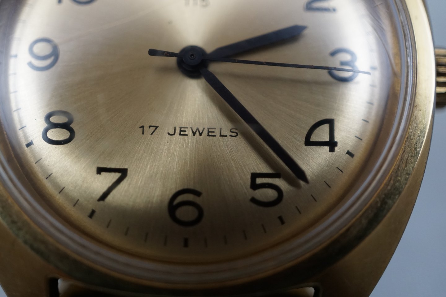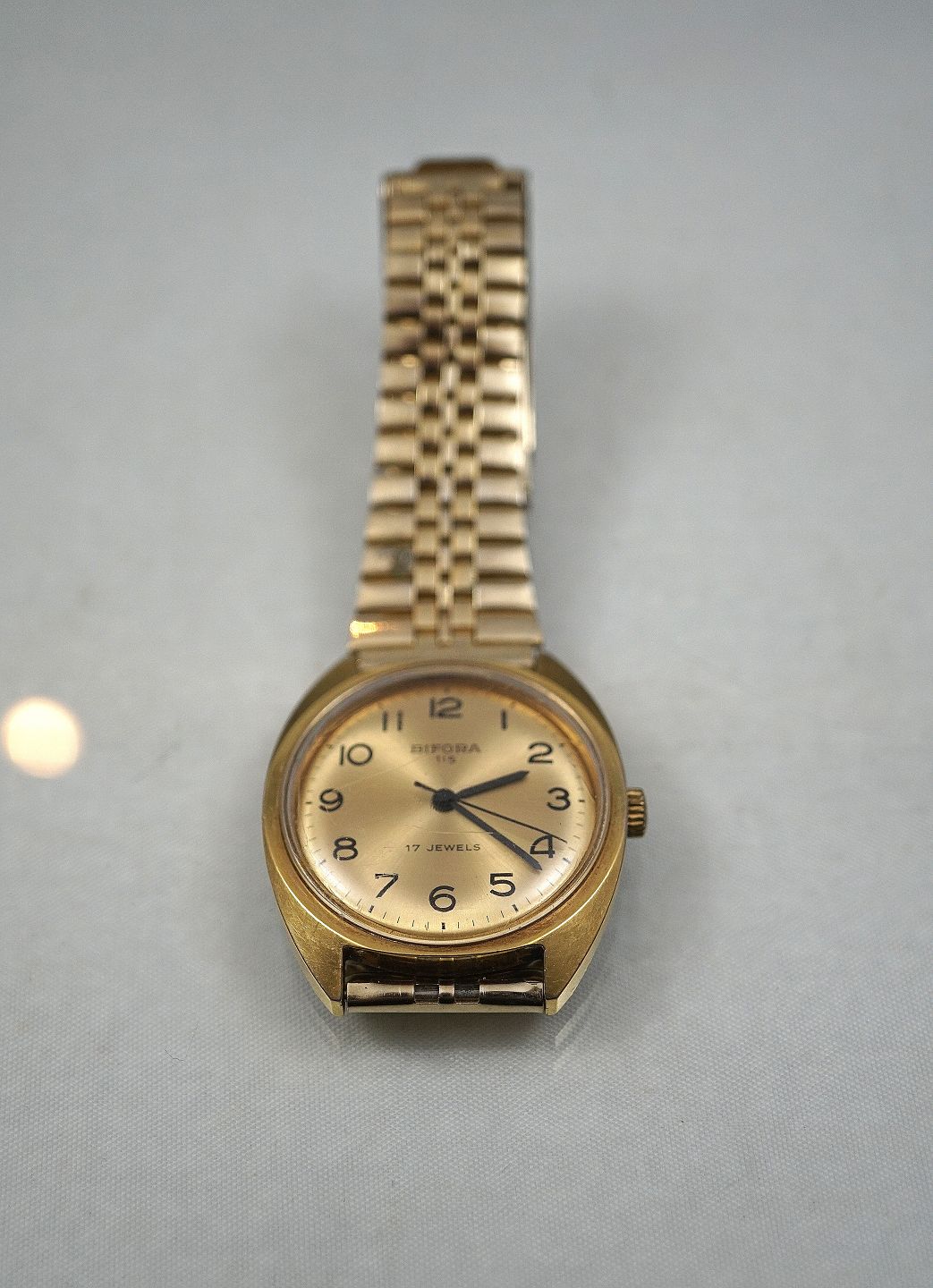 Bifora 115, armbåndsur, 17 Jewels. Uret er med opdrag og forgyldt. Kæden kan reguleres i omkreds