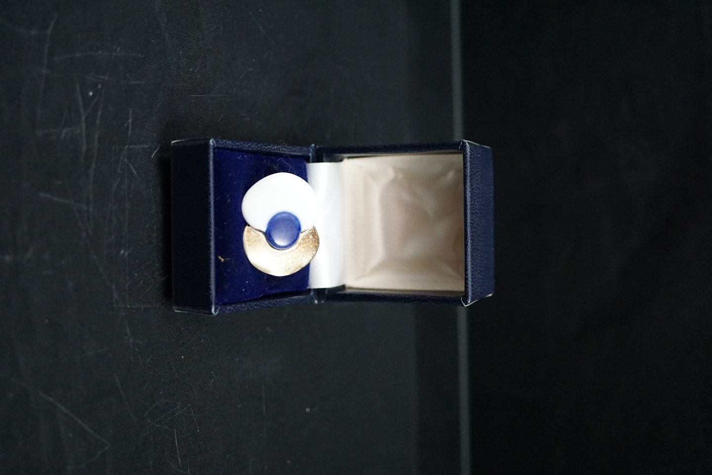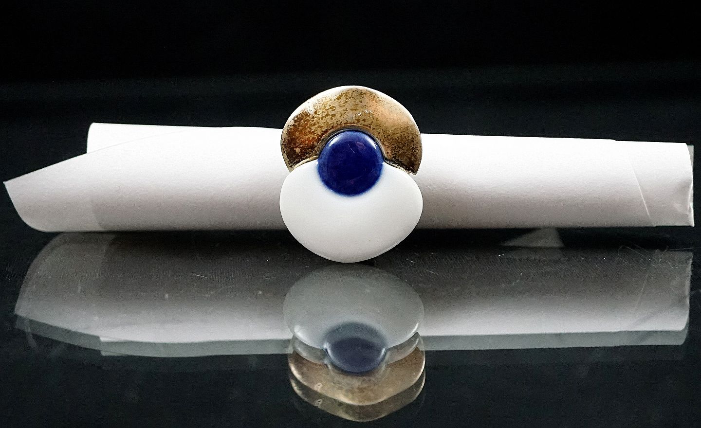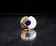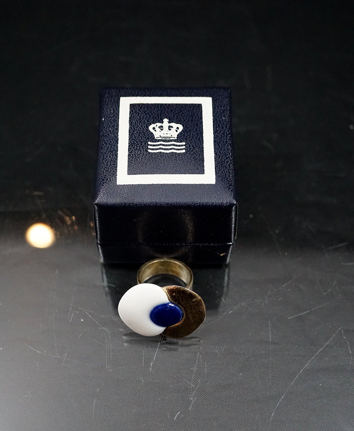Royal Copenhagen. Ring af sterling sølv, prydet med hvidt og kongeblåt porcelæn. Designet til den "Royal Bini", udgaven af smykker, der blev produceret af Dansk sølv selskab Anton Michelsen for den keramiske gigant Royal Copenhagen i 1960'erne. Dette design af smykker blev solgt gennem Georg Jensens butik i København i slutningen af 1960'erne.