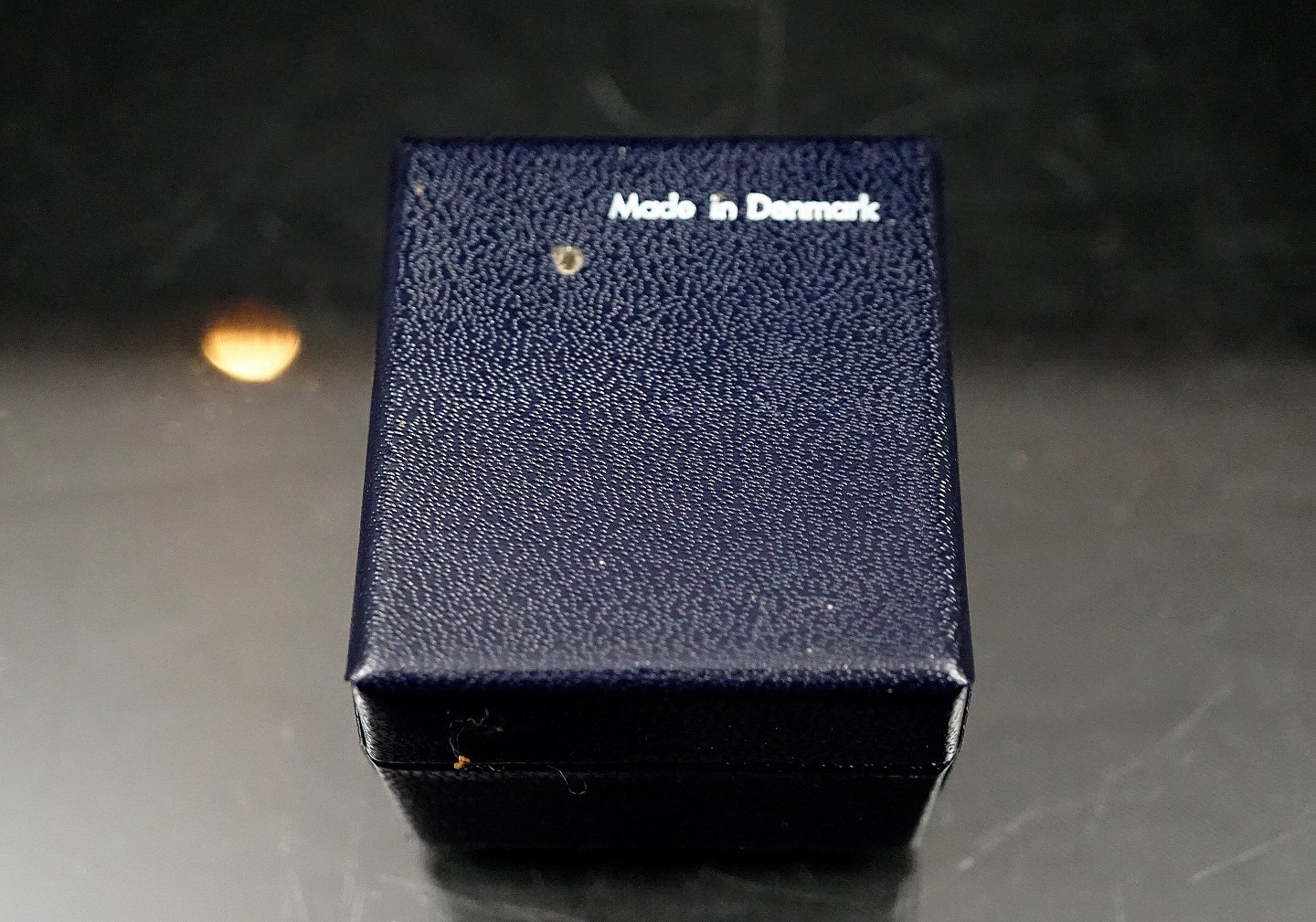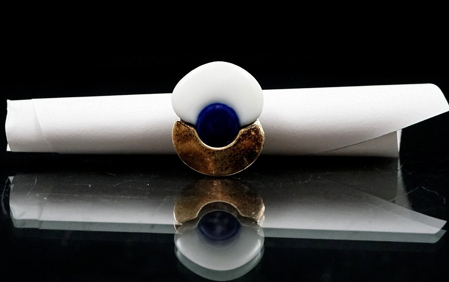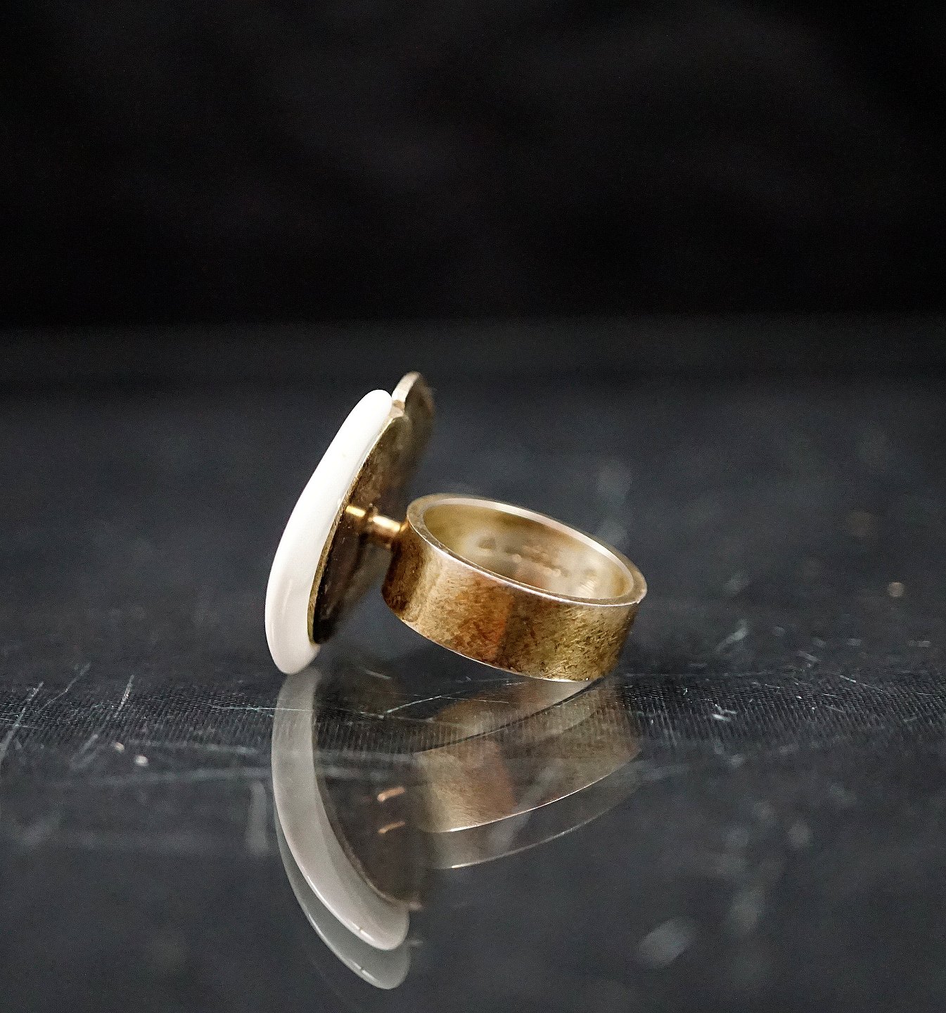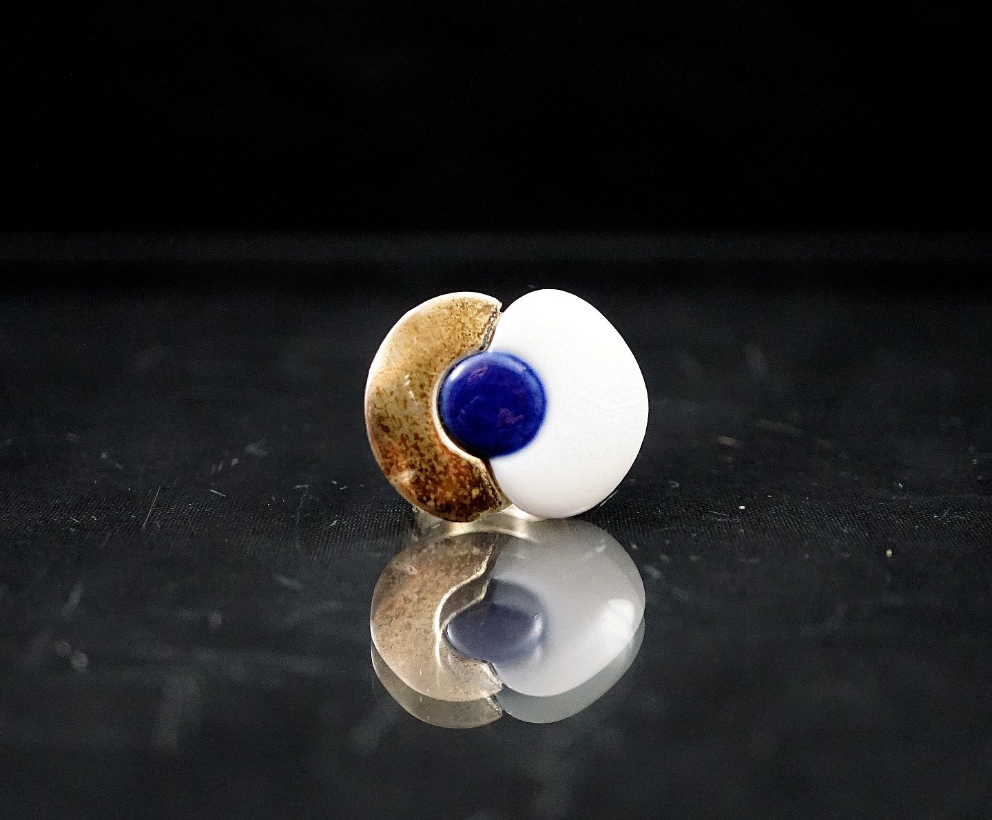 Royal Copenhagen. Ring af sterling sølv, prydet med hvidt og kongeblåt porcelæn. Designet til den "Royal Bini", udgaven af smykker, der blev produceret af Dansk sølv selskab Anton Michelsen for den keramiske gigant Royal Copenhagen i 1960'erne. Dette design af smykker blev solgt gennem Georg Jensens butik i København i slutningen af 1960'erne.