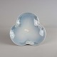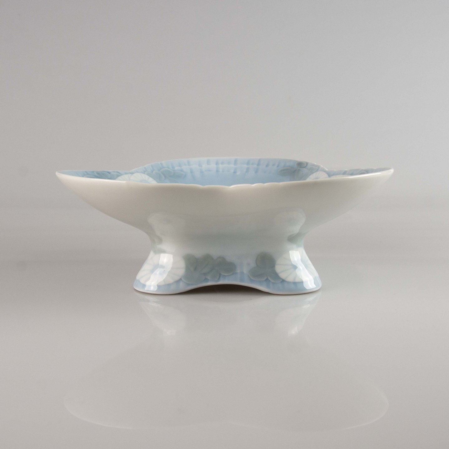 Fad på fod i hvid og lyseblå porcelæn med dekoration af margueritblomster og kløverblade