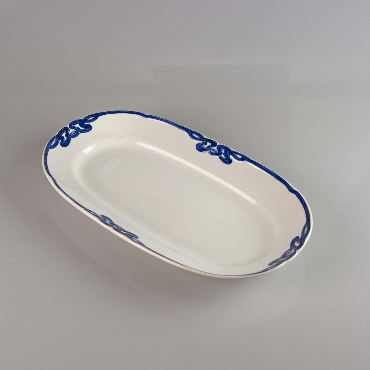 Fad i hvid fajance med dekoration af blå abstrakt mønster langs kanten.