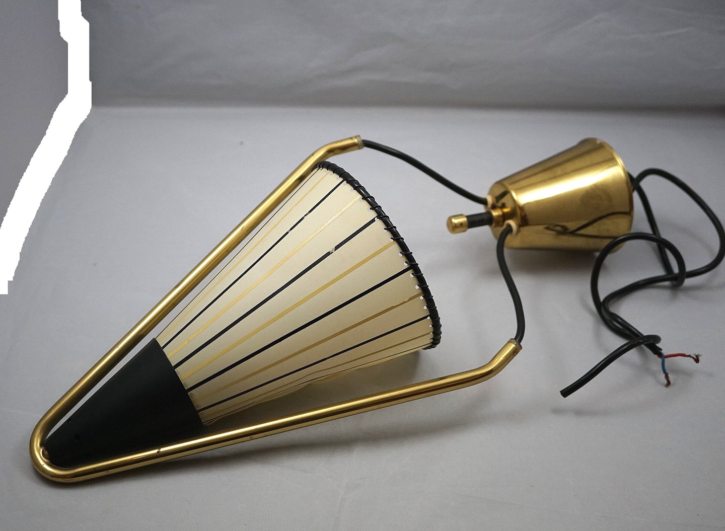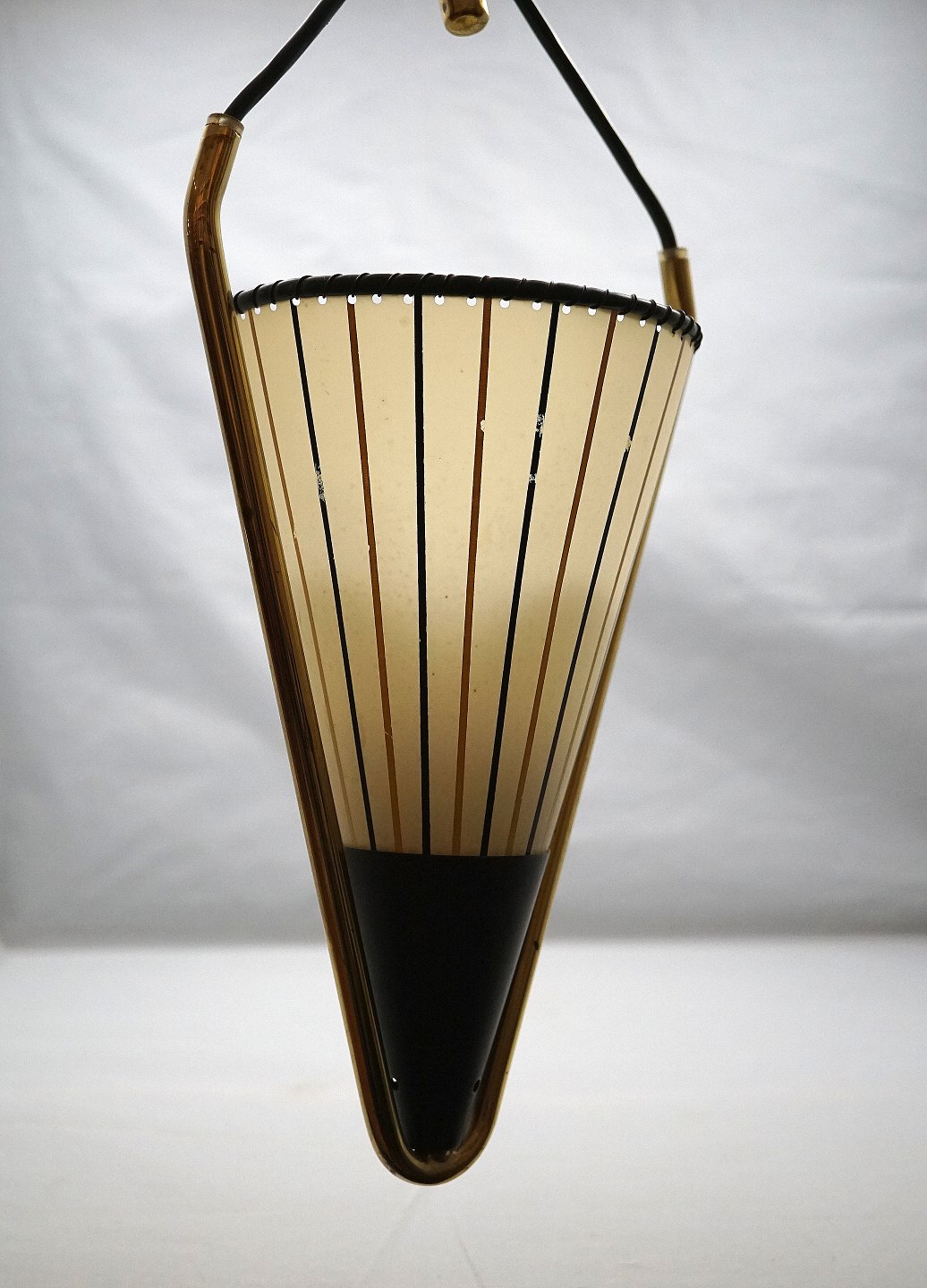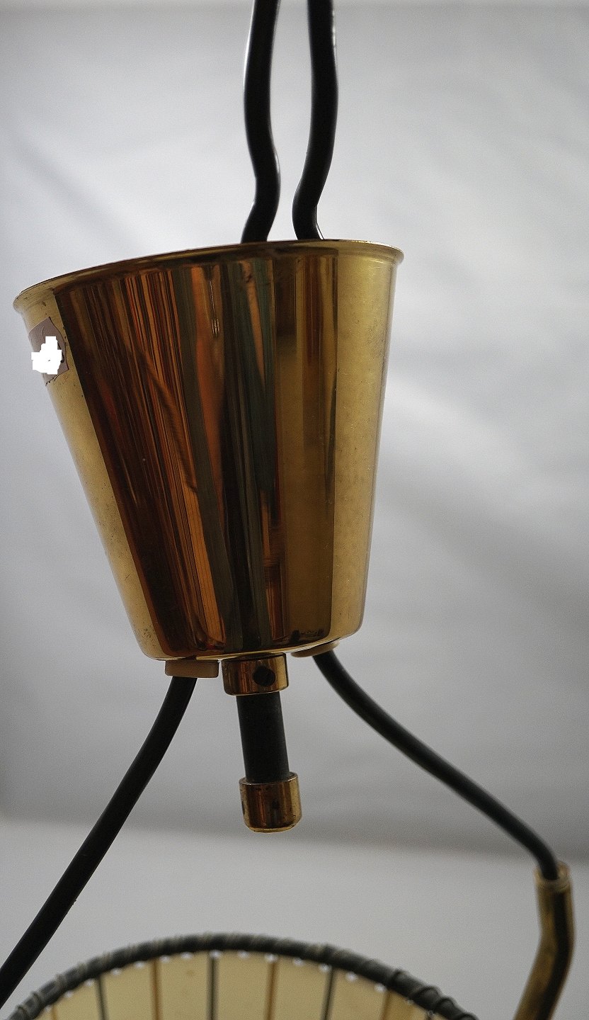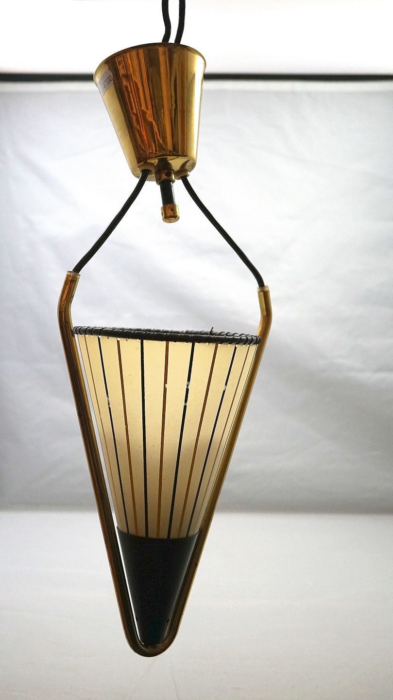 Loftslampe med messing stel og plastskærm med brune og sorte striber. selve lampen er omvendt kegleformet