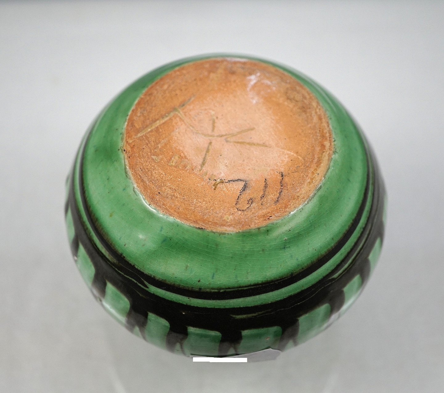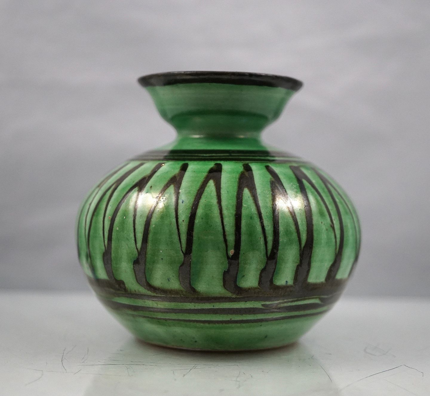 Kähler vase. Lille grøn vase med sorte striber, vasen er sort indvendig
