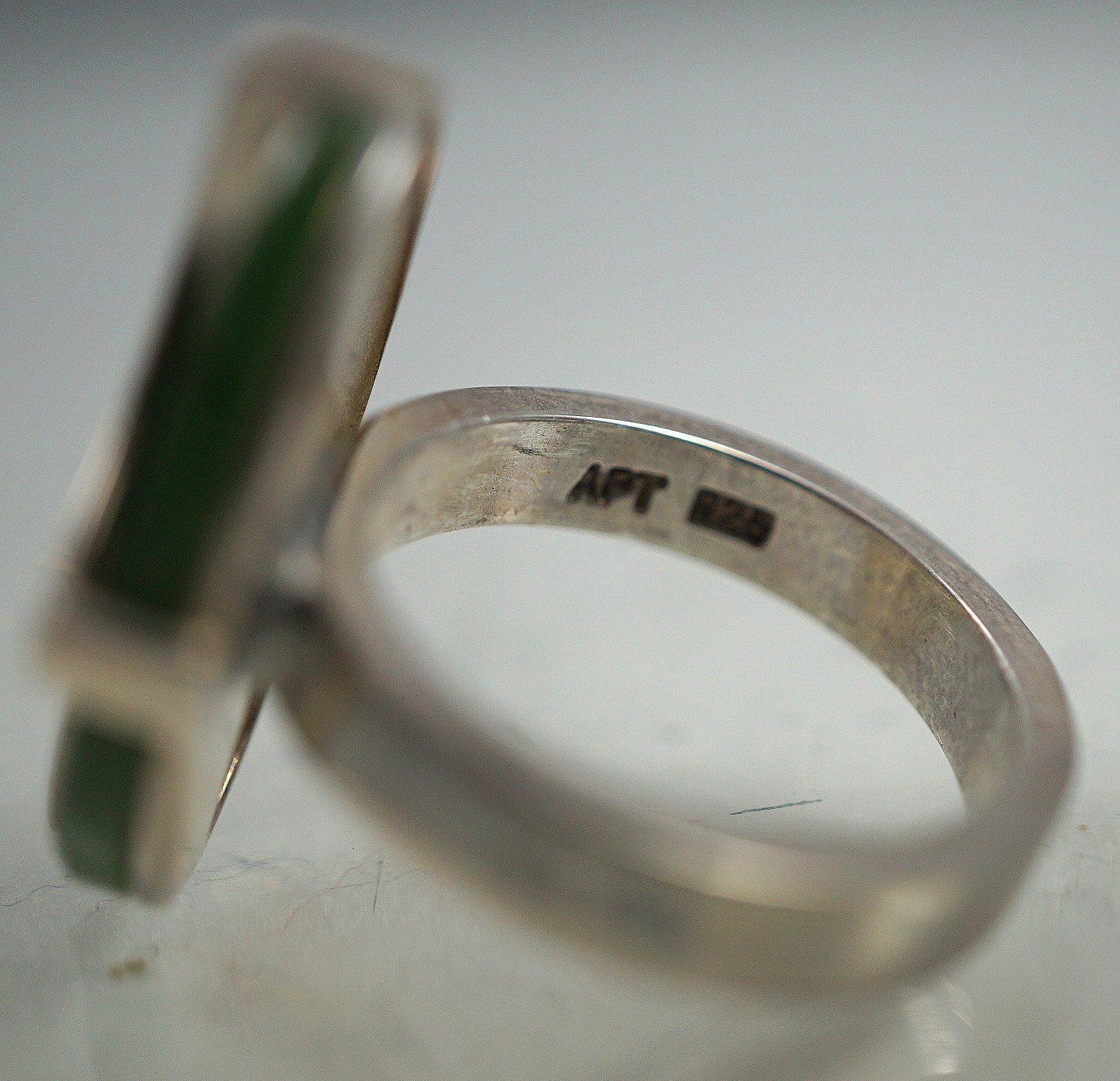 N. E. From. Ring med oval dekoration, dekorationen består af halv sølv og halv agat sten. Ring str. 18. Sterling 925s sølv
