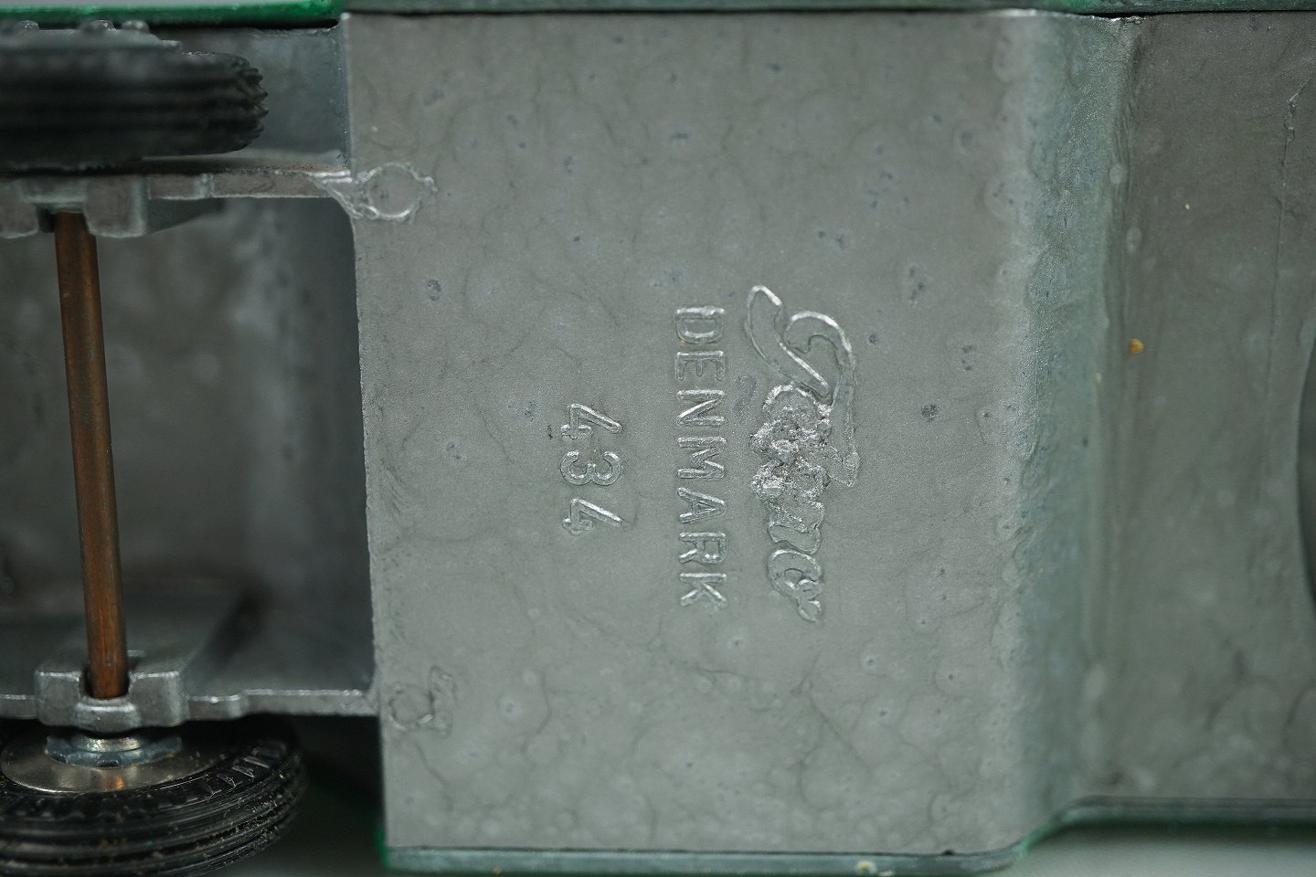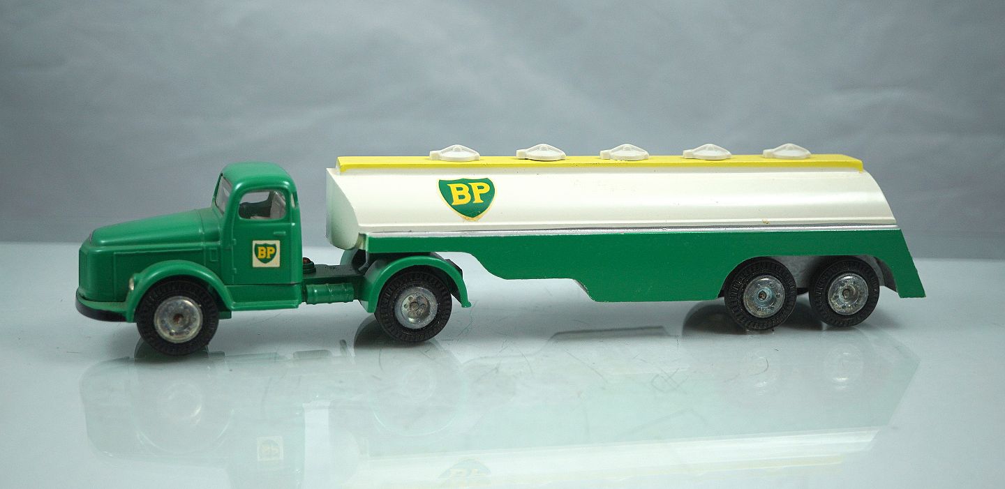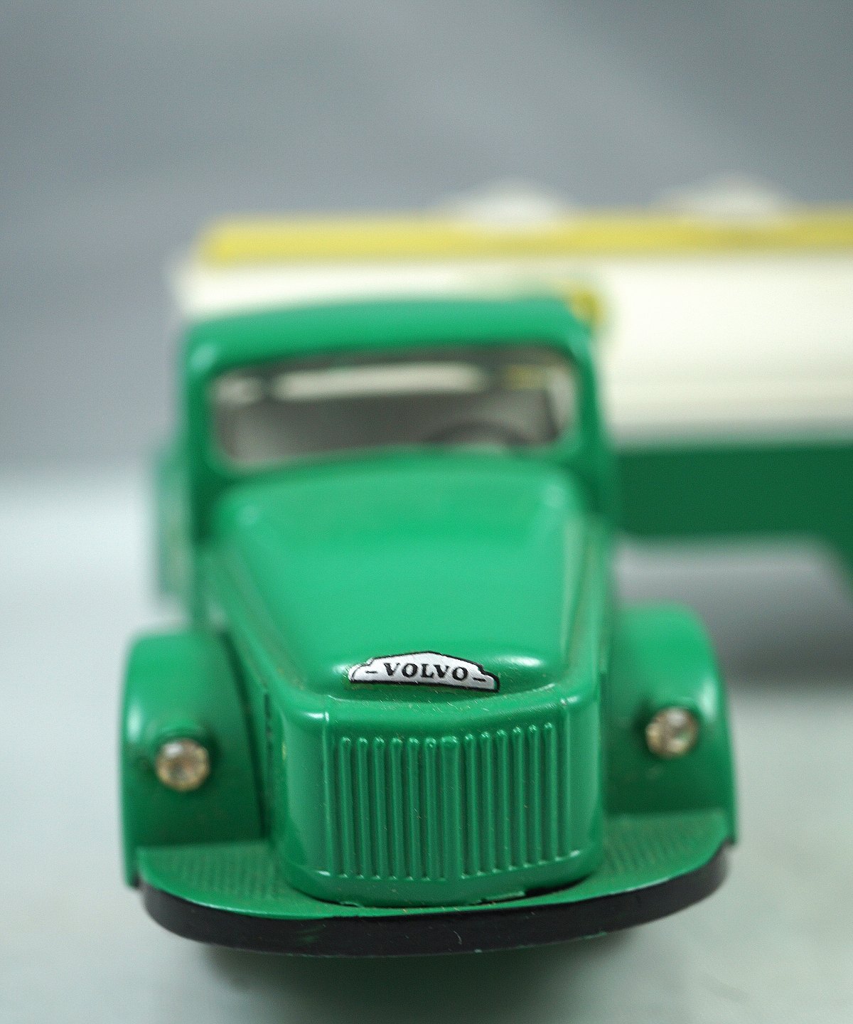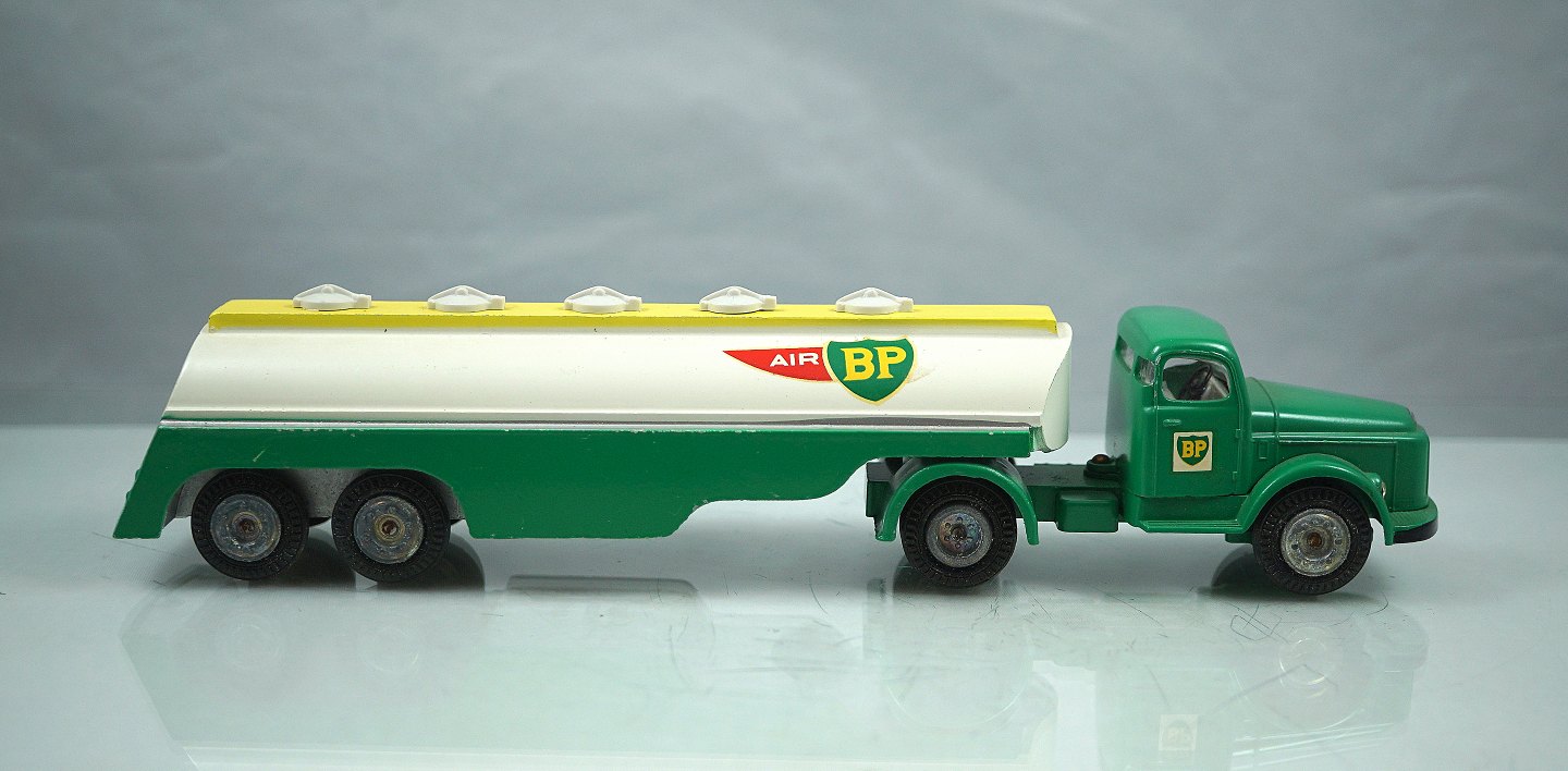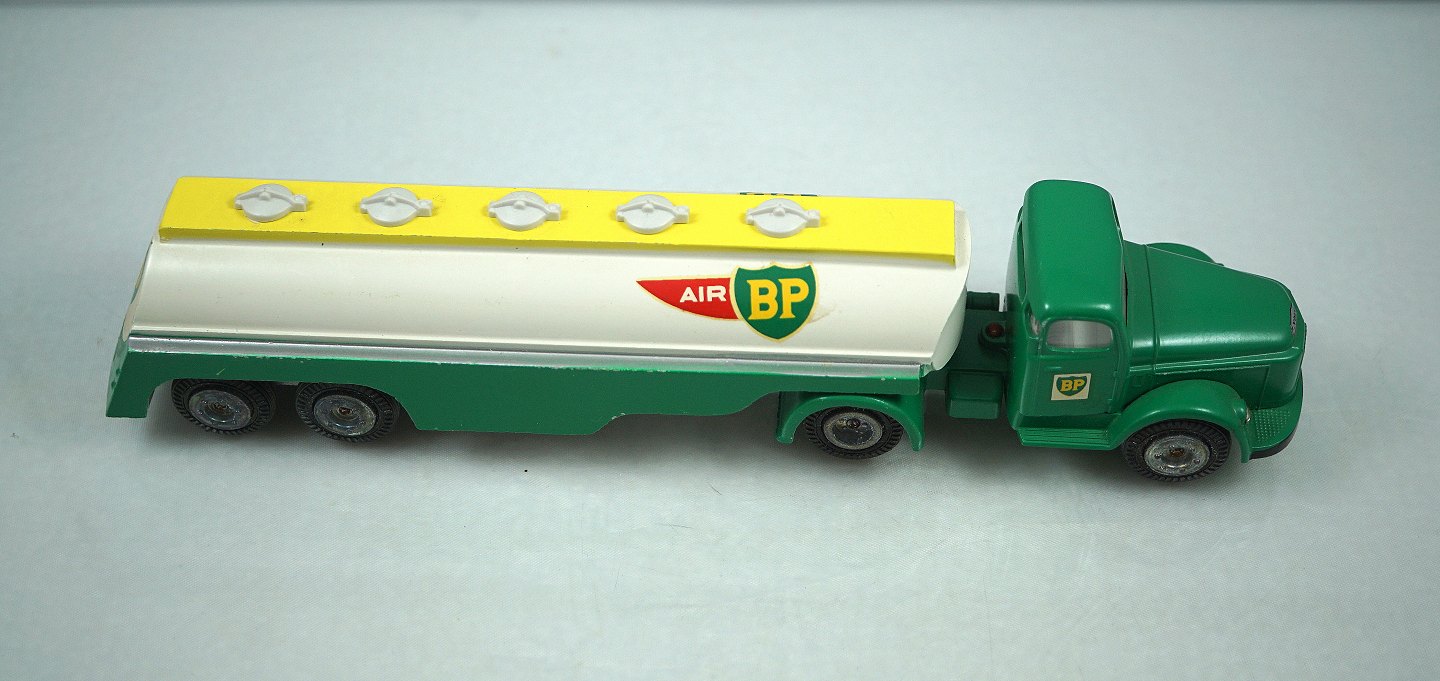 Tekno Denmark nr. 434. Volvo BP "Air BP" tankbil, bilen er fra ca. 1960. Førerhuset kan drejes. Der er 5 tanklåger på toppen af tanken. Førerhuset er grønt og tanken er hvid.