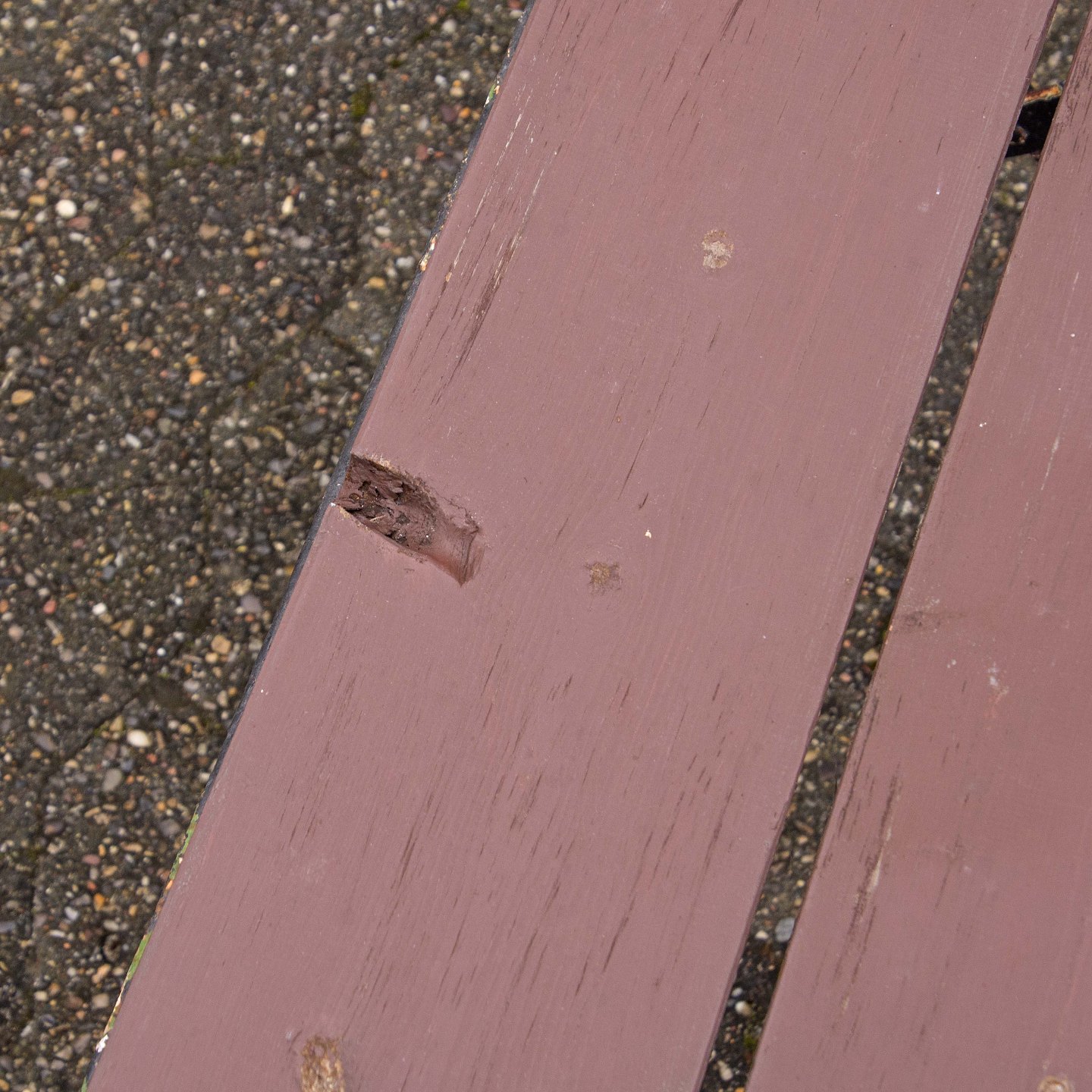 God stand med brugsspor på metalstel samt mærke efter knast i træsædet.