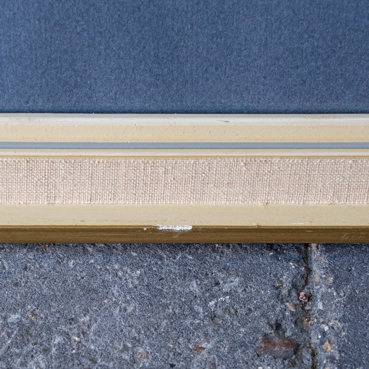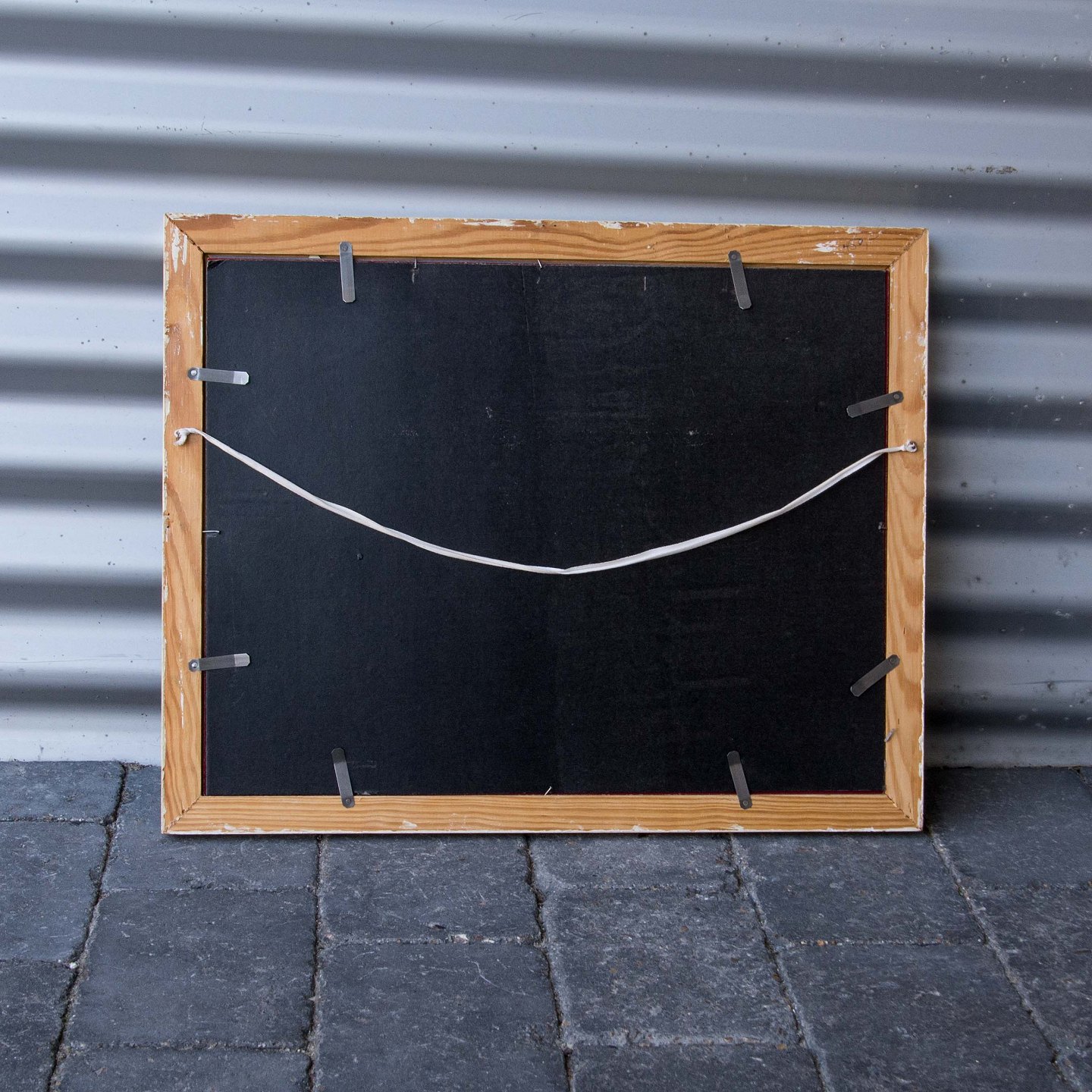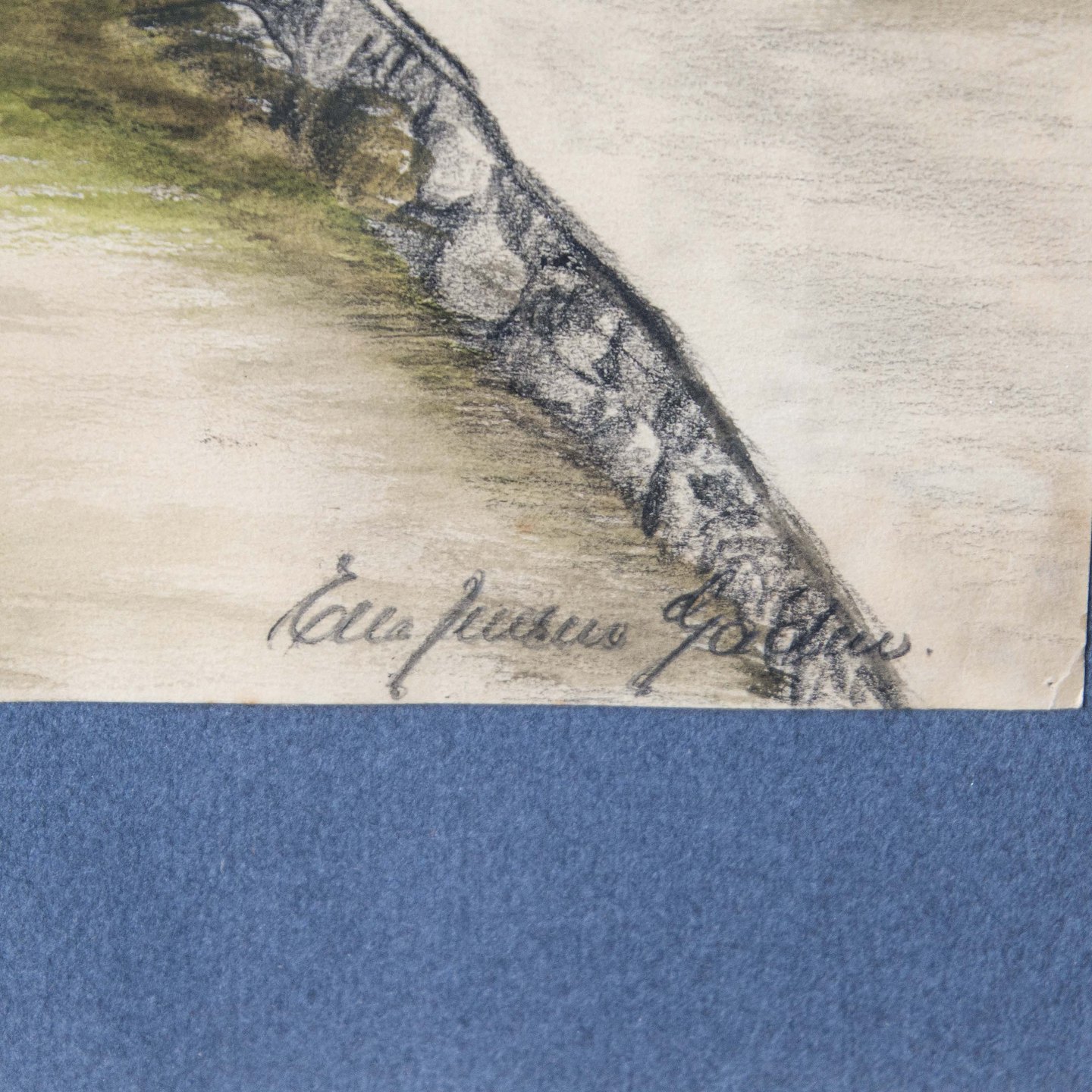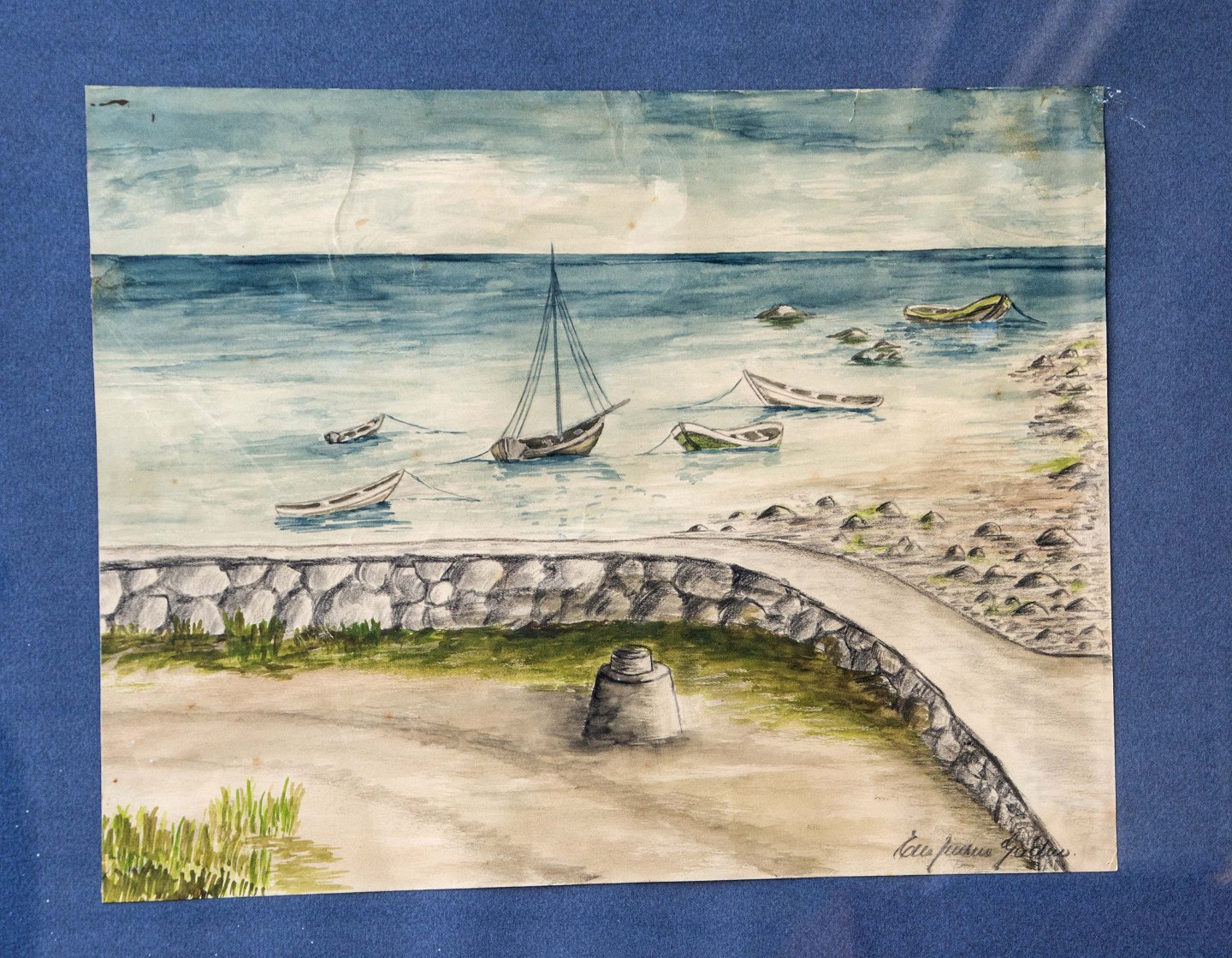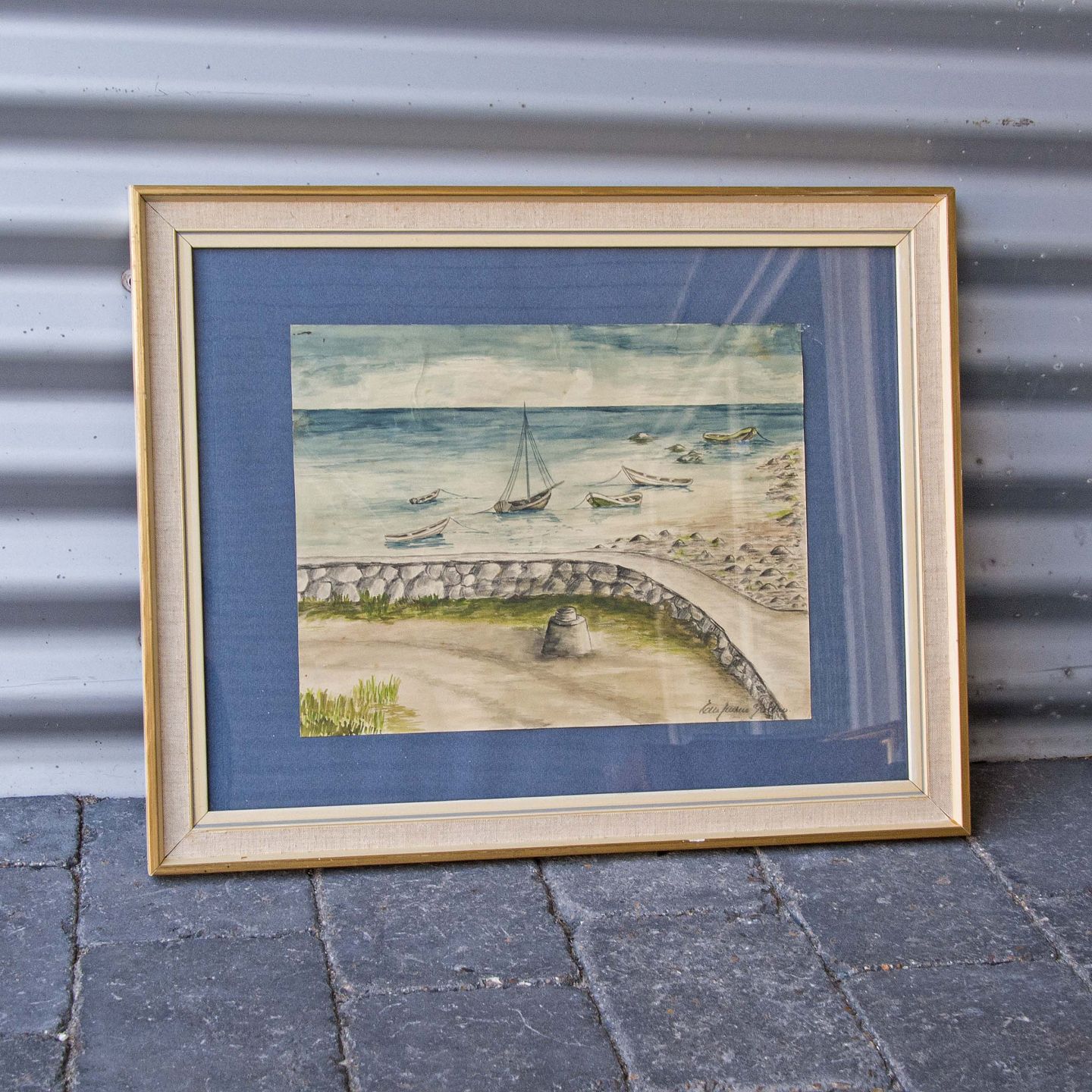 Kul/olie tegning i glas og ramme, af lille bådsted.