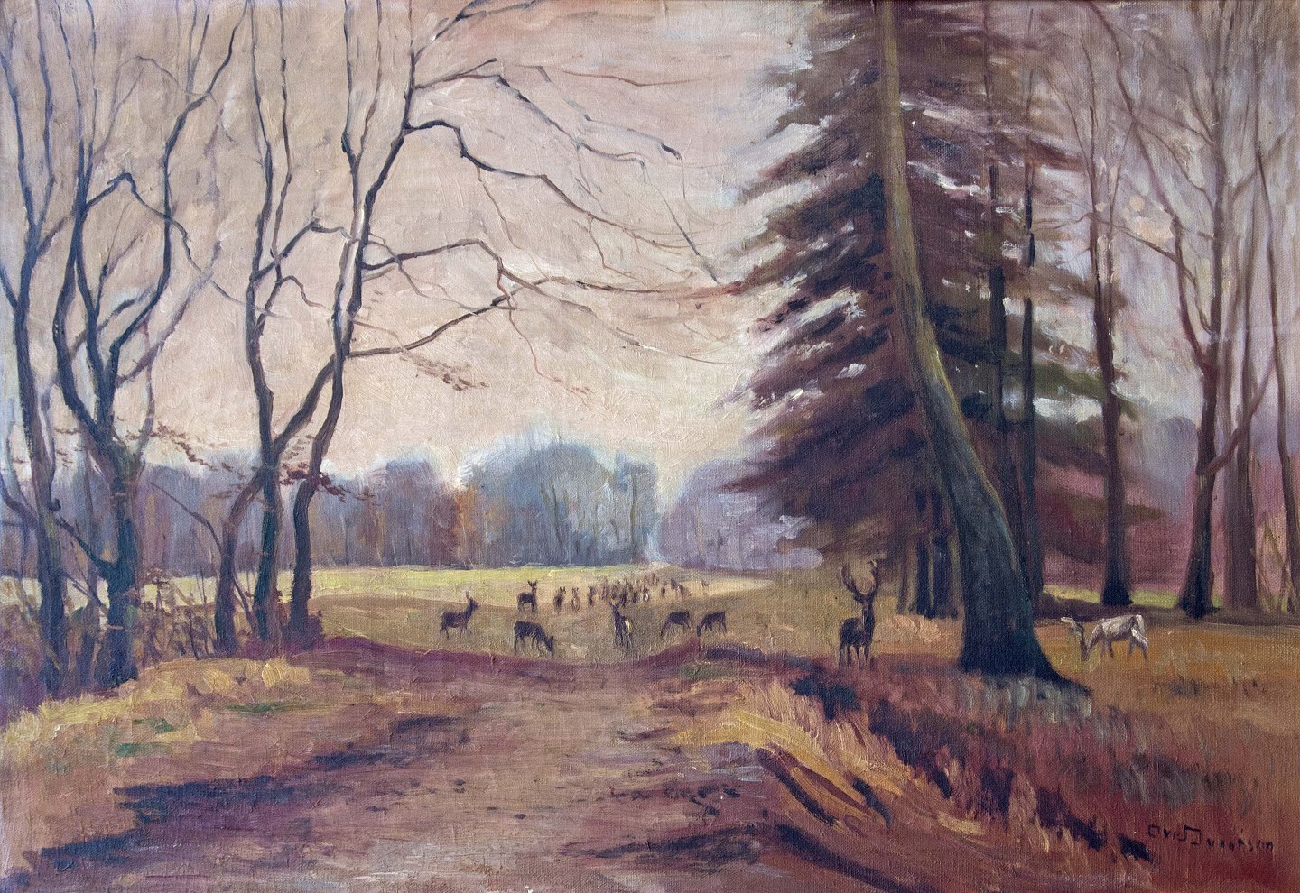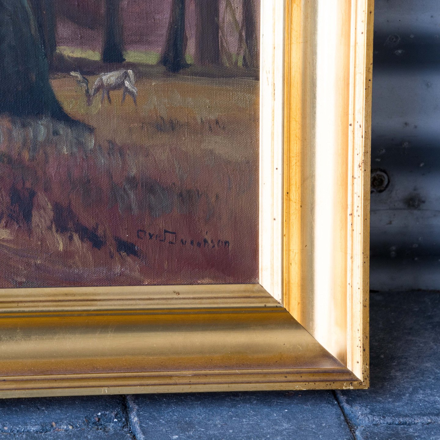 Landskabmaleri med motiv kronhjort med flok i naturområde