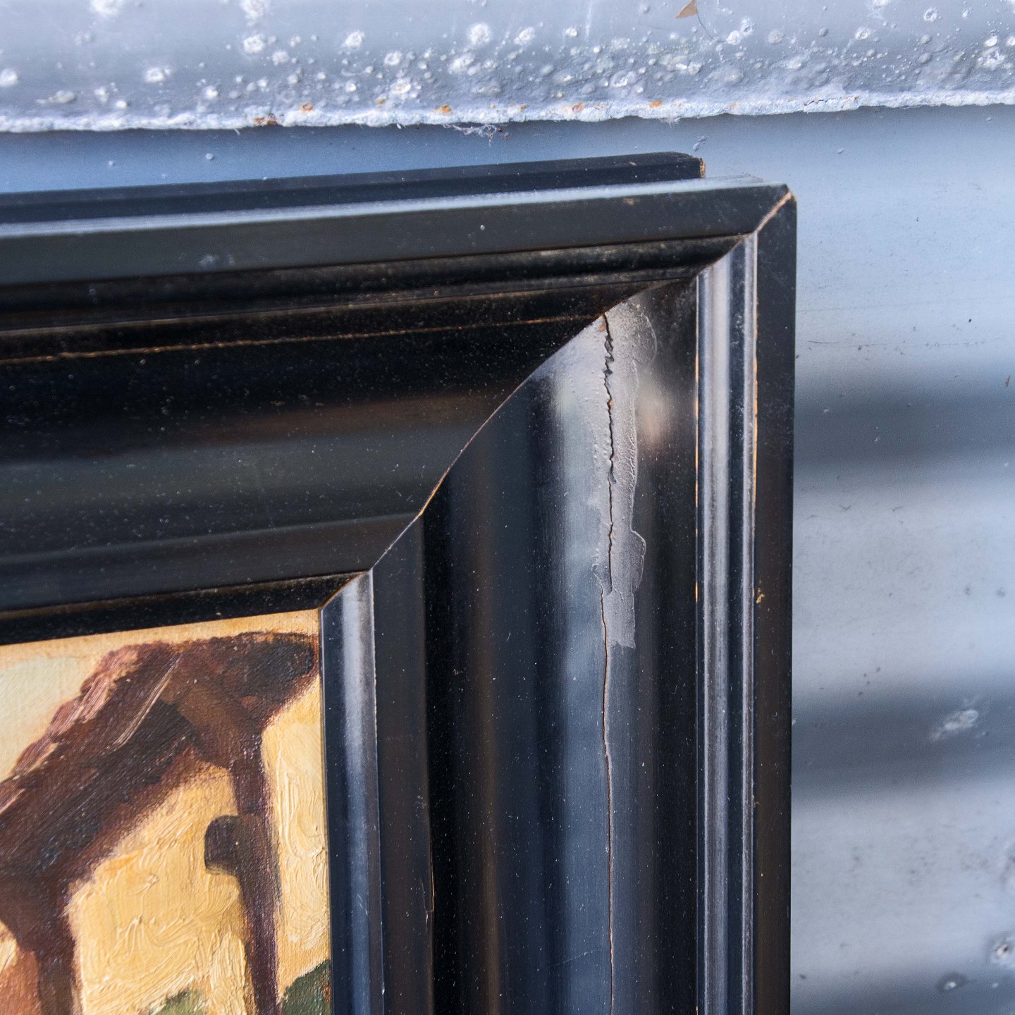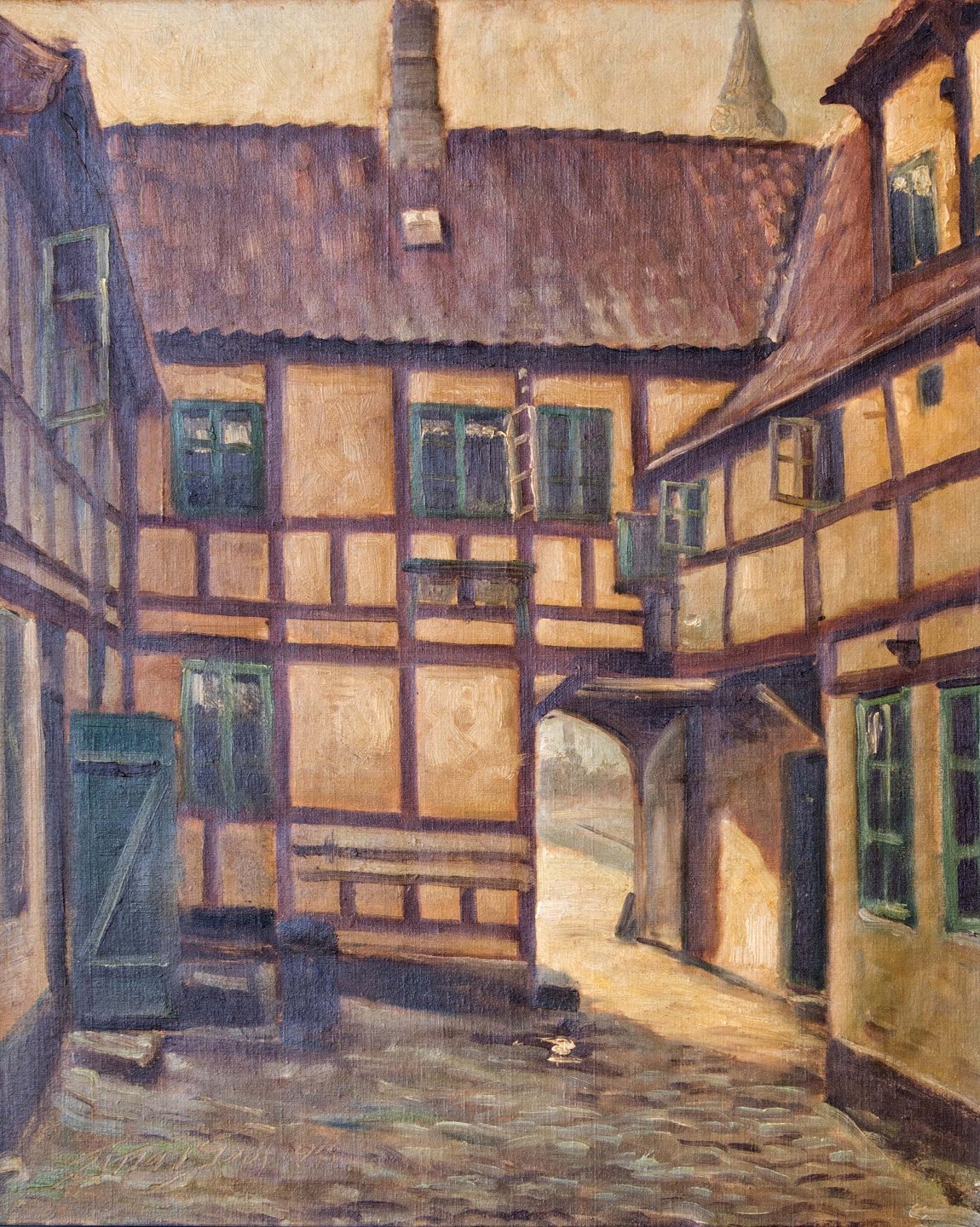 Eksteriør maleri med motiv gårdmiljø med bindeværkshuse