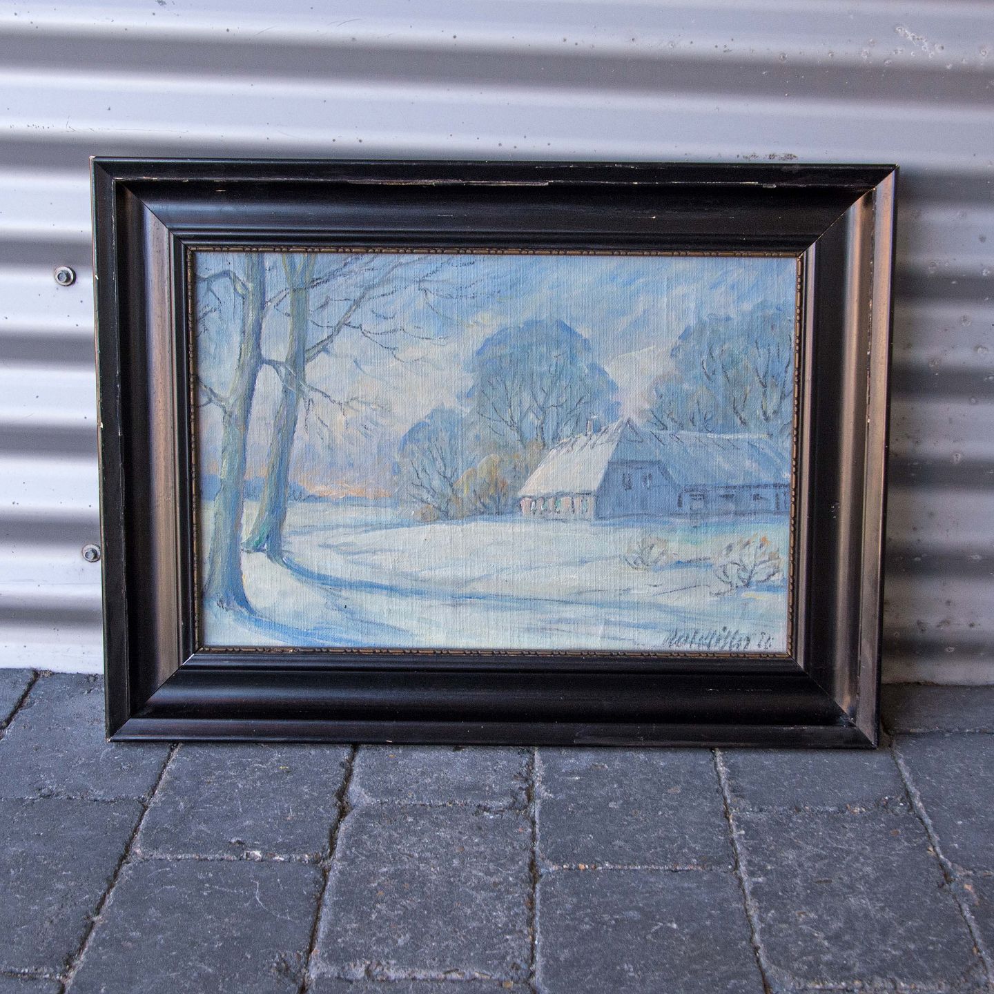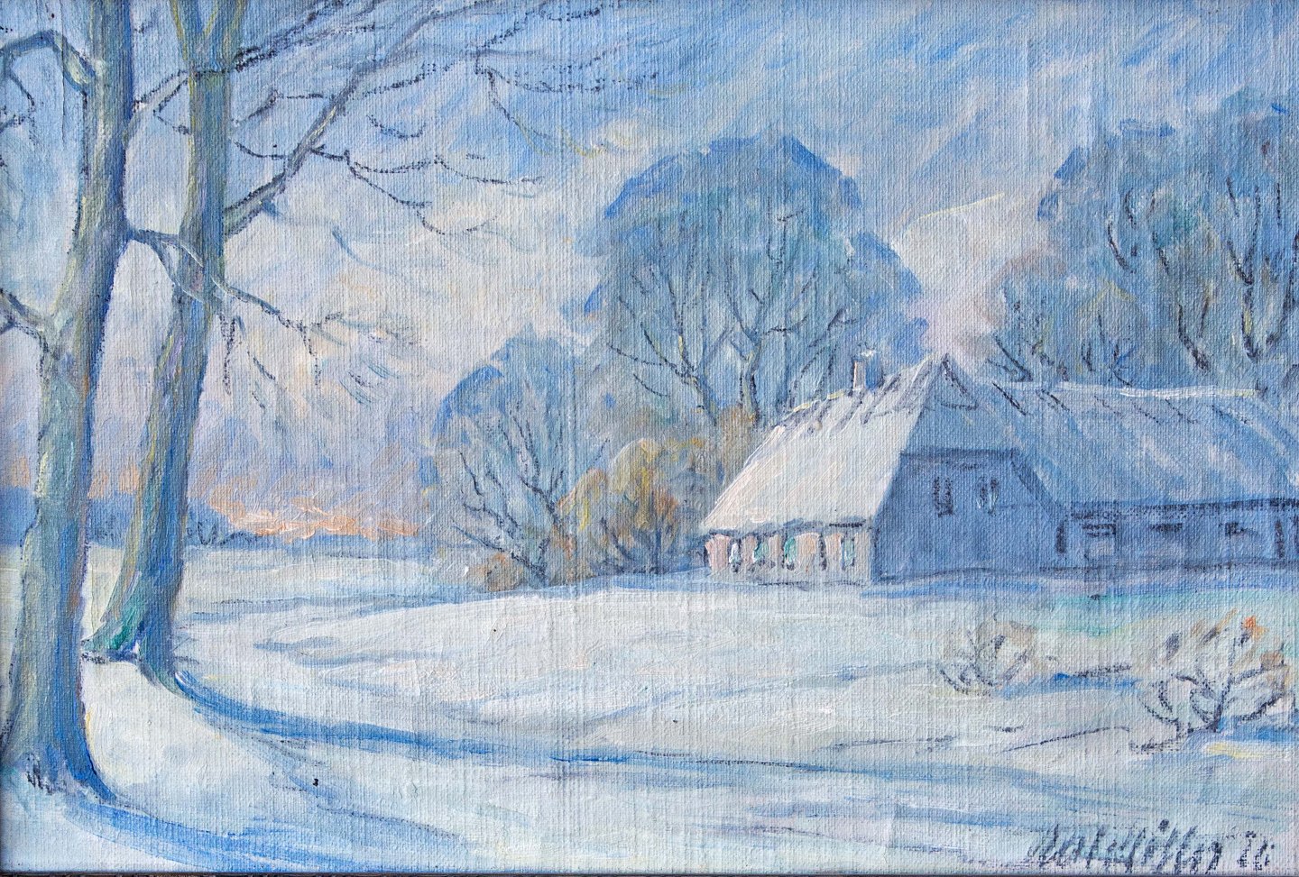 Landskabmaleri med vintermotiv af hus i naturomgivelser