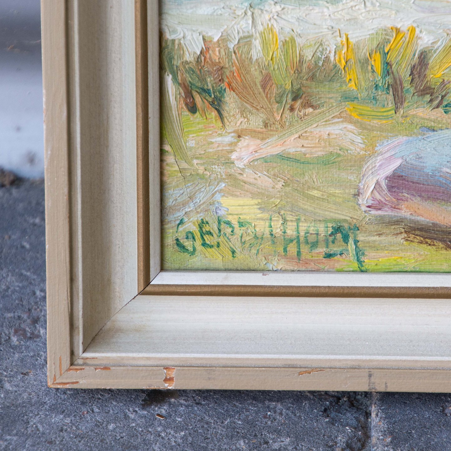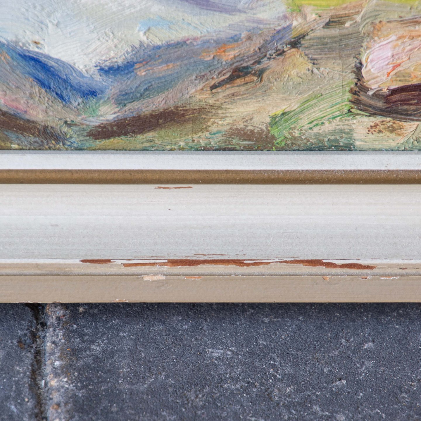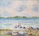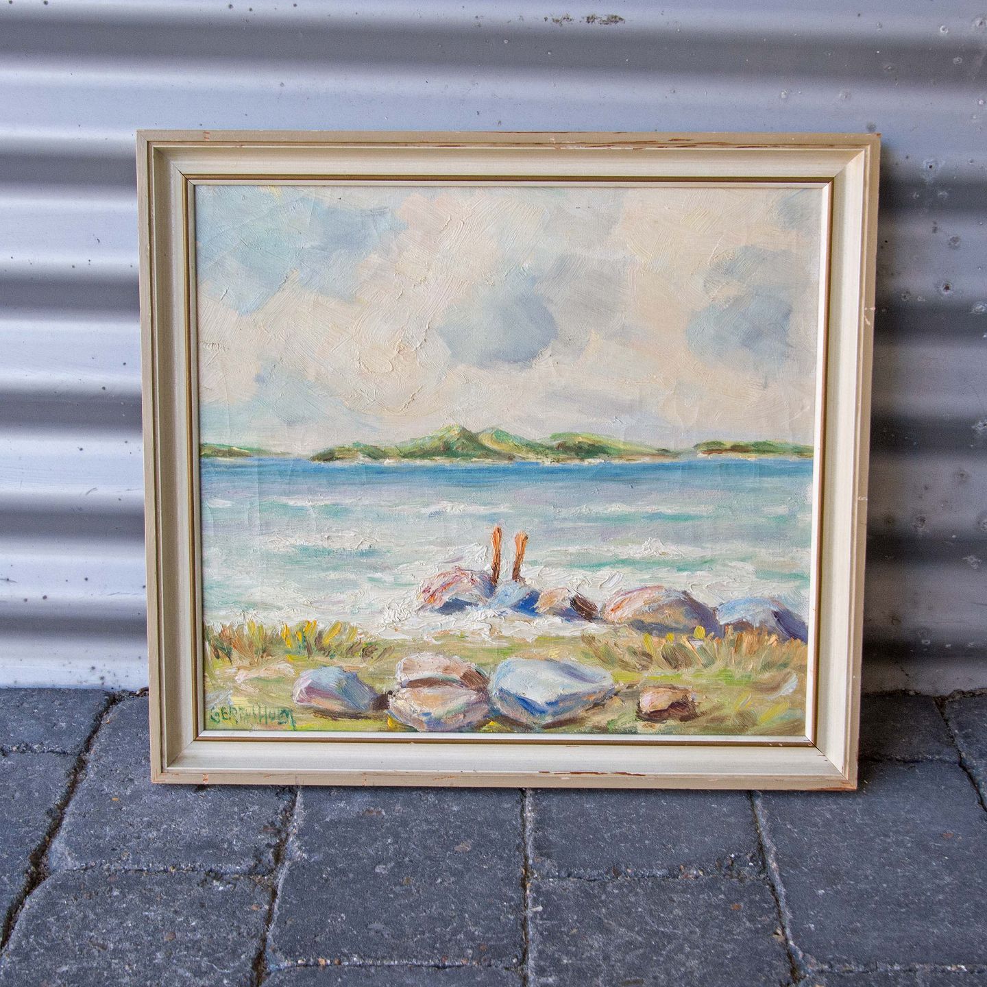Landskabmaleri med naturmotiv af sten og bakker ved vand