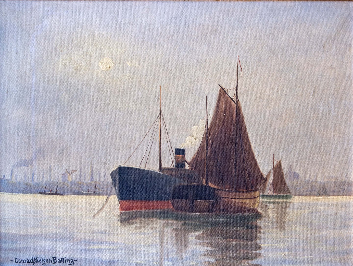 Skibsmaleri med motiv af dampskib og sejlbåd på hav