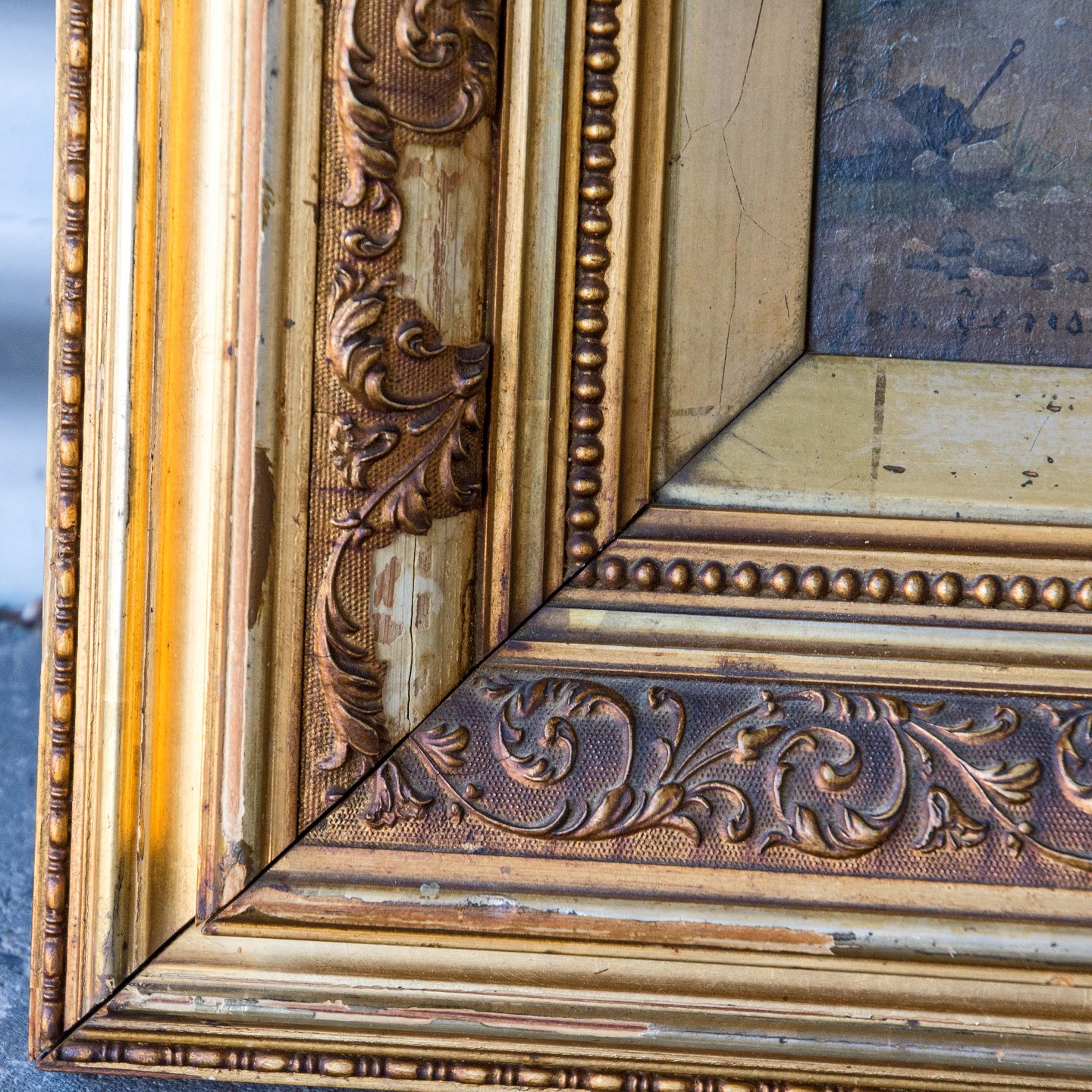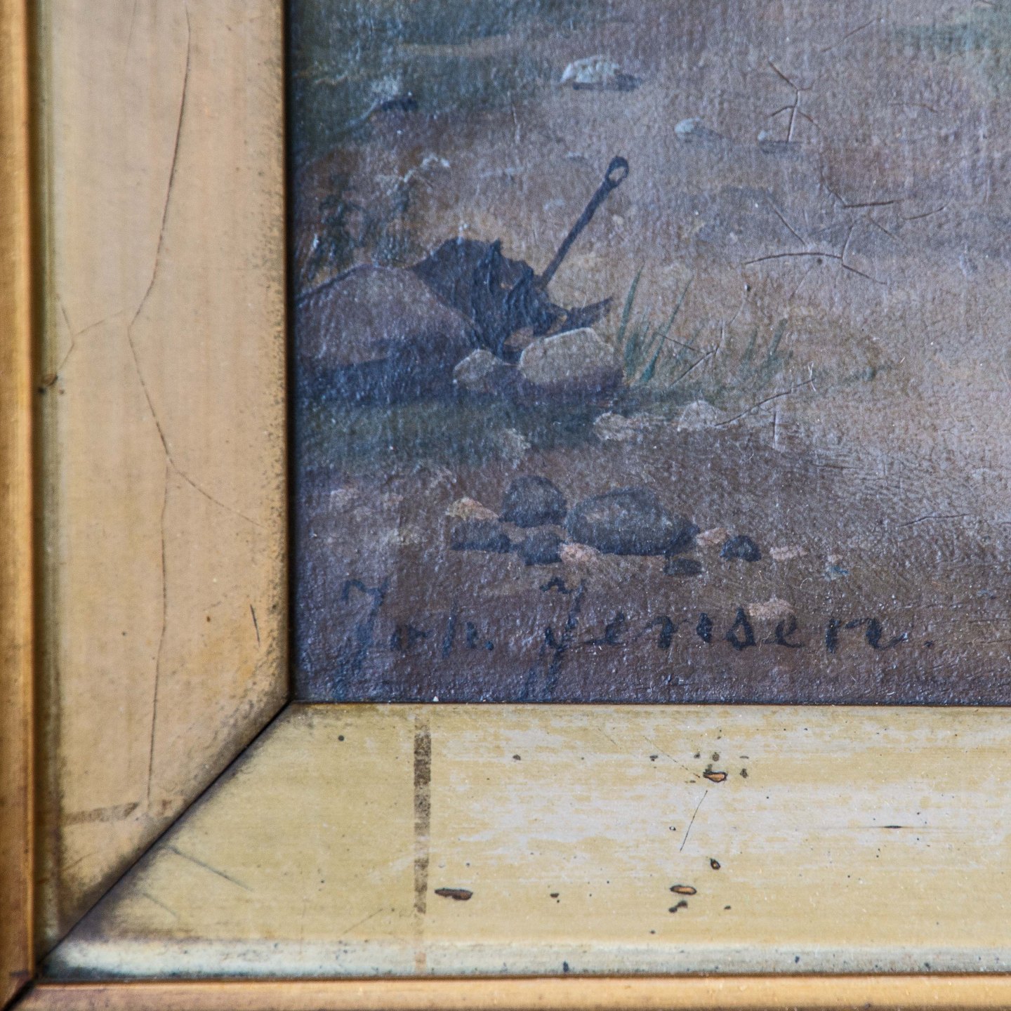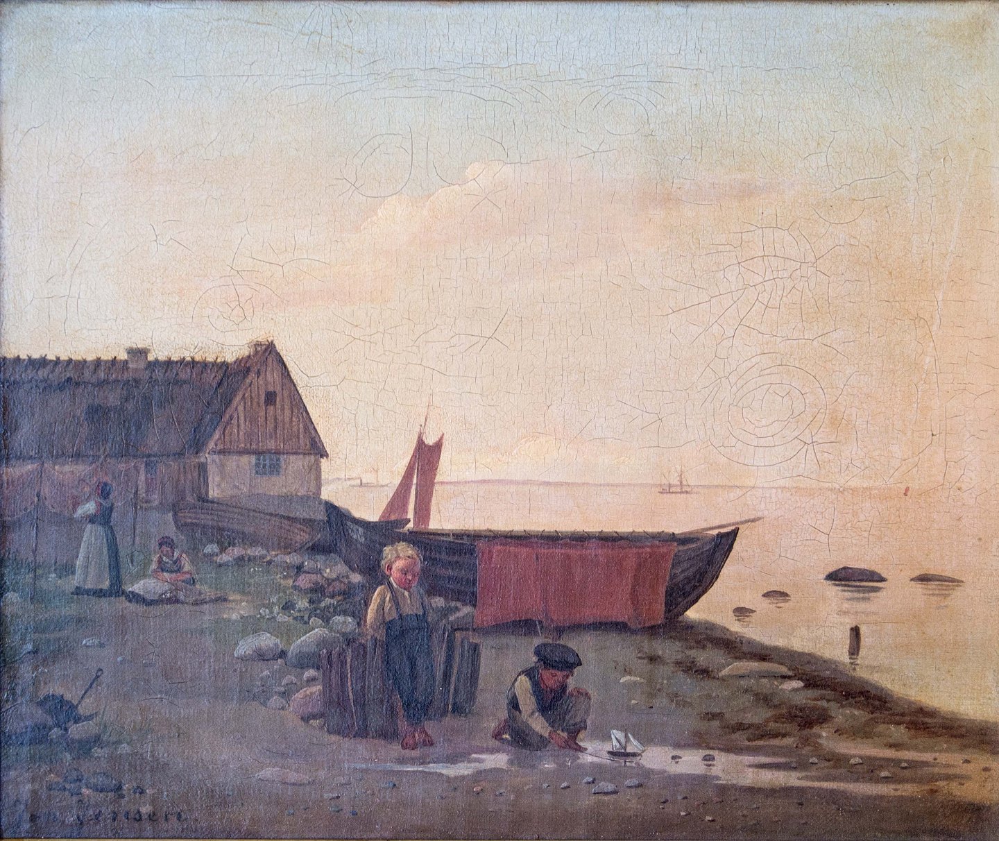 Kunstmaleri med motiv af fiskerleje med legende børn og kvinder
