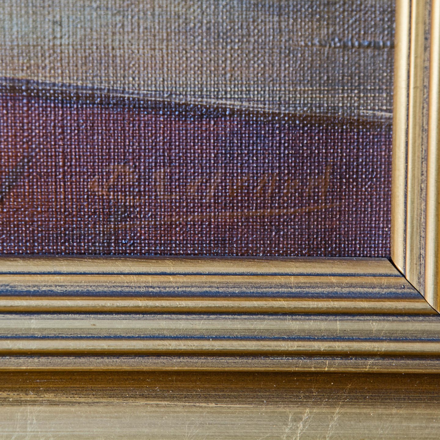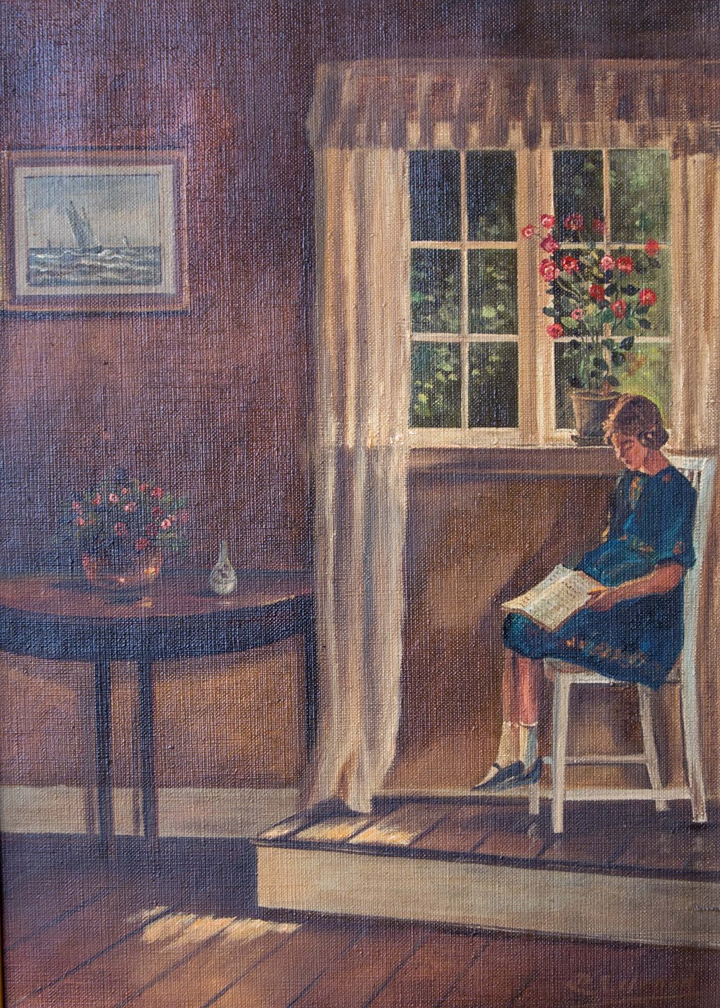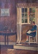 Interiør maleri med motiv af stuemiljø med siddende pige
