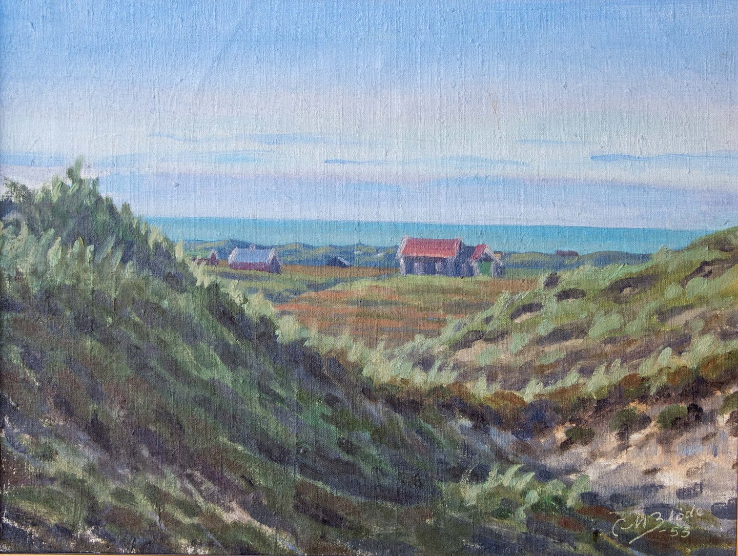 Landskabsmaleri med naturmotiv af sommerhuse i klitområde
