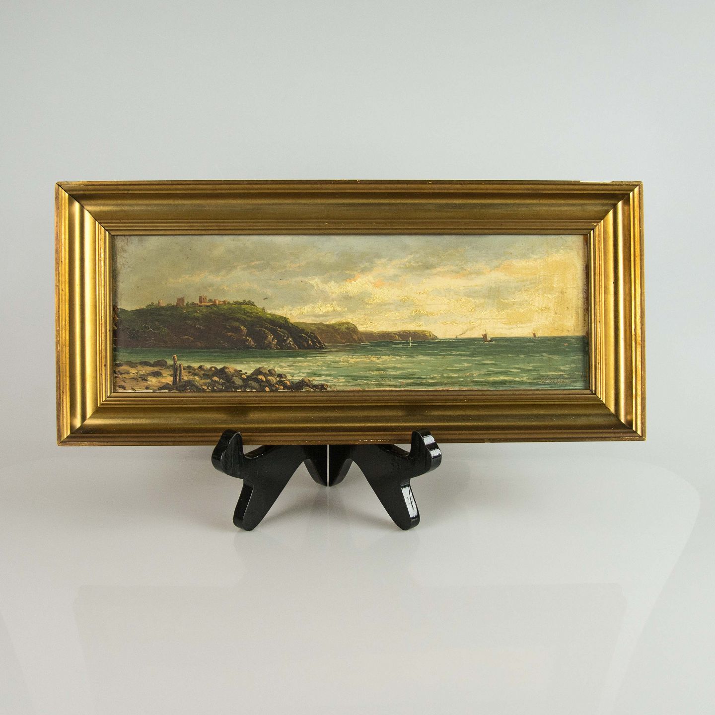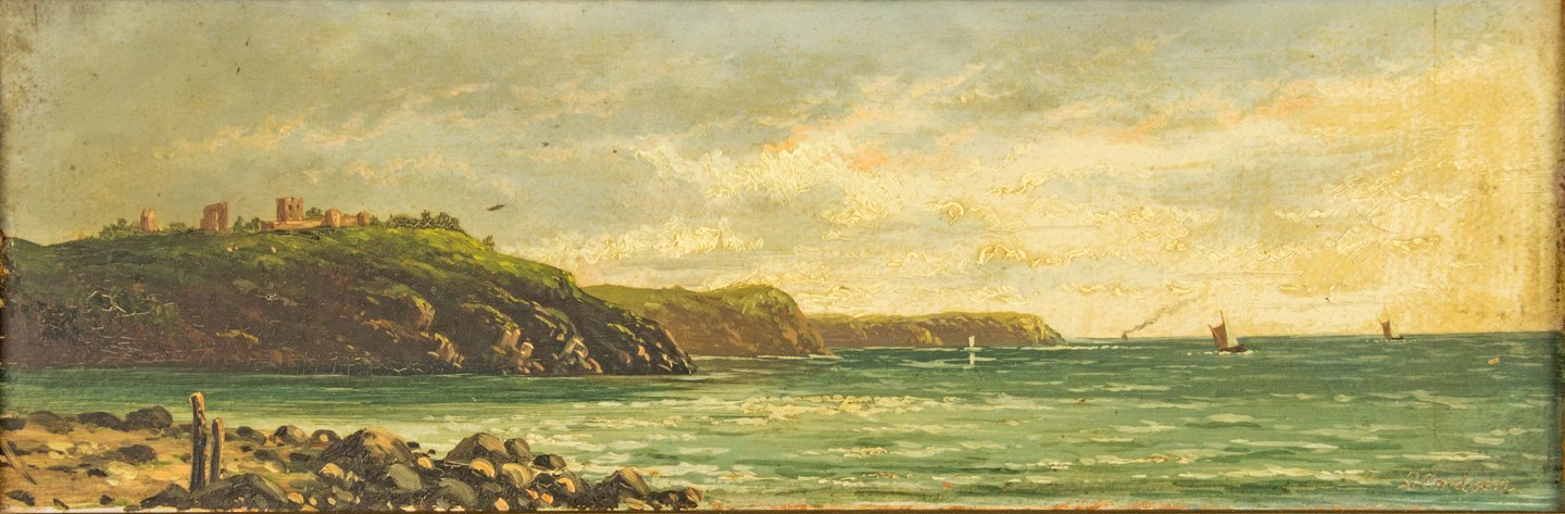 Landskabsmaleri med naturmotiv af hav og klipper med Hammershus, Bornholm