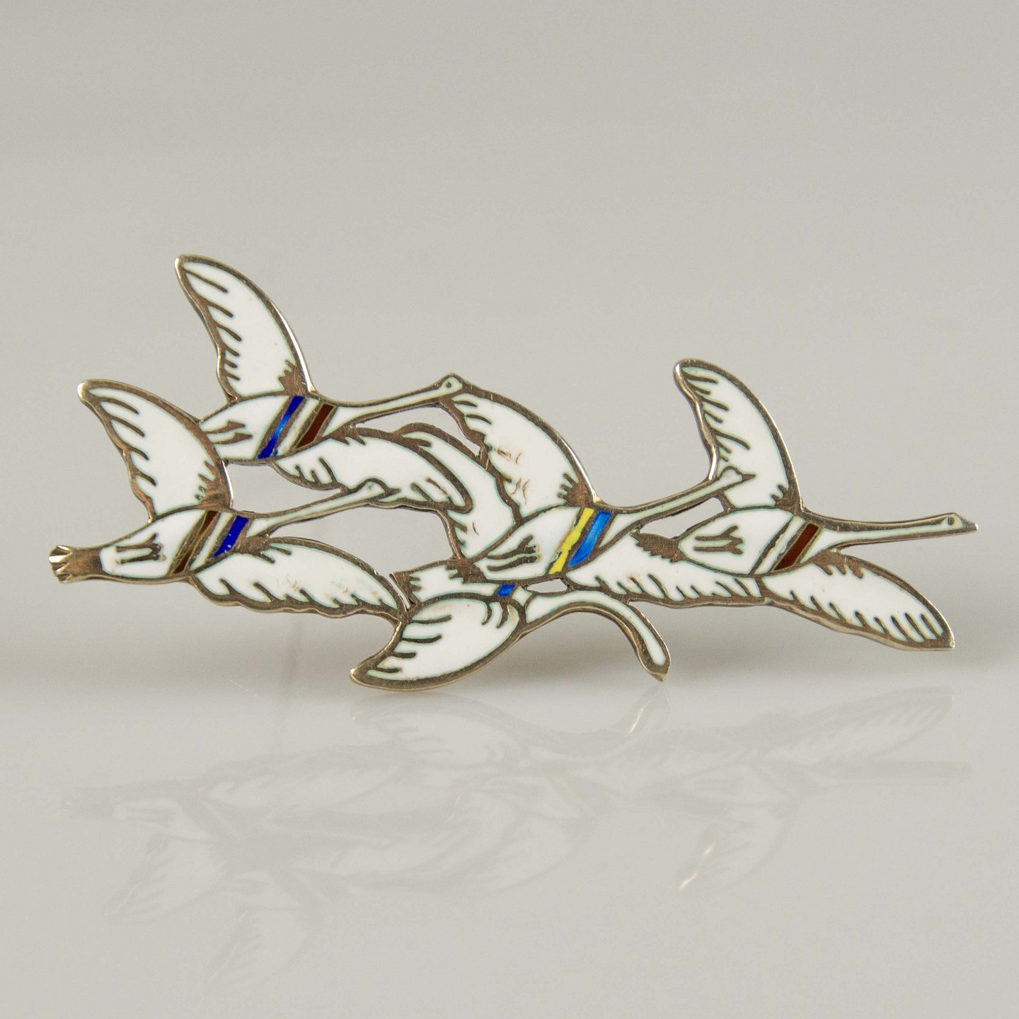 Broche i sølv og emalje med motiv af fem flyvende svaner