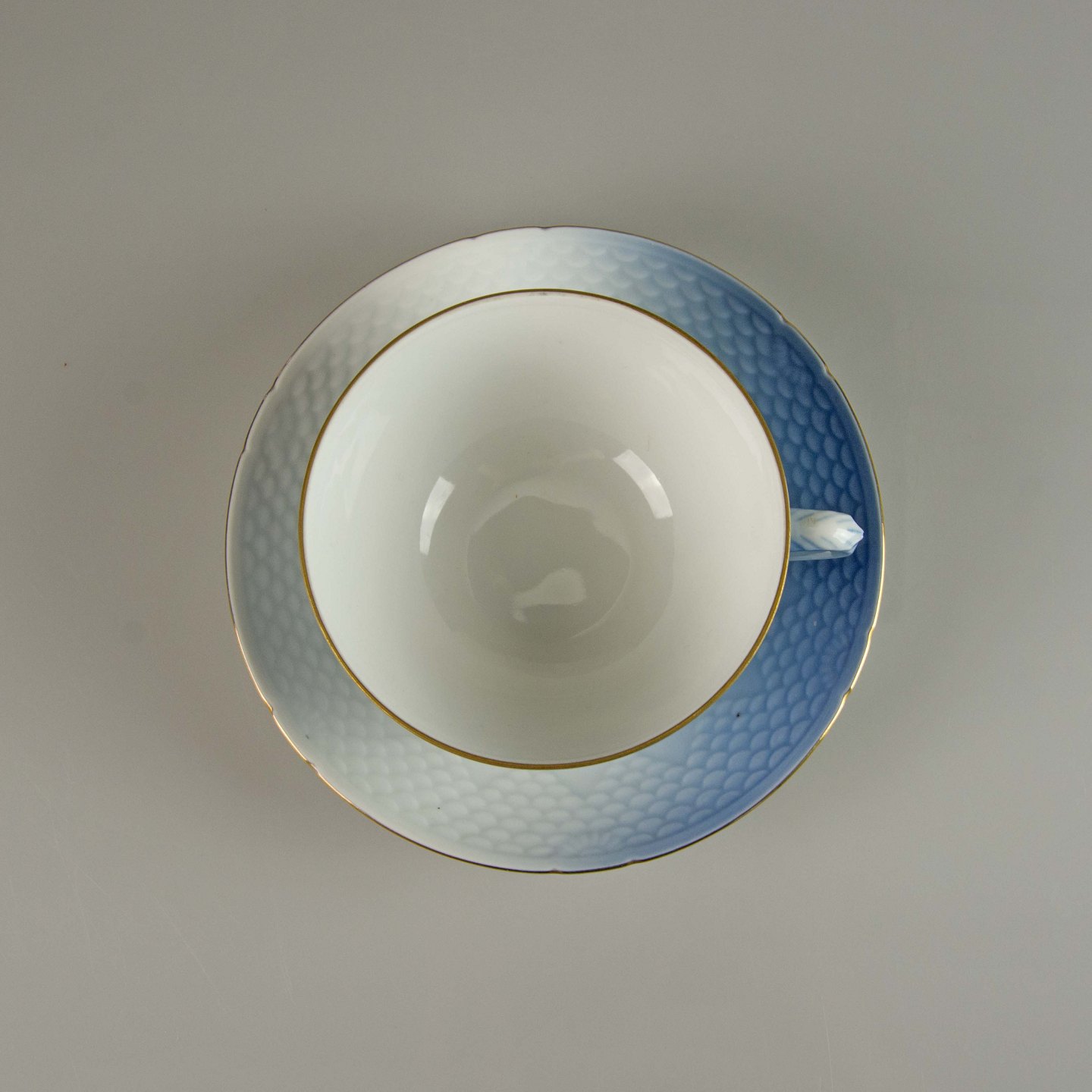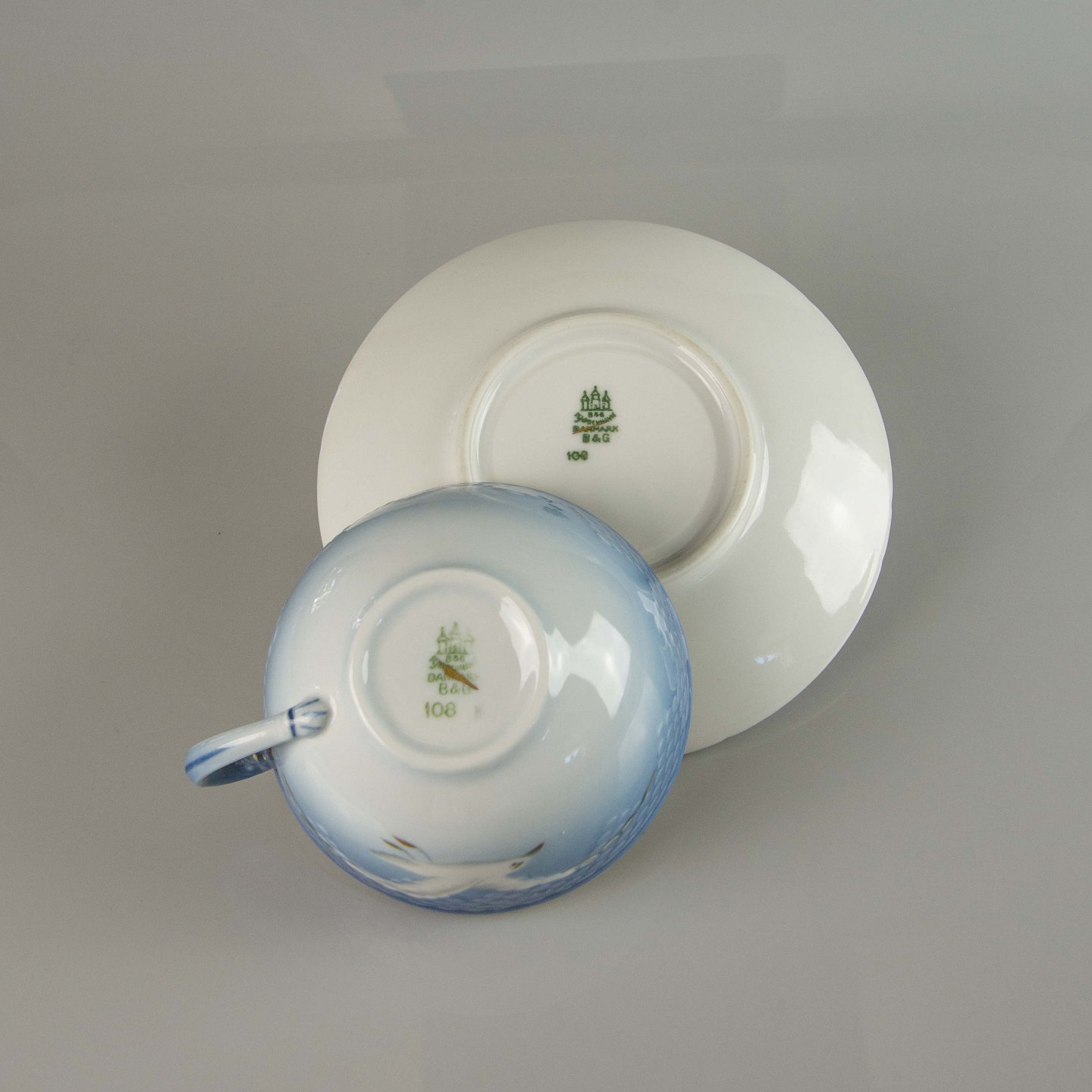 Stor kop i hvid og blå porcelæn med dekoration af flyvende måge.
