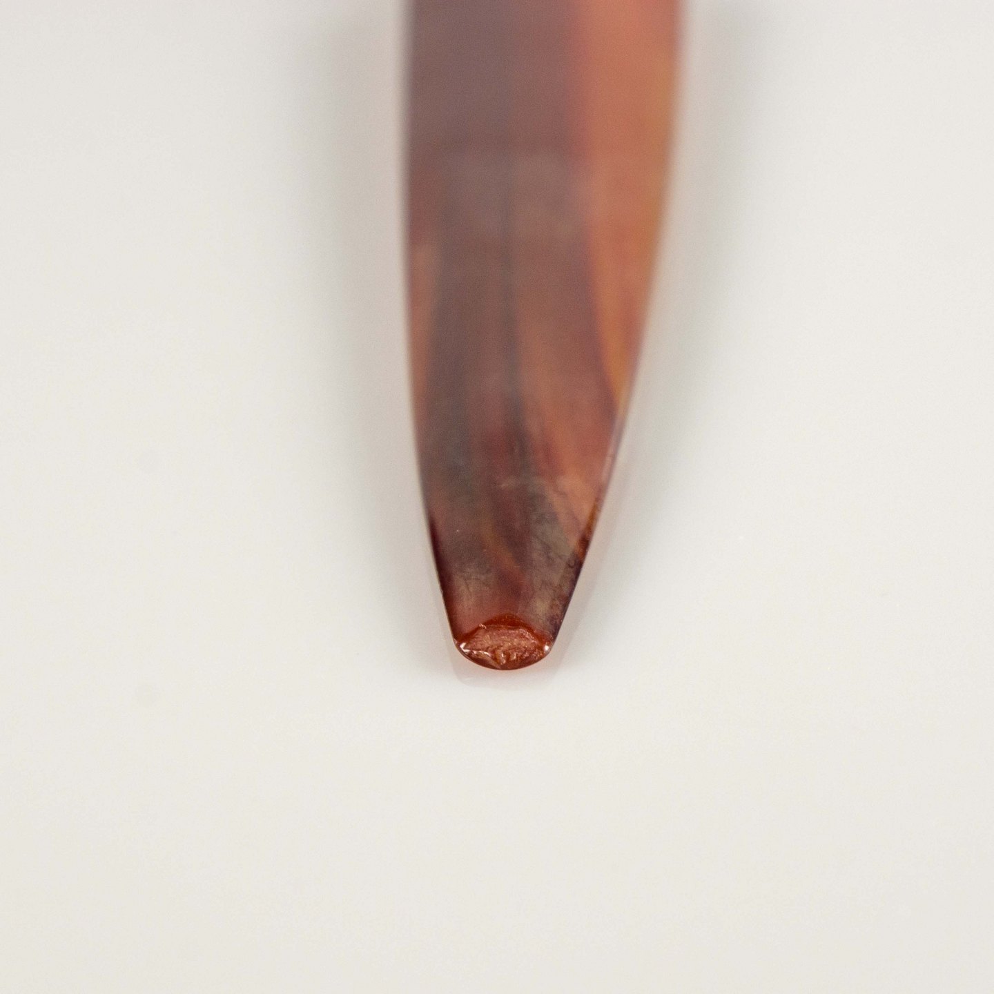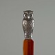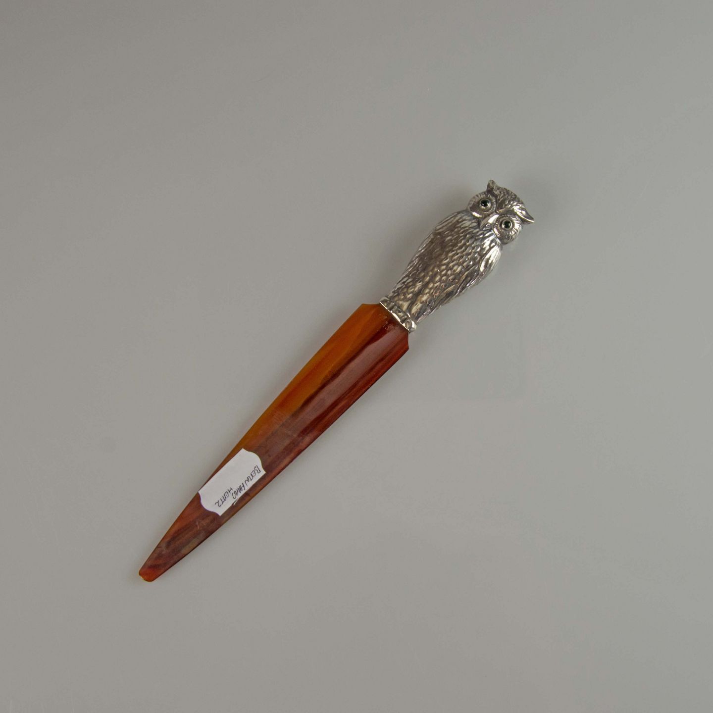 Brevåbner i tretårnet sølv med motiv af ugle monteret på ravfarvet blad.