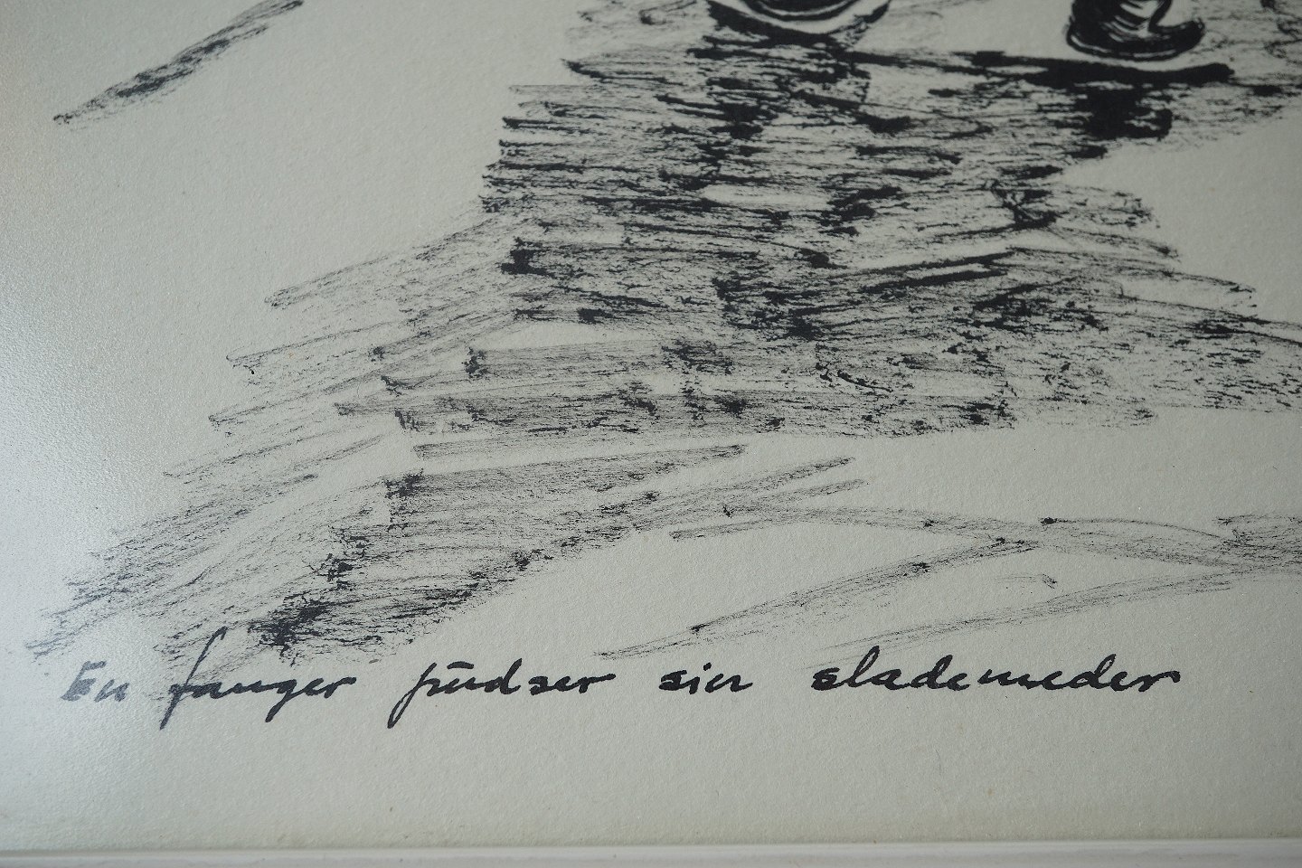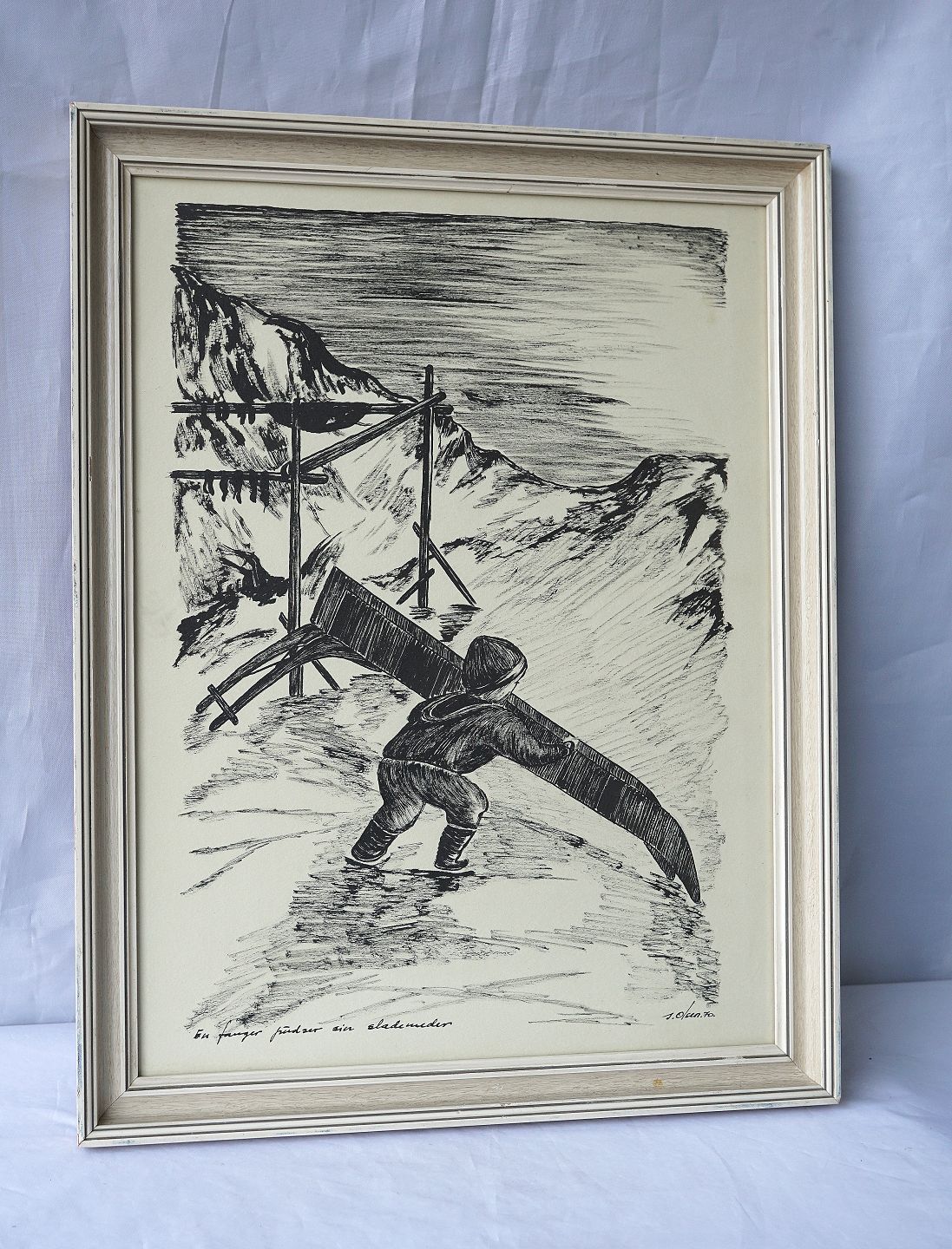 Indrammmet tryk i hvid rammer med teksten En fanger pudser sine slædemeder