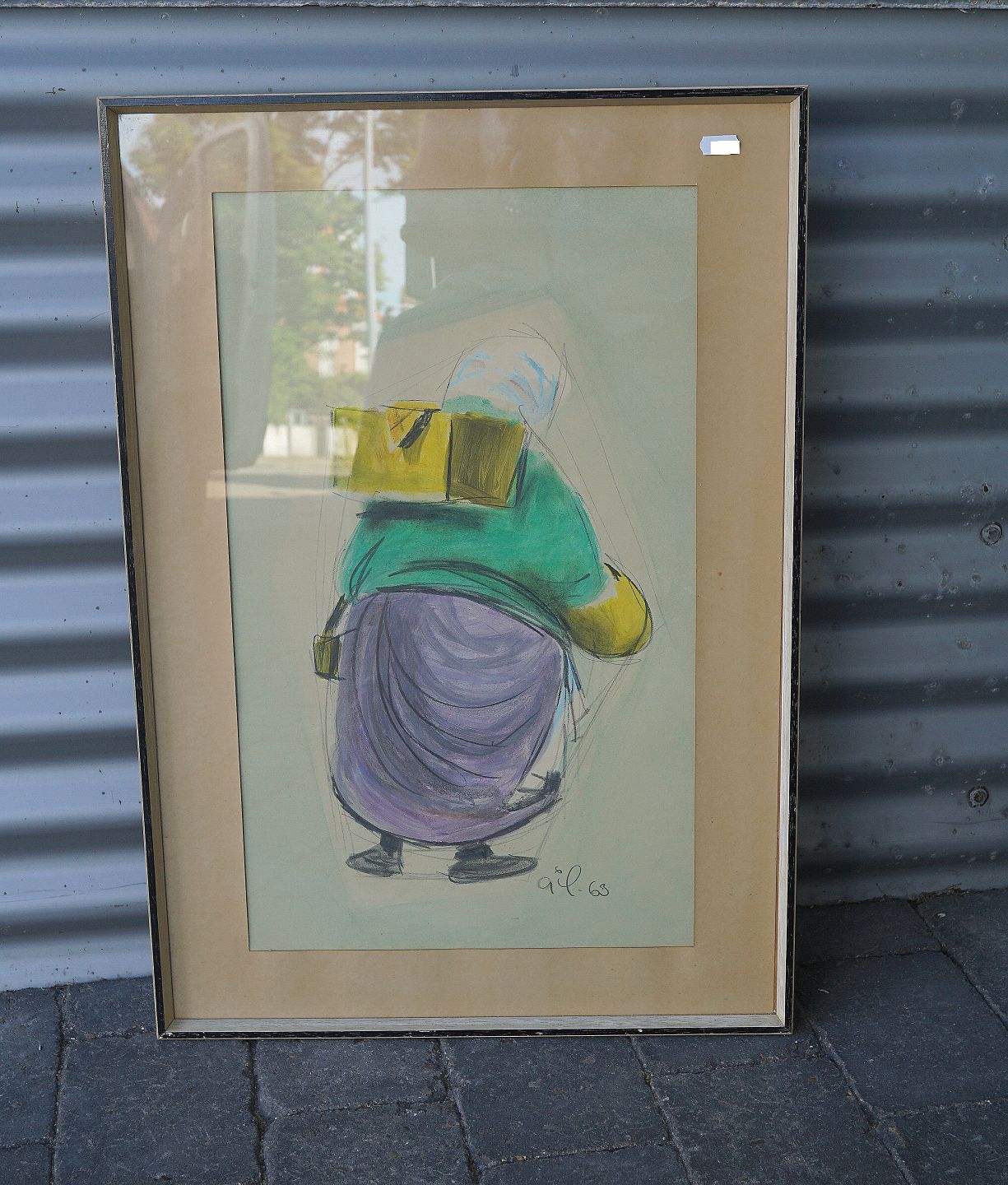 Tegning af Kvinde, set bagfra, der går med en taske på ryggen. Gil 63, karikatur