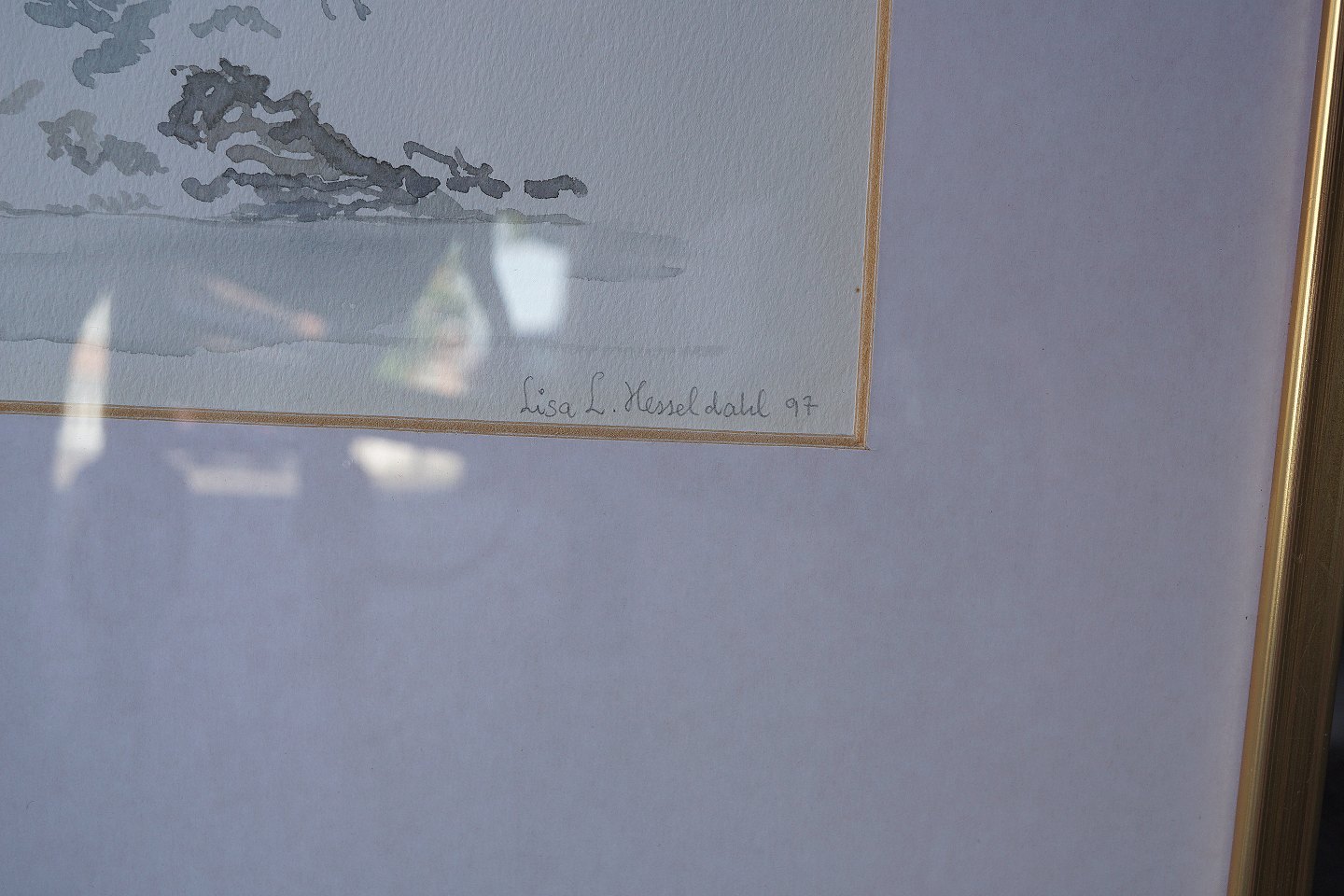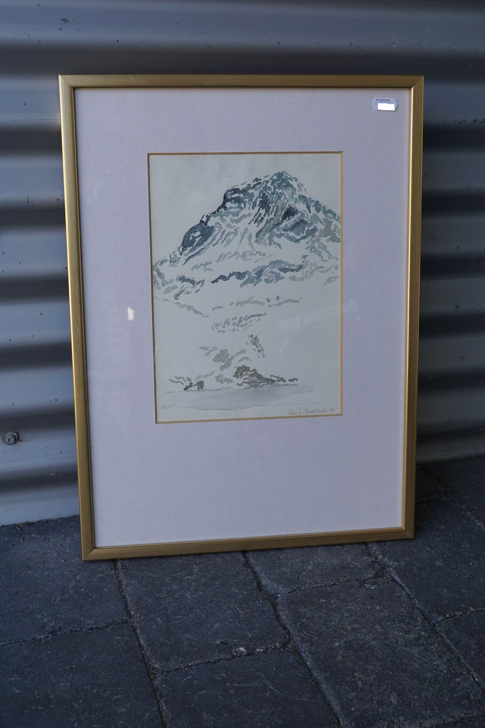 Akvarel af bjerglandskab, signeret Lise L. Hesseldahl `97.