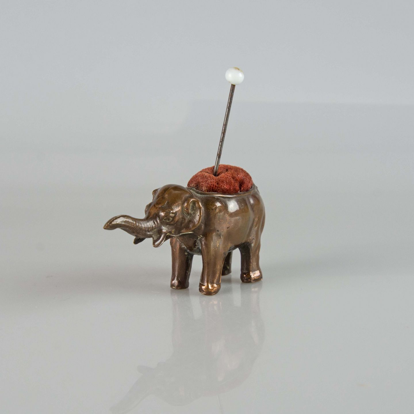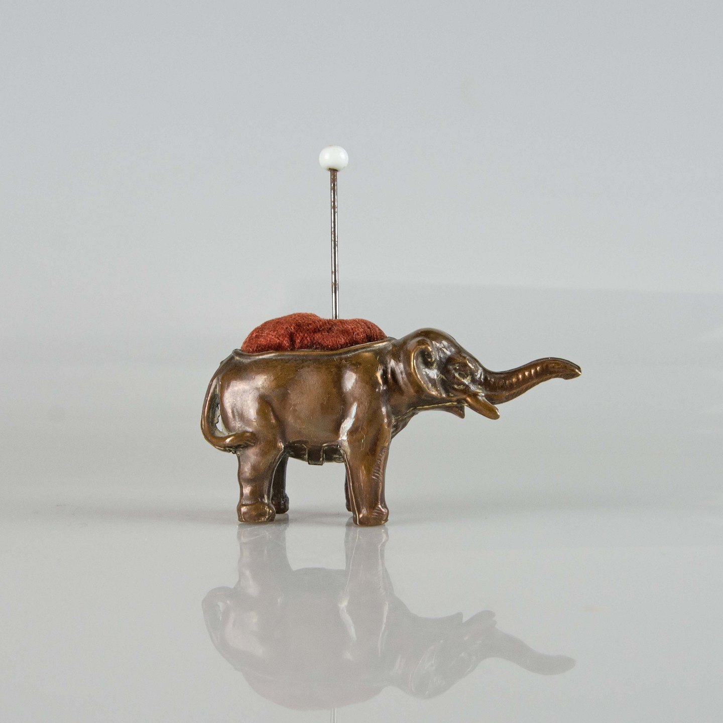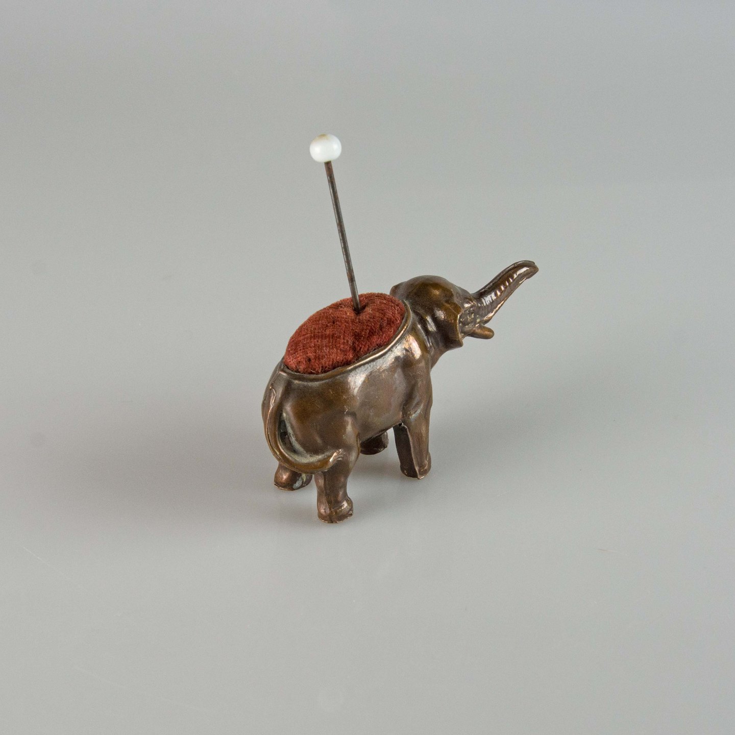 Gammel nålepude i metal med motiv af en stående elefant