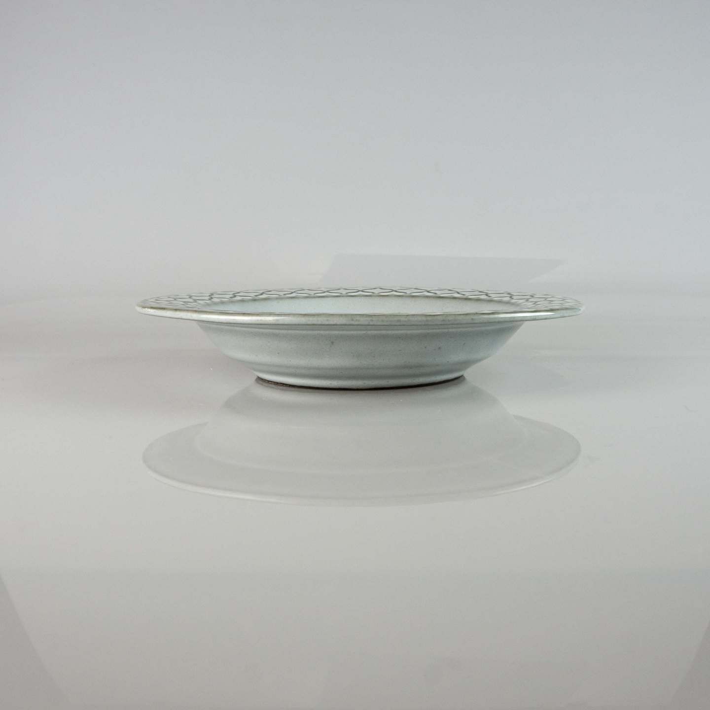 Mindre tallerken i gråt stentøj med abstrakt motiv.