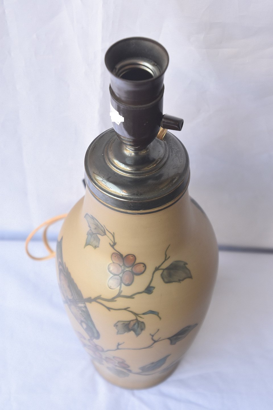 Fog & Mørup bordlampe. Dekorationen er en fugl, der sidder på en gren og spiser bær. Design L. Hjort for Fog & Mørup