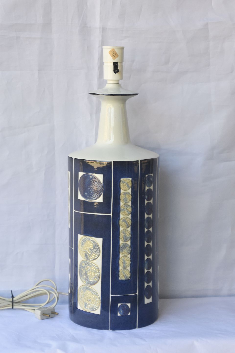 Aluminia Bordlampe E 7167, lavet for Fog & Mørup. Lampefoden er lavet af kunstfajance og blå med geometrisk mønster. Design Ingelise Kofoed for Fog & Mørup.