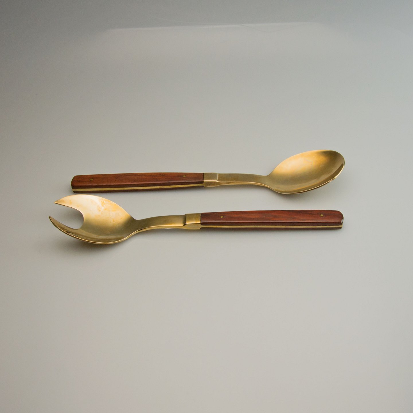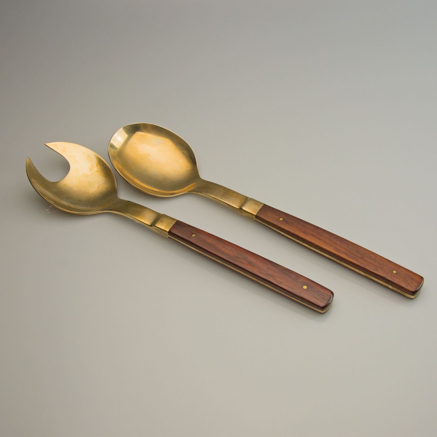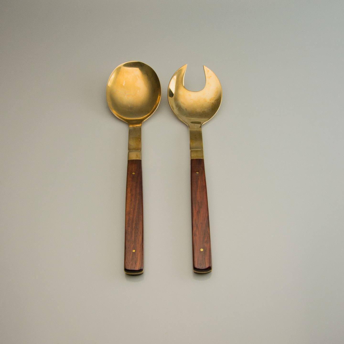 Almue salatsæt i messing med skaft af teaktræ