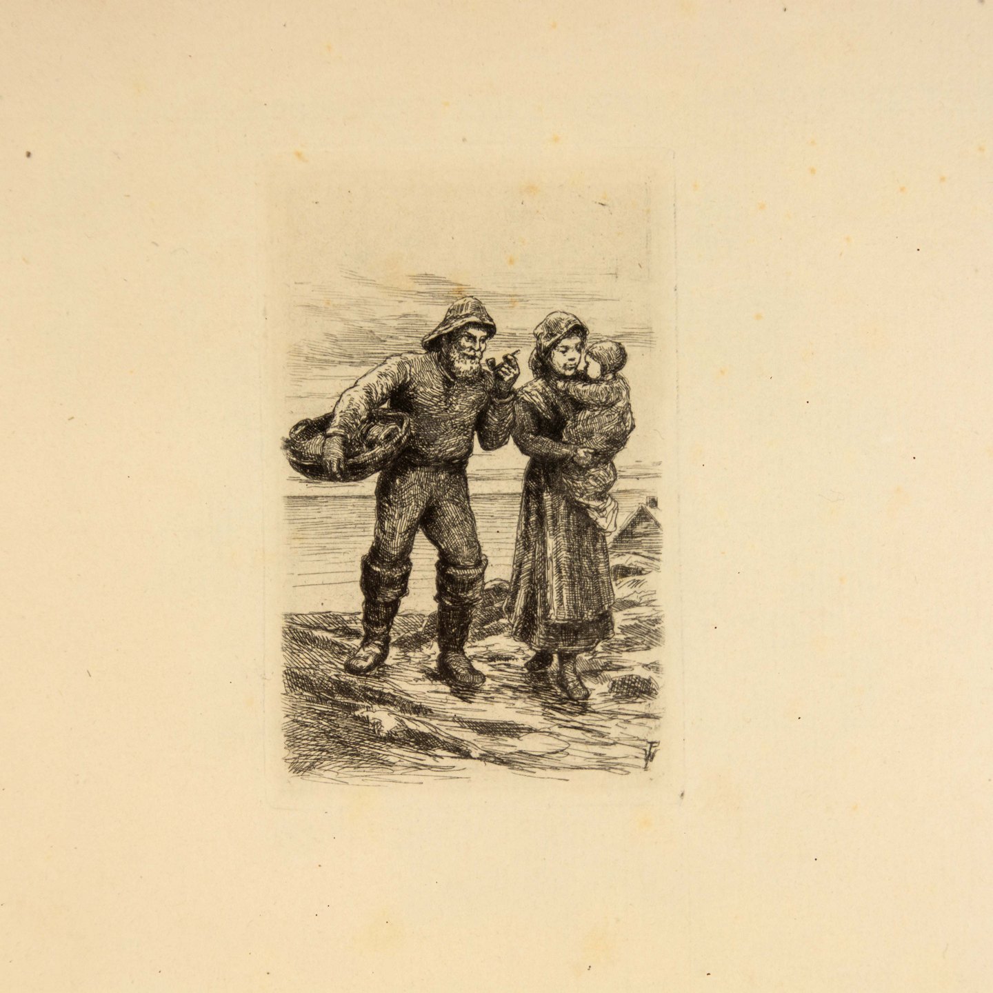 Radering med motiv af fisker og kone med barn