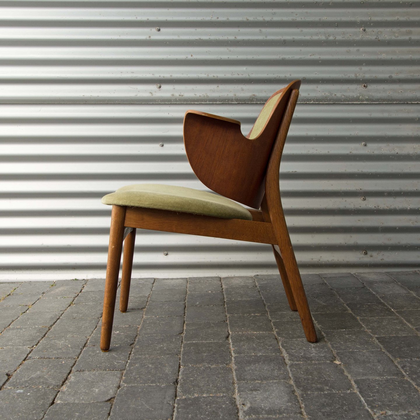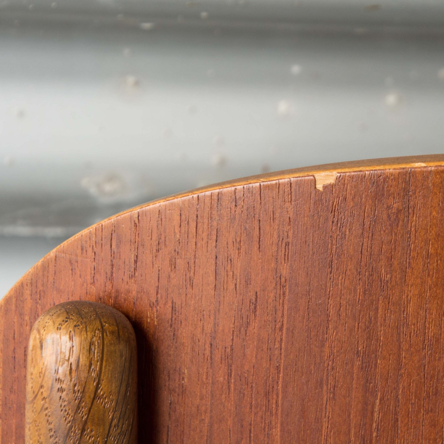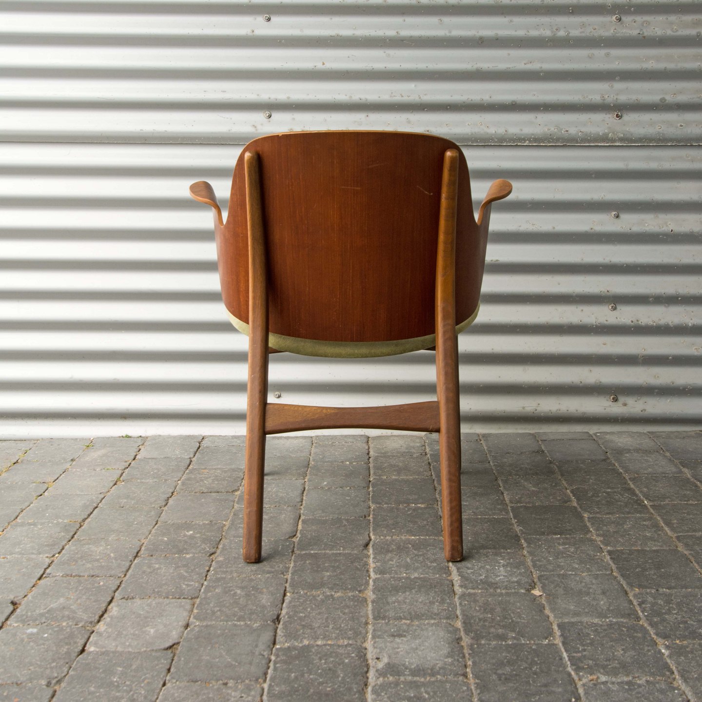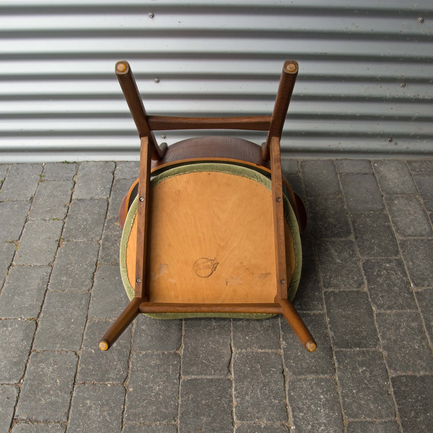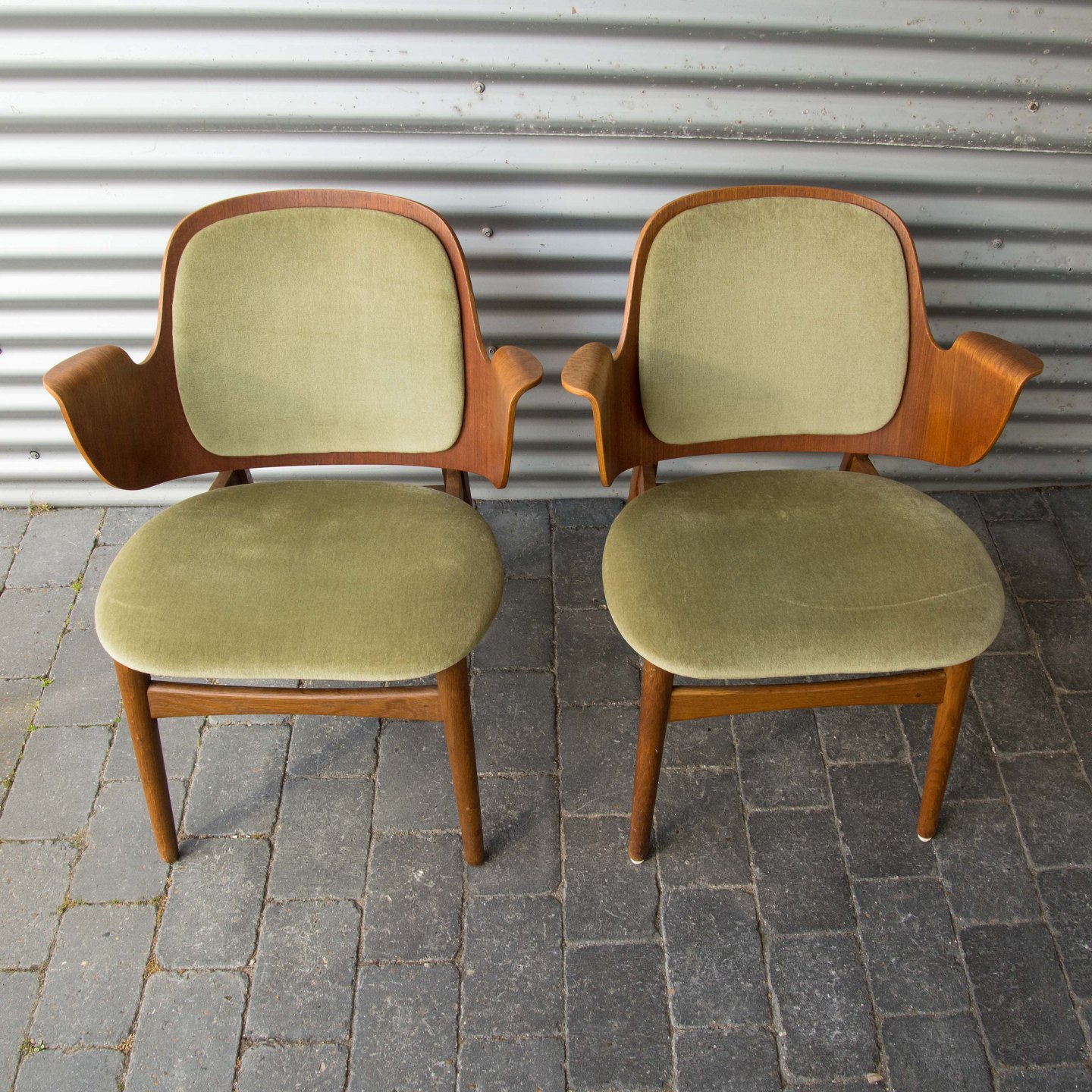 Et sæt armstole i teaktræ betrukket med flaskegrønt velour