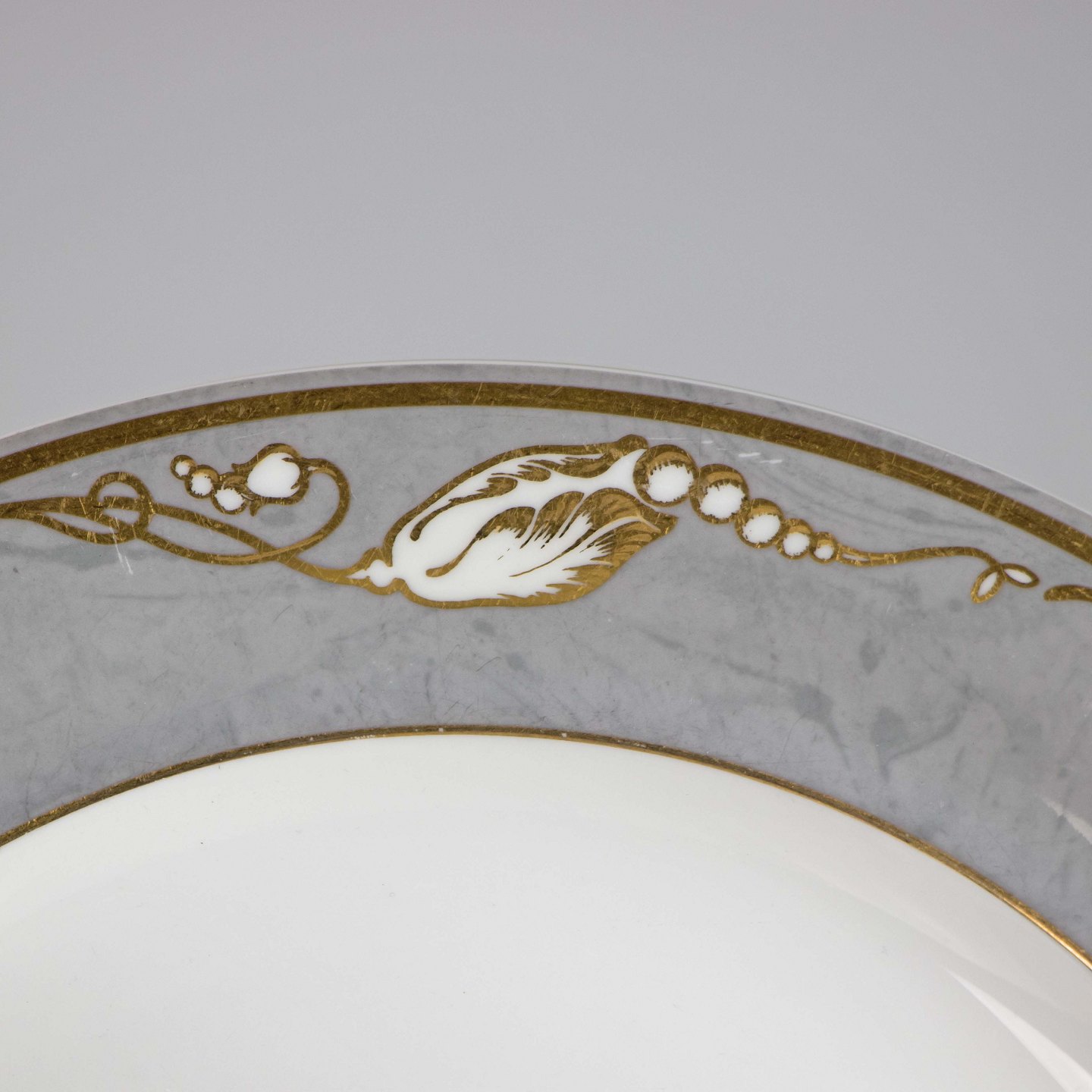 Tallerken med grå marmoret bort dekoreret med gylden blomsterknop.