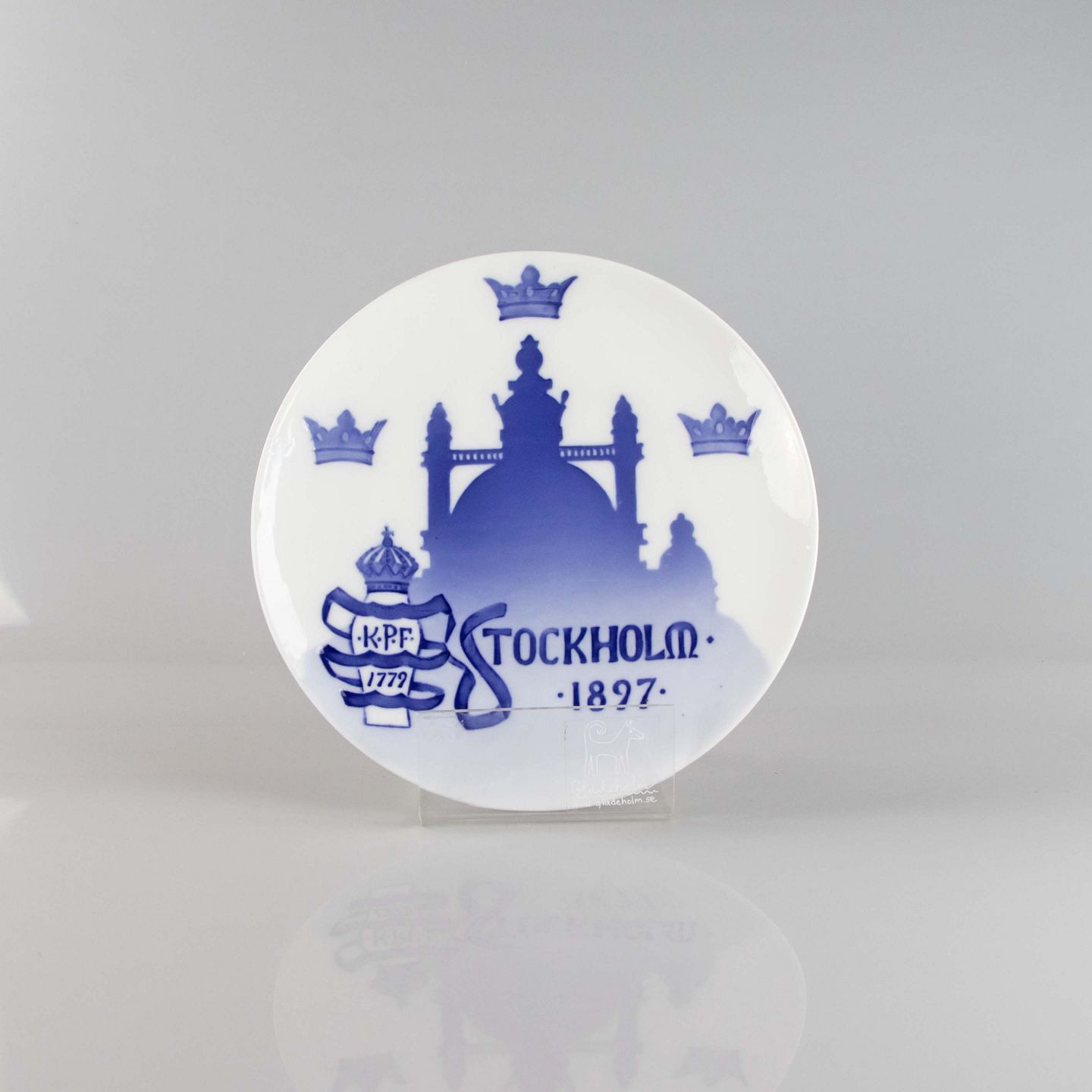Platten er fremstillet for Kunst- og industriudstillingen i Stockholm og har motiv af kuppel og tre kroner