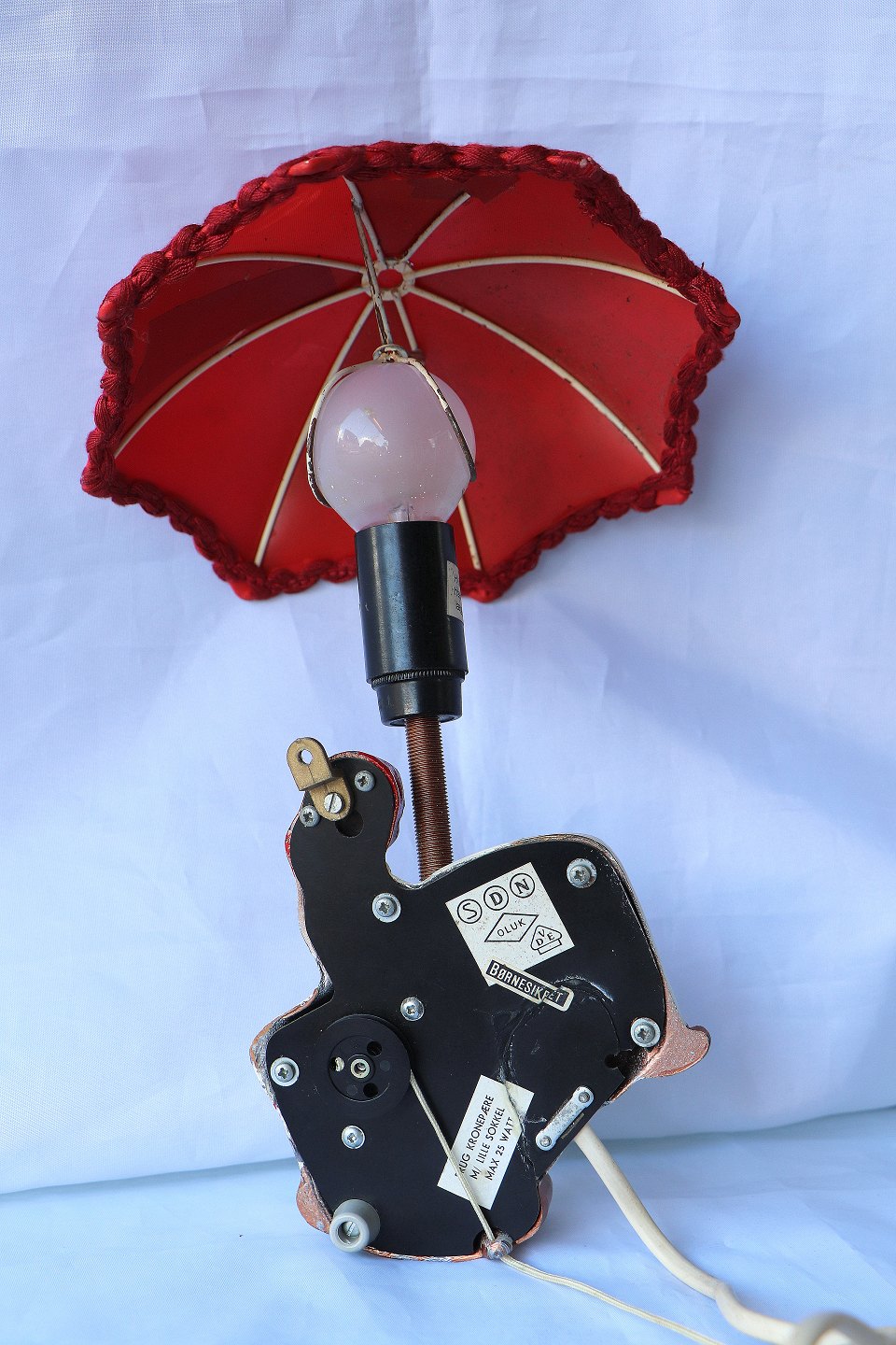 Ole Lukøje væglampe, med spilledåse. til spilledåse er der snoretræk. Lampen er cremefarvet med rød plast skærm.