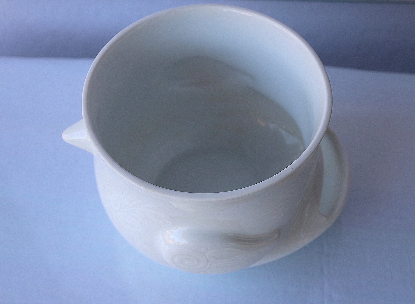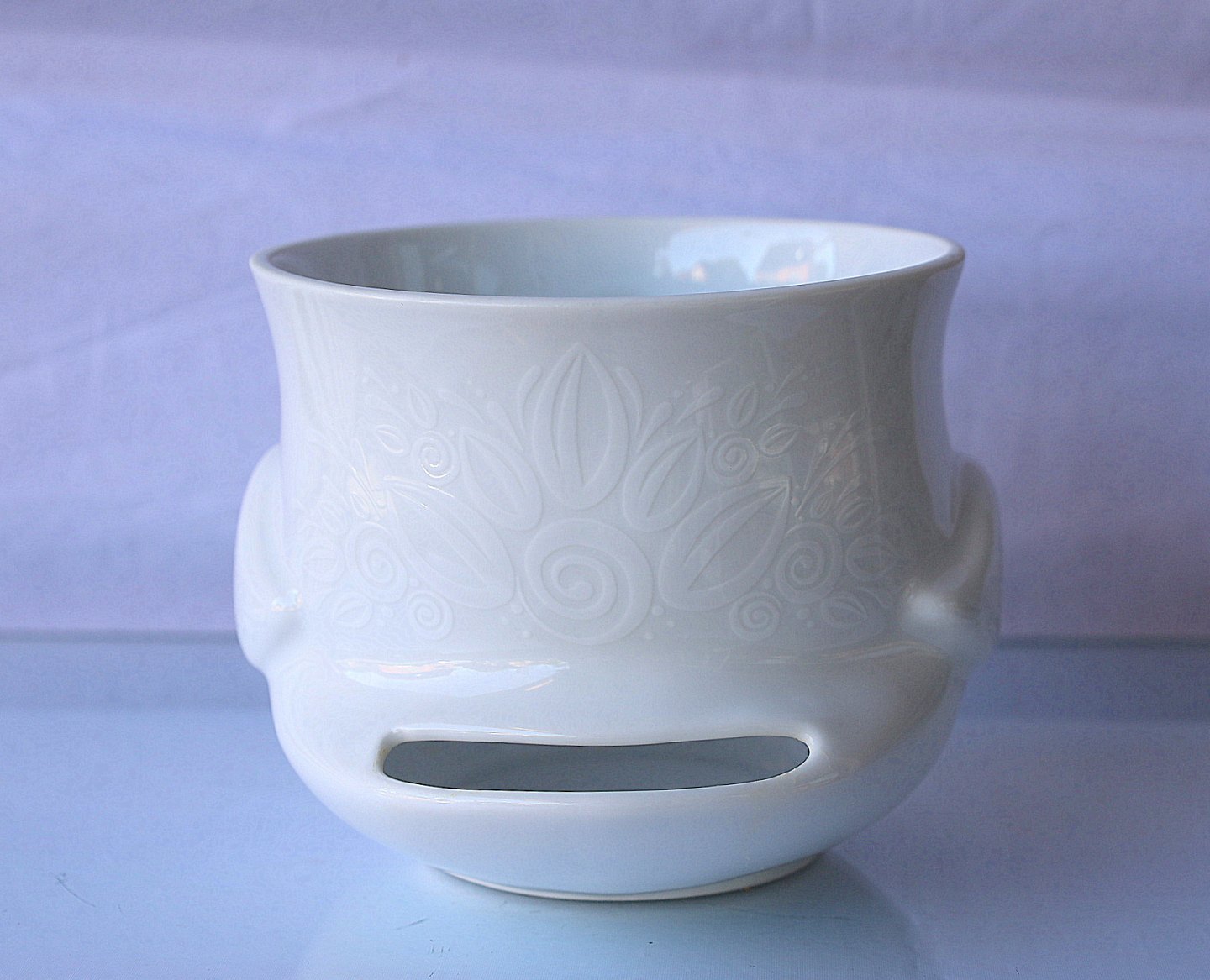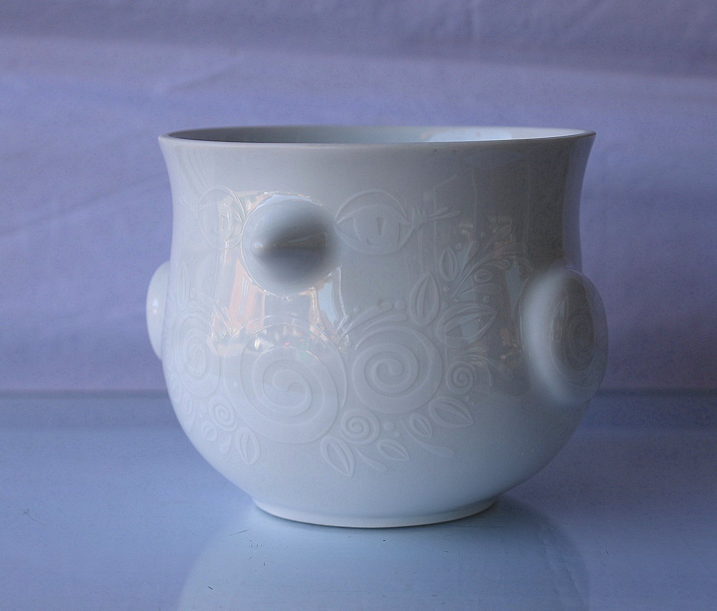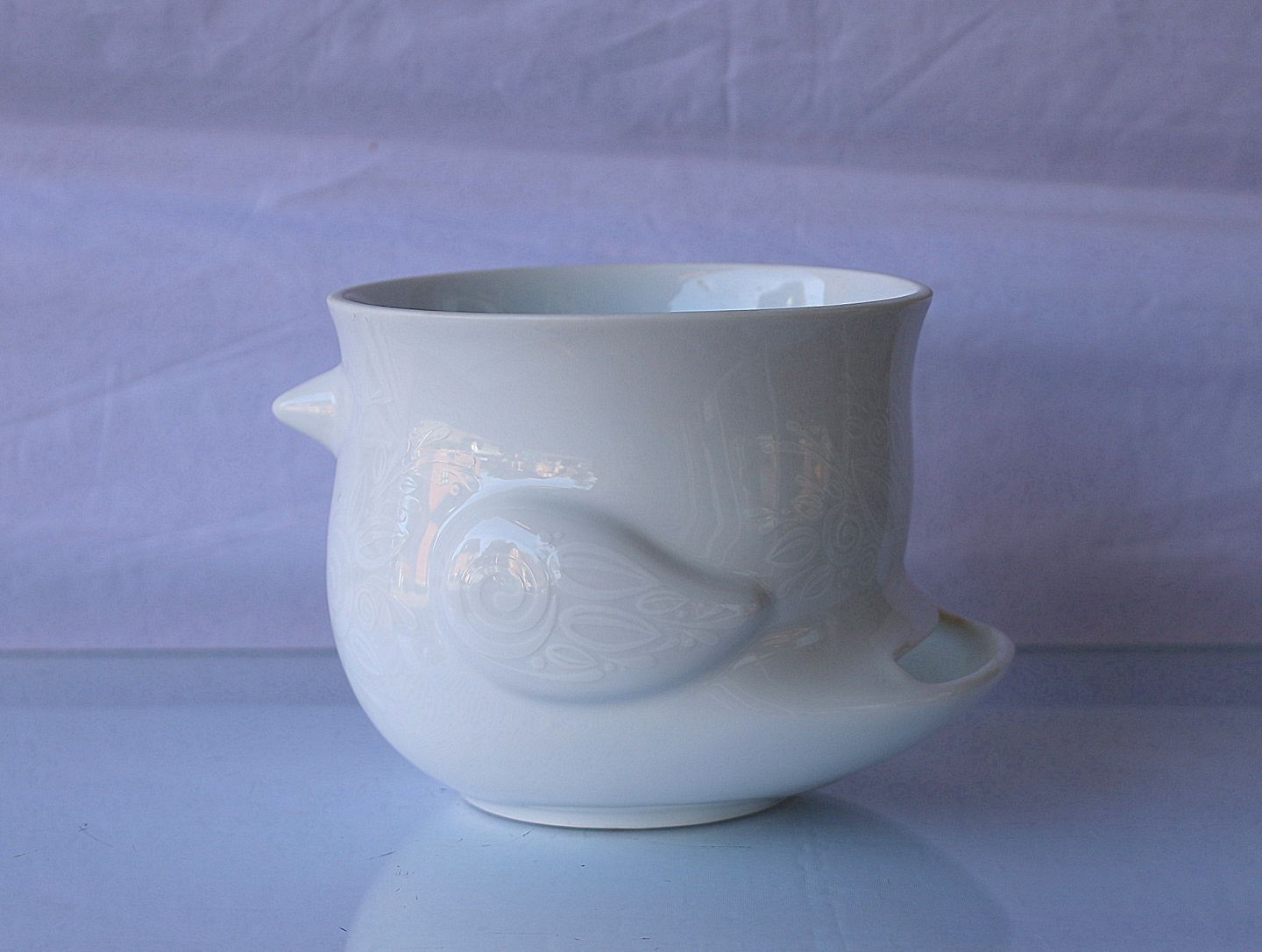 Fuglepotte i hvidt porcelæn med hvid dekoration