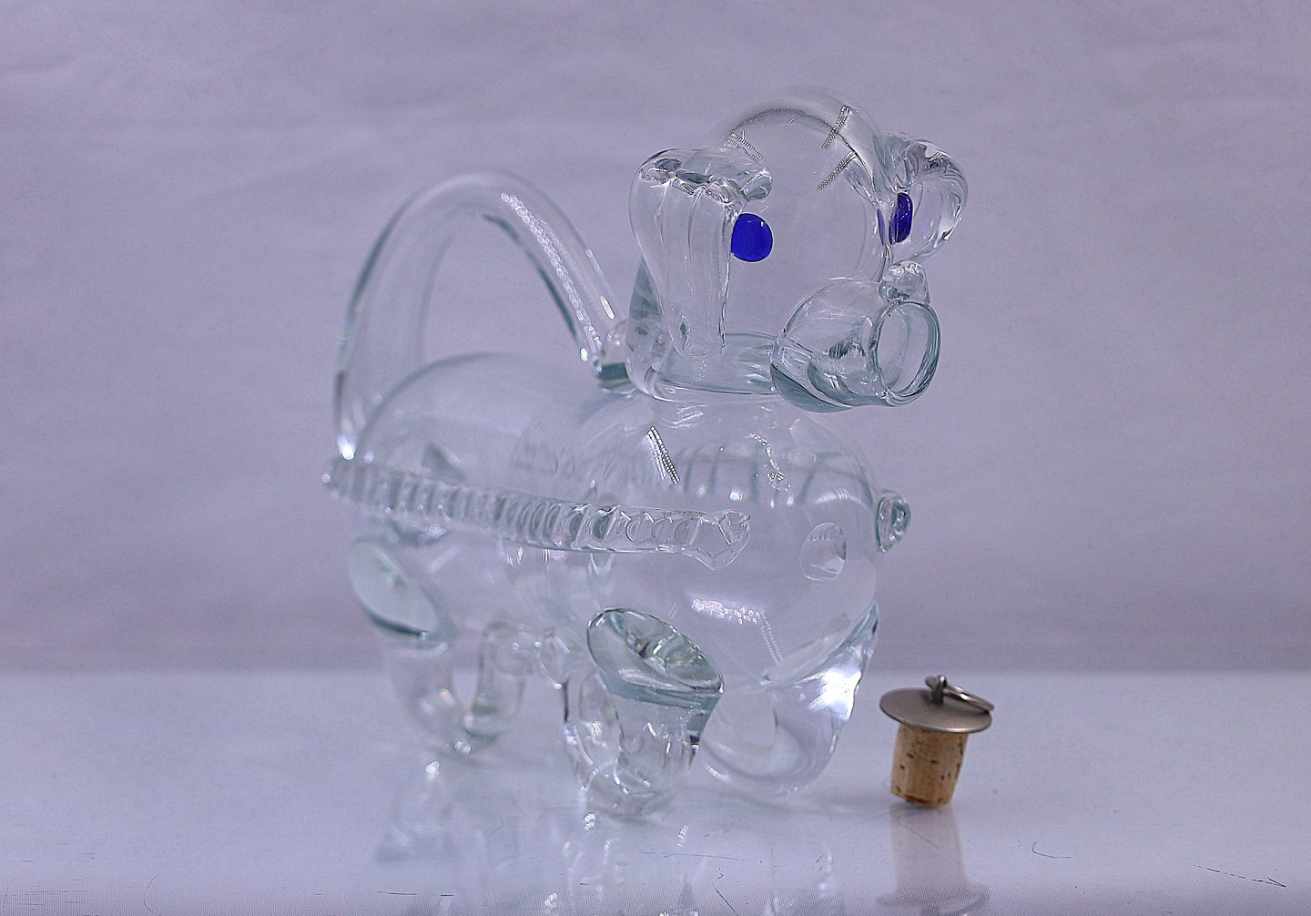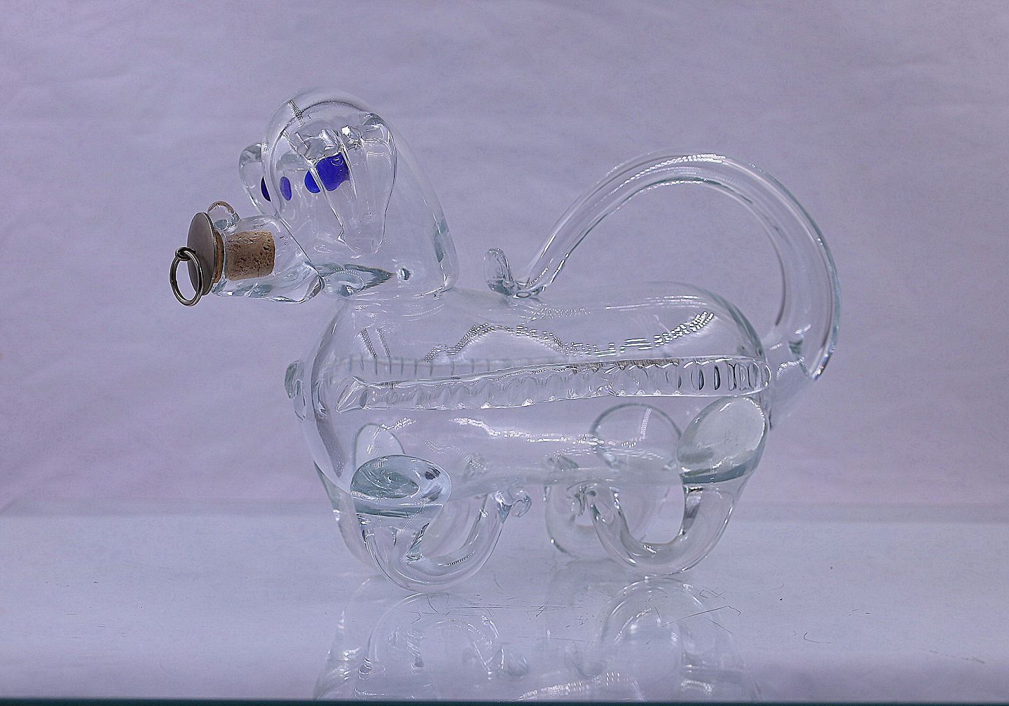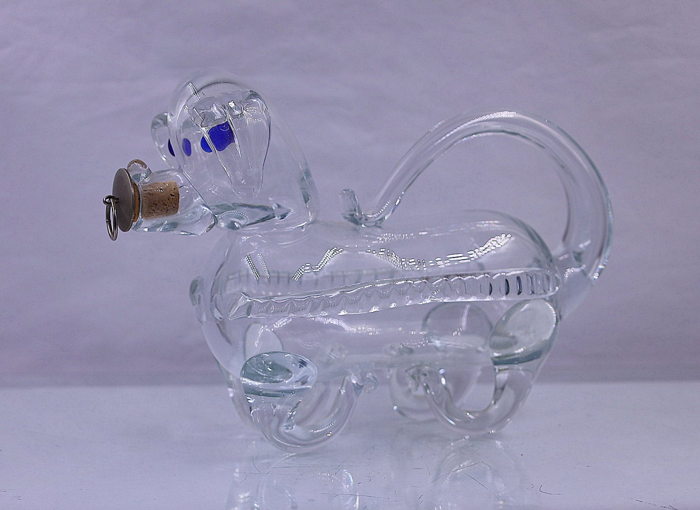 Holmegaard. Snapsehund med blå øjne og korkprop. Påsatte ører og ben. Halen, der også er påsat , fungerer som håndtag.
