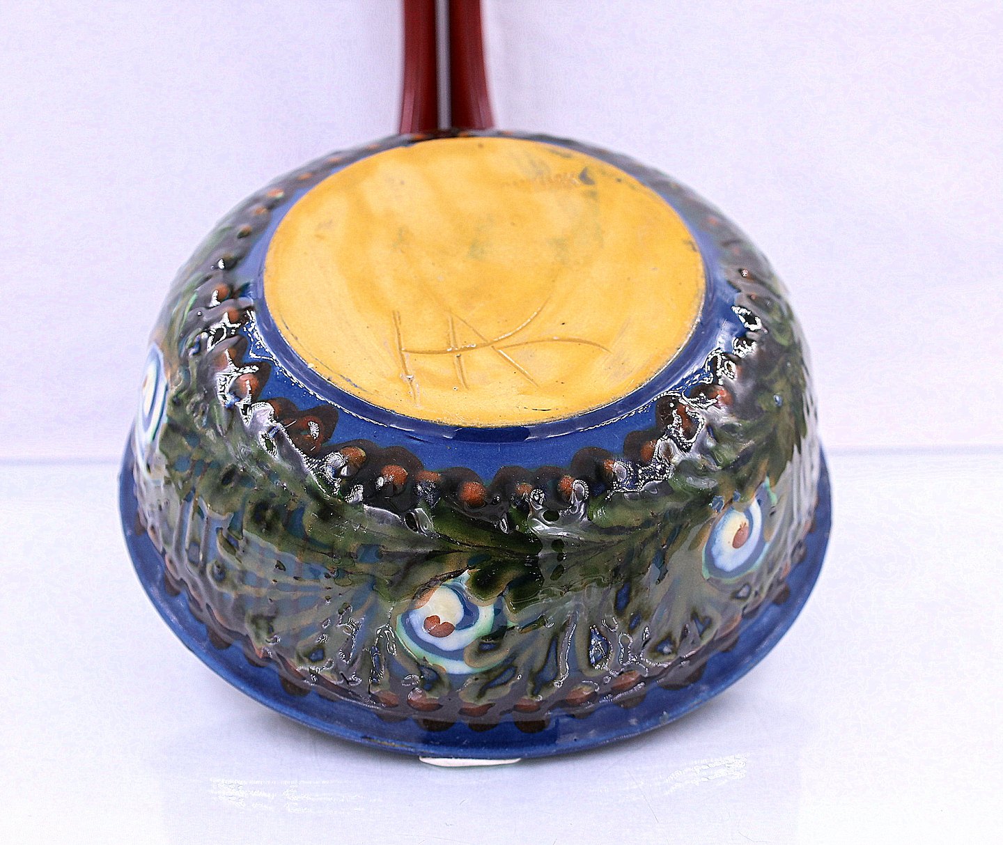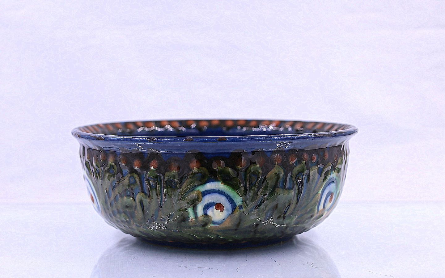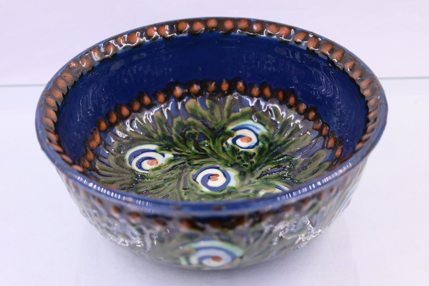 Kähler kohorns dekoreret skål, skålen er glaseret keramik. Skålen er dekoreret med hvide og blå spiraler samt grønne blade. Skålen er signeret HAK, i bunden.